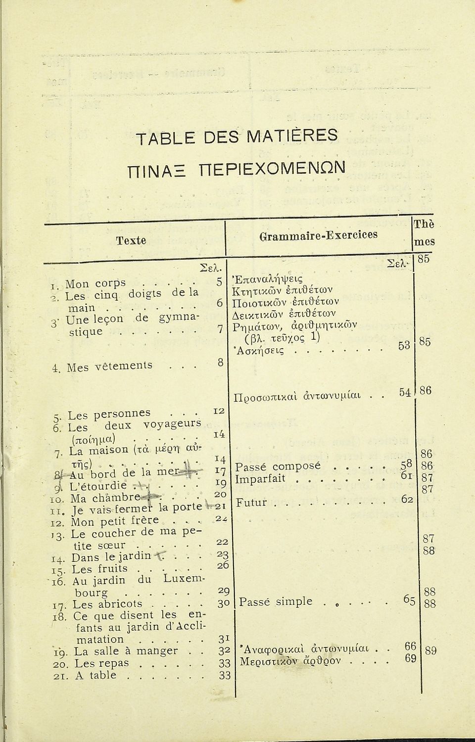 Σχολικό εγχειρίδιο Γαλλικών Γυμνασίου που περιλαμβάνει κείμενα στα γαλλικά και ελληνικά, θεωρία, λεξιλόγιο και βιογραφικά σημειώματα των συγγραφέων. Ο συγγραφέας ήταν καθηγητής της Βαρβακείου πρότυπης σχολής