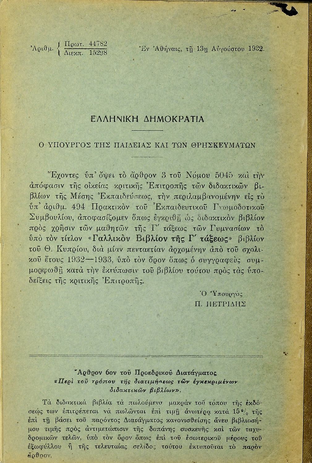 Γαλλικόν βιβλίον της Γ΄ τάξεως εγκεκριμένον υπό του υπουργείου της Παιδείας κατά τον Νόμον 5045 διά την πενταετίαν 1932-1937 διά την Γ΄ τάξιν των Εξαταξίων Γυμνασίων και τας αντιστοίχους τάξεις των λοιπών σχολείων της Μέσης Εκπαιδεύσεως