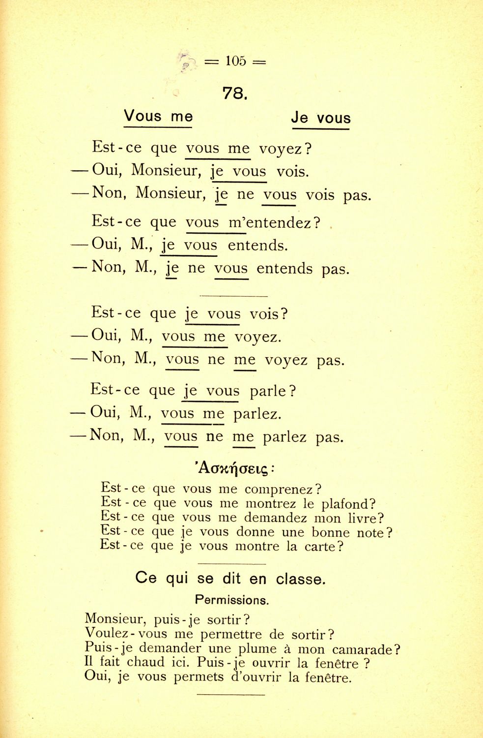 Σχολικό εγχειρίδιο Γαλλικών Β΄ και Γ' Ελληνικού Σχολείου, Αστικού Σχολείου και Παρθεναγωγείου που περιλαμβάνει κείμενα, κανόνες γραμματικής και συντακτικού, ερωτήσεις και ασκήσεις κατανόησης, και λεξιλογικά ...