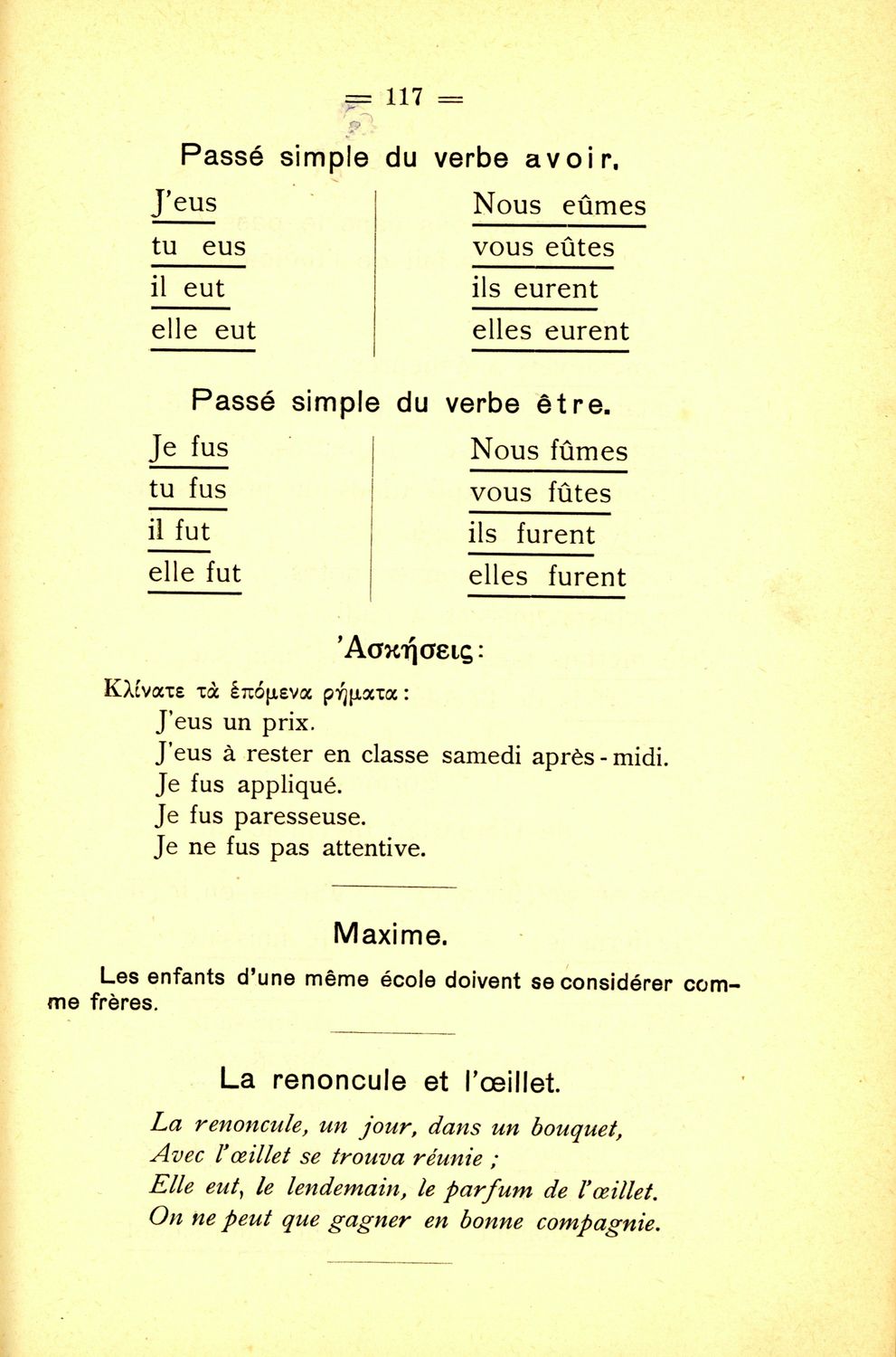 Γραμματική της Γαλλικής γλώσσας για τα Τετρατάξια Γυμνάσια, τη Γ΄ τάξη των Αστικών Σχολείων των Θηλέων και τα Διδασκαλεία της Δημοτικής Εκπαίδευσης που περιλαμβάνει θεωρία, ασκήσεις και λεξιλόγιο.