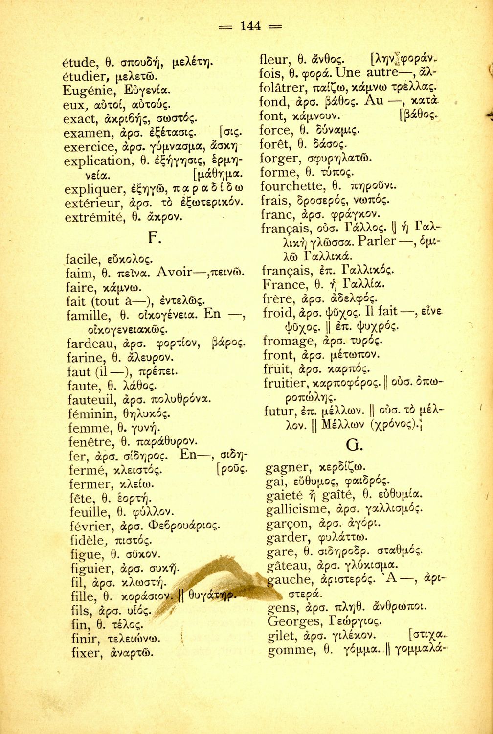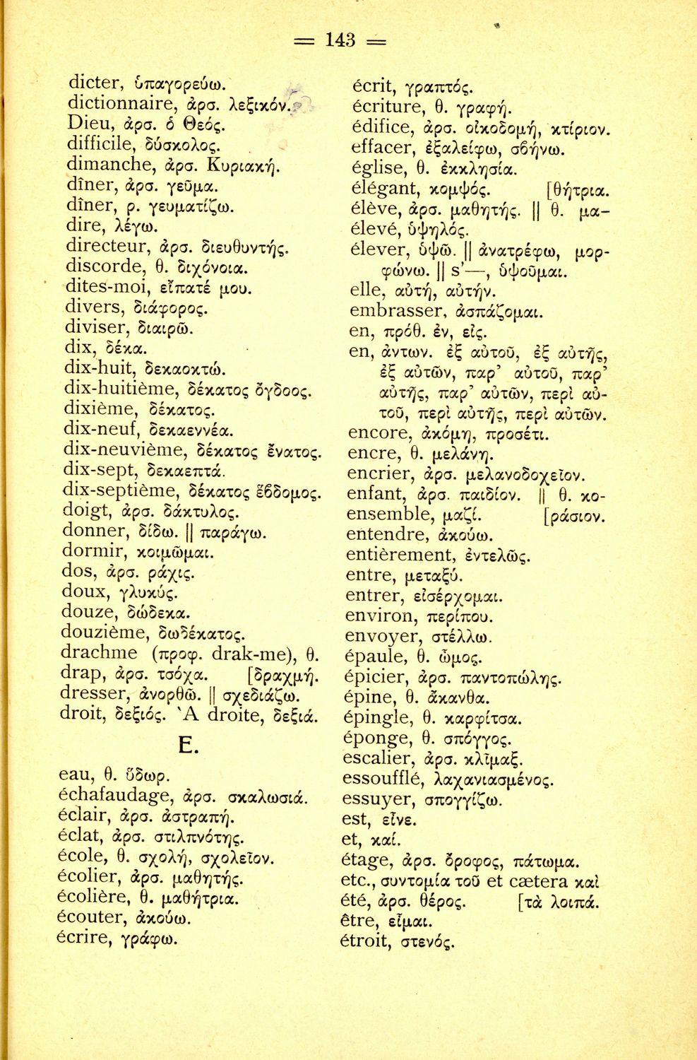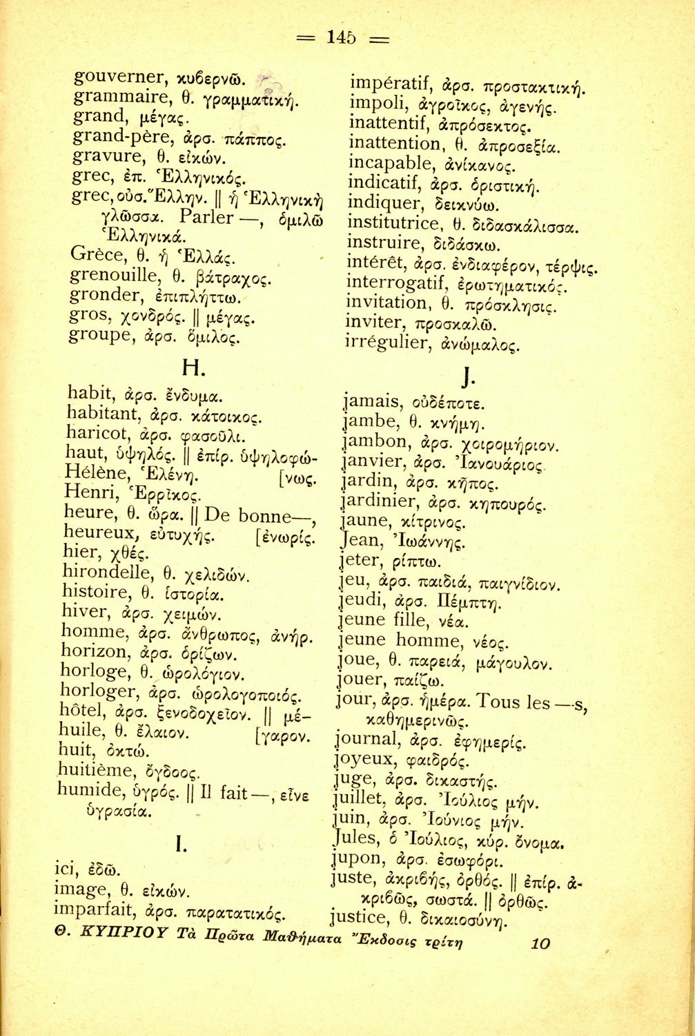 Γραμματική της Γαλλικής γλώσσας για τα Τετρατάξια Γυμνάσια, τη Γ΄ τάξη των Αστικών Σχολείων των Θηλέων και τα Διδασκαλεία της Δημοτικής Εκπαίδευσης που περιλαμβάνει θεωρία, ασκήσεις και λεξιλόγιο.