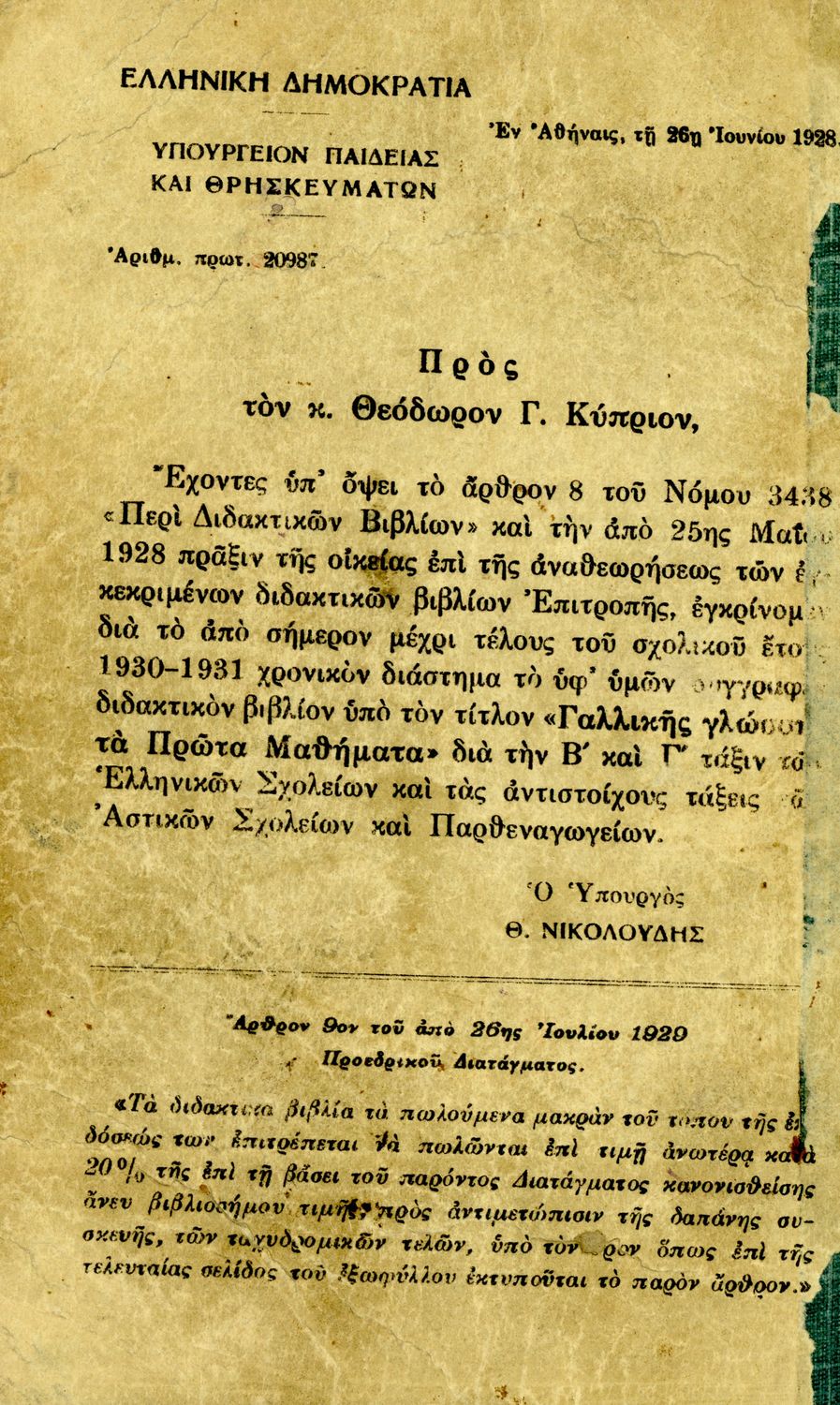 Τίτλος: Γαλλικής γλώσσης τα πρώτα μαθήματα διά την Β΄ και Γ΄ τάξιν των Ελληνικών Σχολείων και τας αντιστοίχους τάξεις των Αστικών Σχολείων και Παρθεναγωγείων
