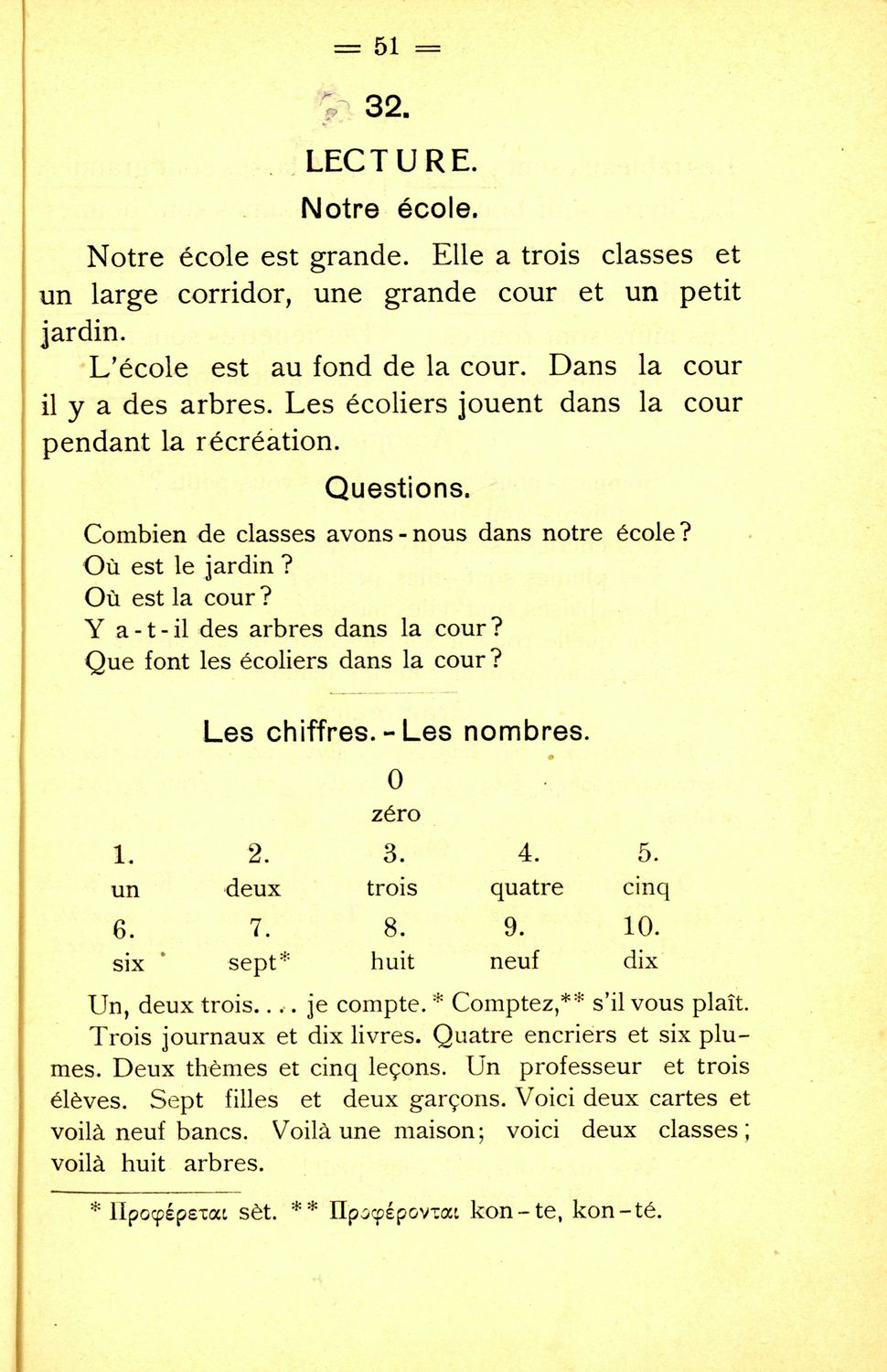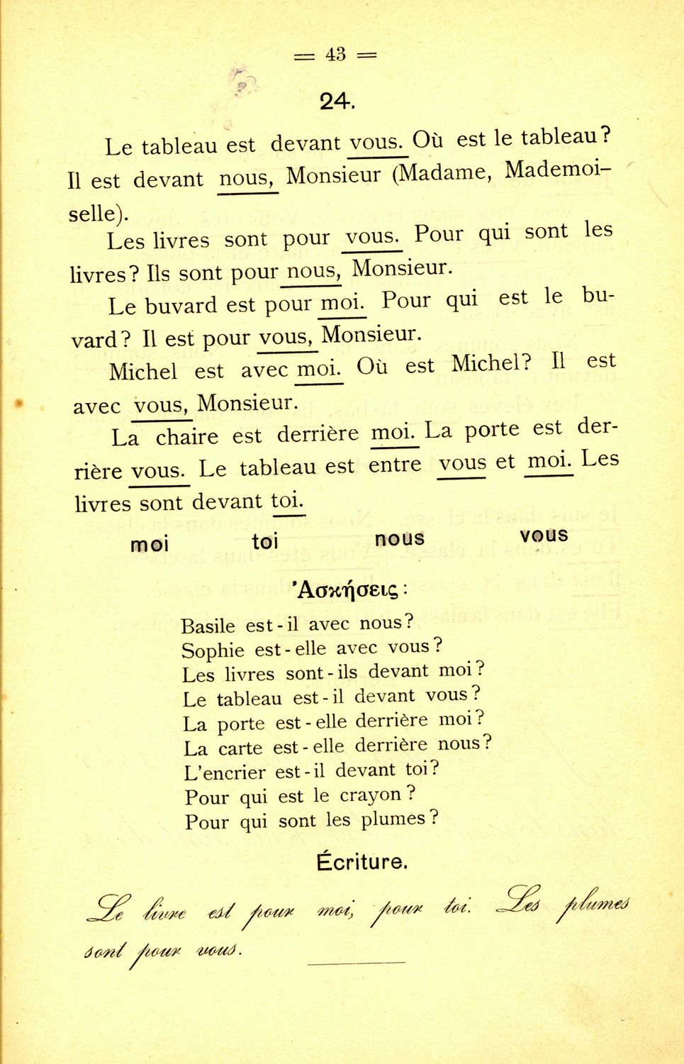 Σχολικό εγχειρίδιο Γαλλικών Β΄ και Γ' Ελληνικού Σχολείου, Αστικού Σχολείου και Παρθεναγωγείου που περιλαμβάνει κείμενα, κανόνες γραμματικής και συντακτικού, ερωτήσεις και ασκήσεις κατανόησης, και λεξιλογικά ...