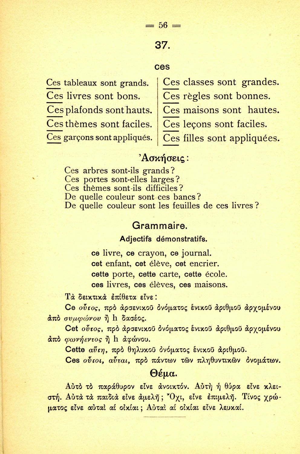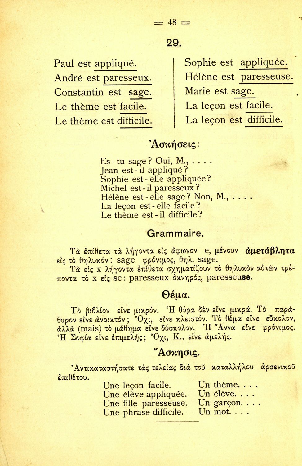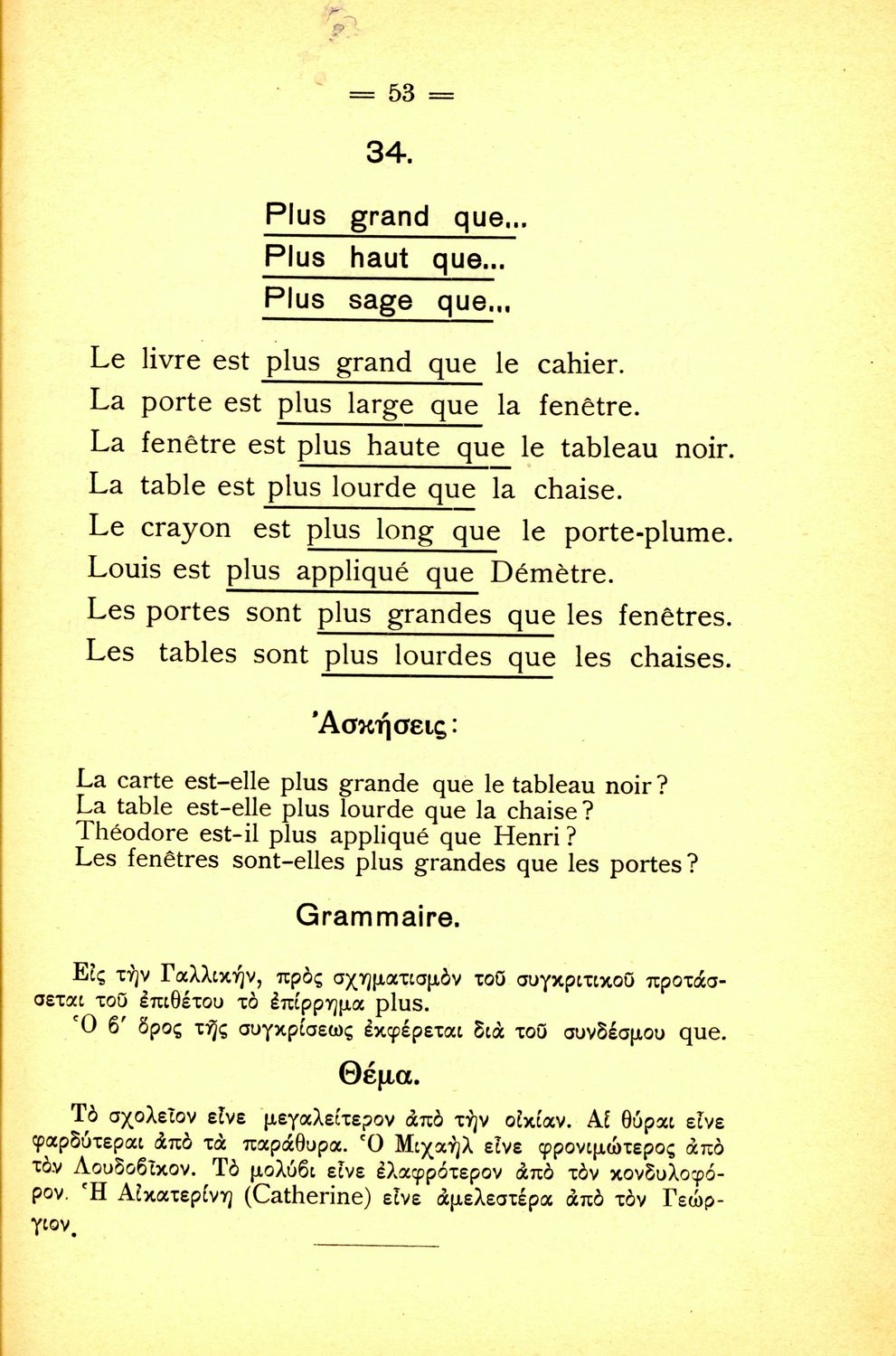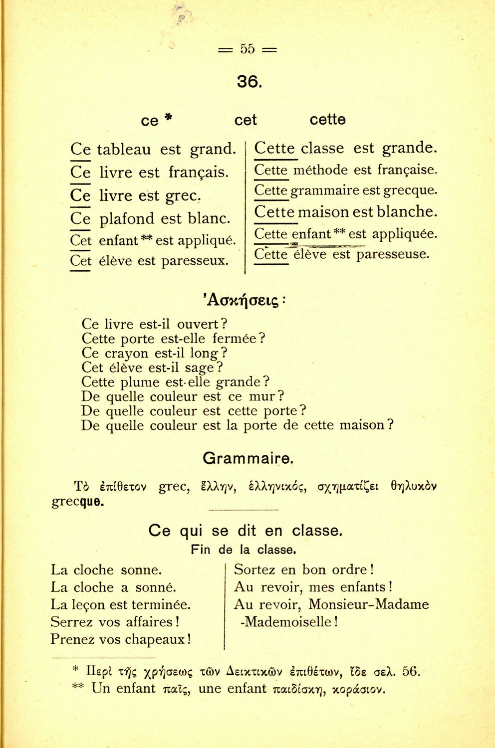 Γραμματική της Γαλλικής γλώσσας για τα Τετρατάξια Γυμνάσια, τη Γ΄ τάξη των Αστικών Σχολείων των Θηλέων και τα Διδασκαλεία της Δημοτικής Εκπαίδευσης που περιλαμβάνει θεωρία, ασκήσεις και λεξιλόγιο.