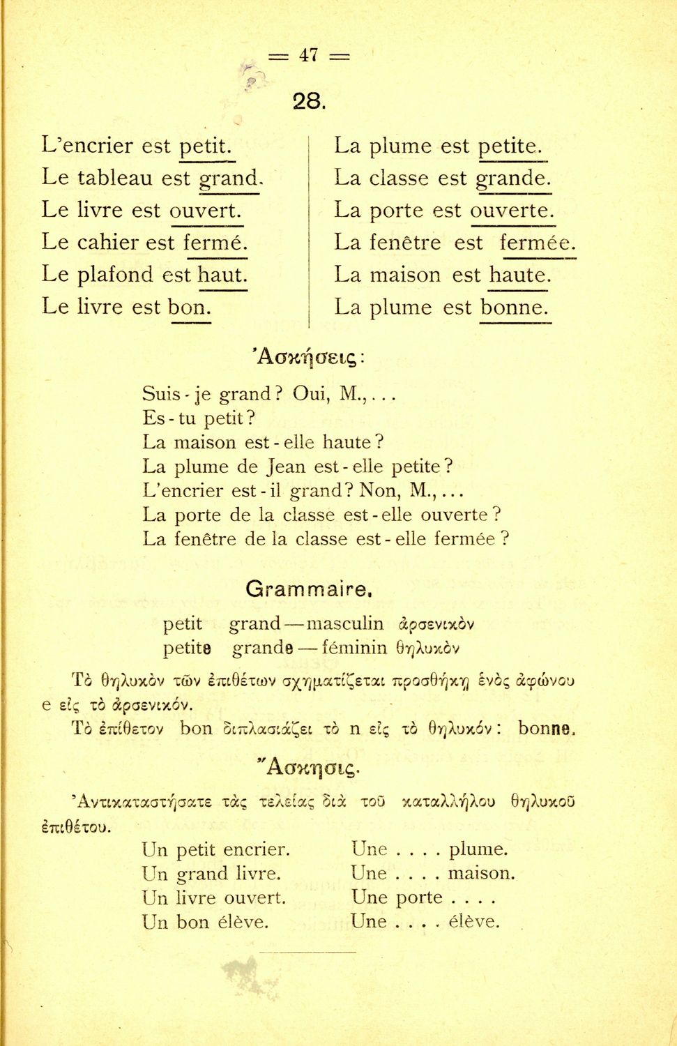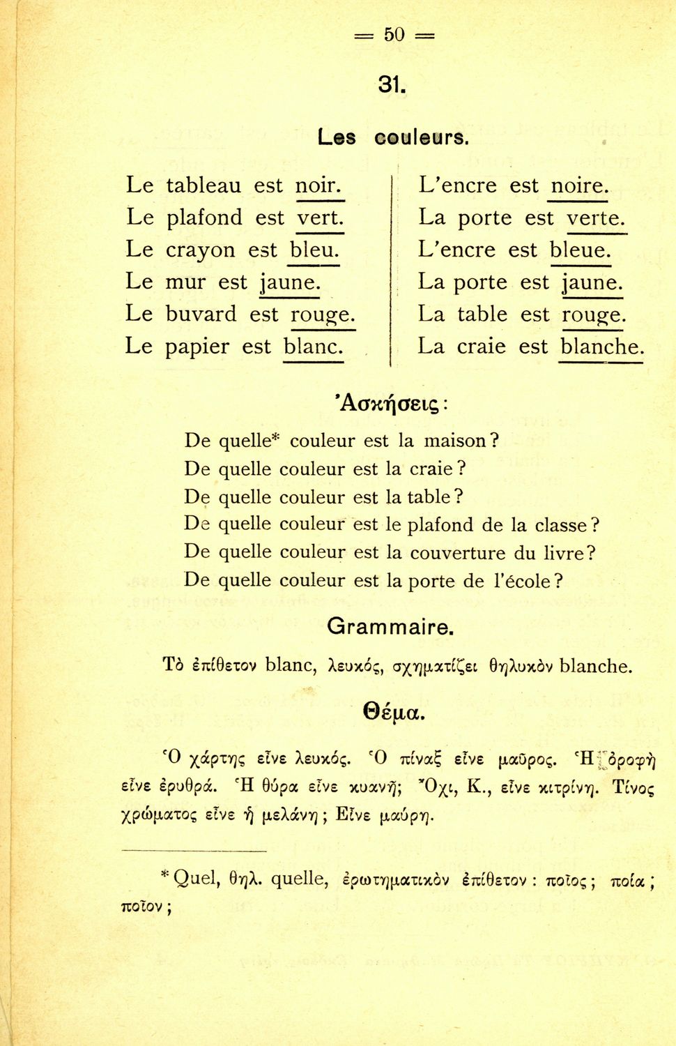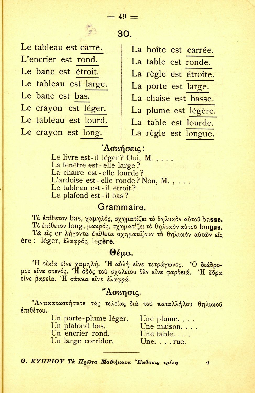 Γραμματική της Γαλλικής γλώσσας για τα Τετρατάξια Γυμνάσια, τη Γ΄ τάξη των Αστικών Σχολείων των Θηλέων και τα Διδασκαλεία της Δημοτικής Εκπαίδευσης που περιλαμβάνει θεωρία, ασκήσεις και λεξιλόγιο.