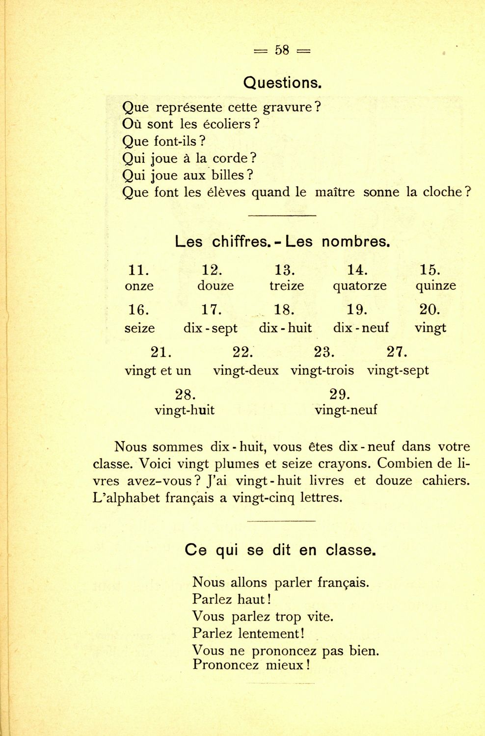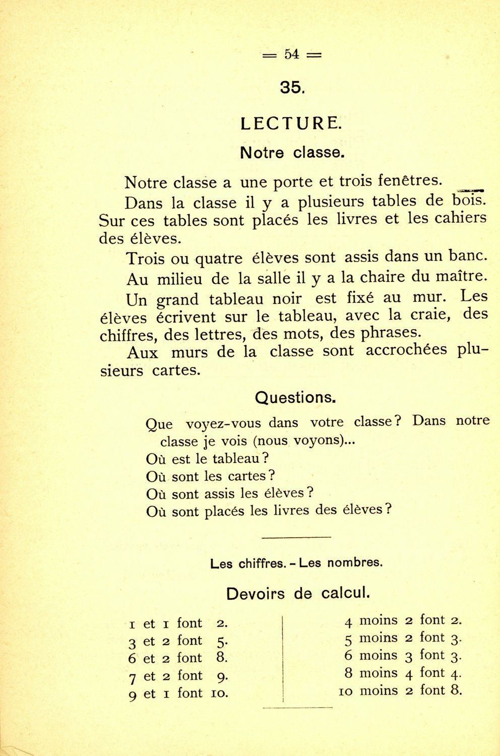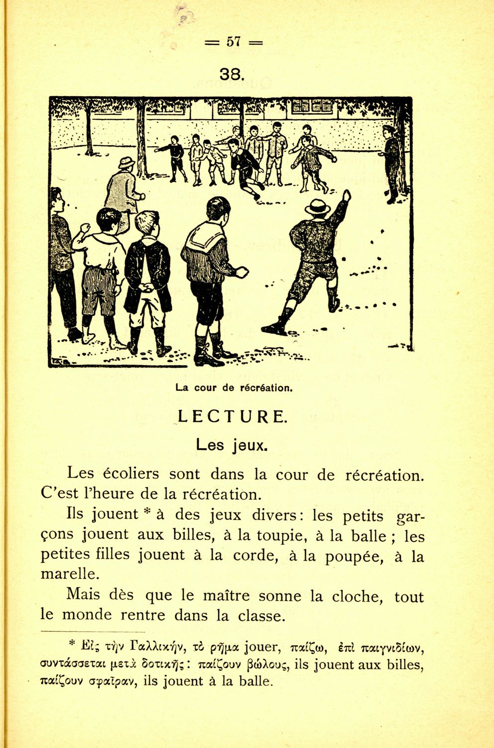 Σχολικό εγχειρίδιο Γαλλικών για τις Β΄ και Γ΄ των Ελληνικών και Αστικών Σχολείων και Παρθεναγωγείων που περιλαμβάνει εισαγωγικά μαθήματα στη γαλλική γλώσσα και εστιάζει στη διδασκαλία του γαλλικού αλφαβήτου και στην ανάγνωση και κατανόηση απλών κειμένων. Περιέχει γαλλοελληνικό λεξικό και λεξιλόγιο.
