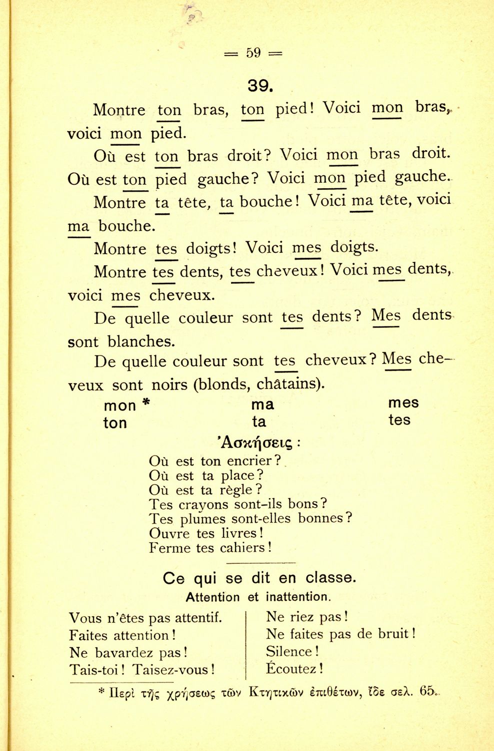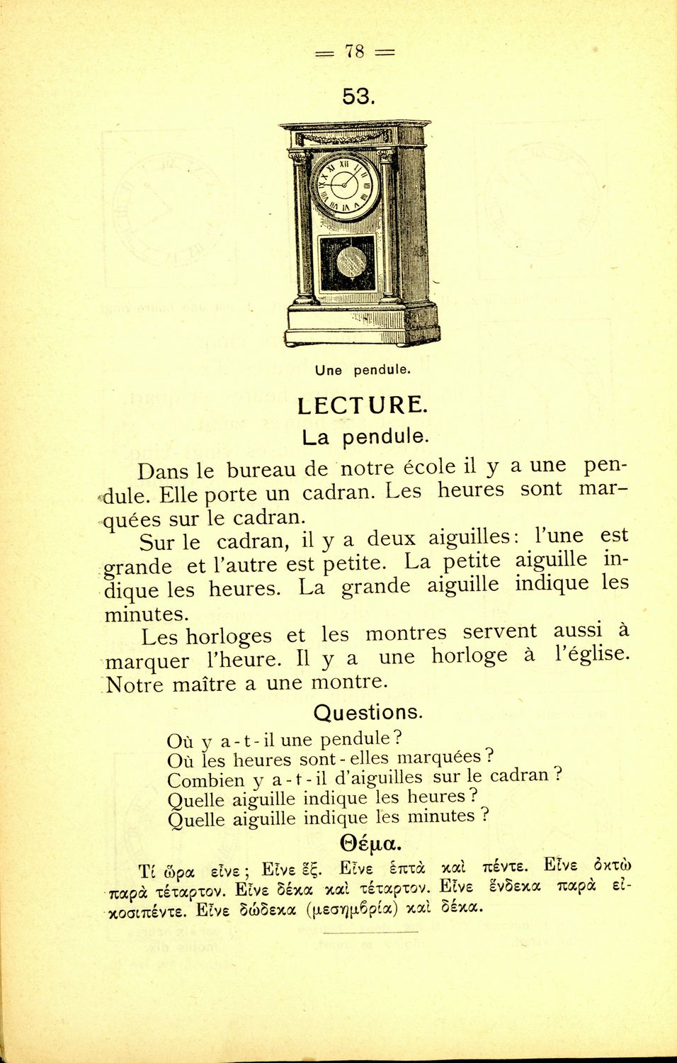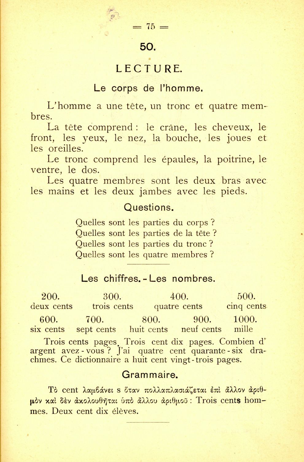 Σχολικό εγχειρίδιο Γαλλικών Β΄ και Γ' Ελληνικού Σχολείου, Αστικού Σχολείου και Παρθεναγωγείου που περιλαμβάνει κείμενα, κανόνες γραμματικής και συντακτικού, ερωτήσεις και ασκήσεις κατανόησης, και λεξιλογικά ...