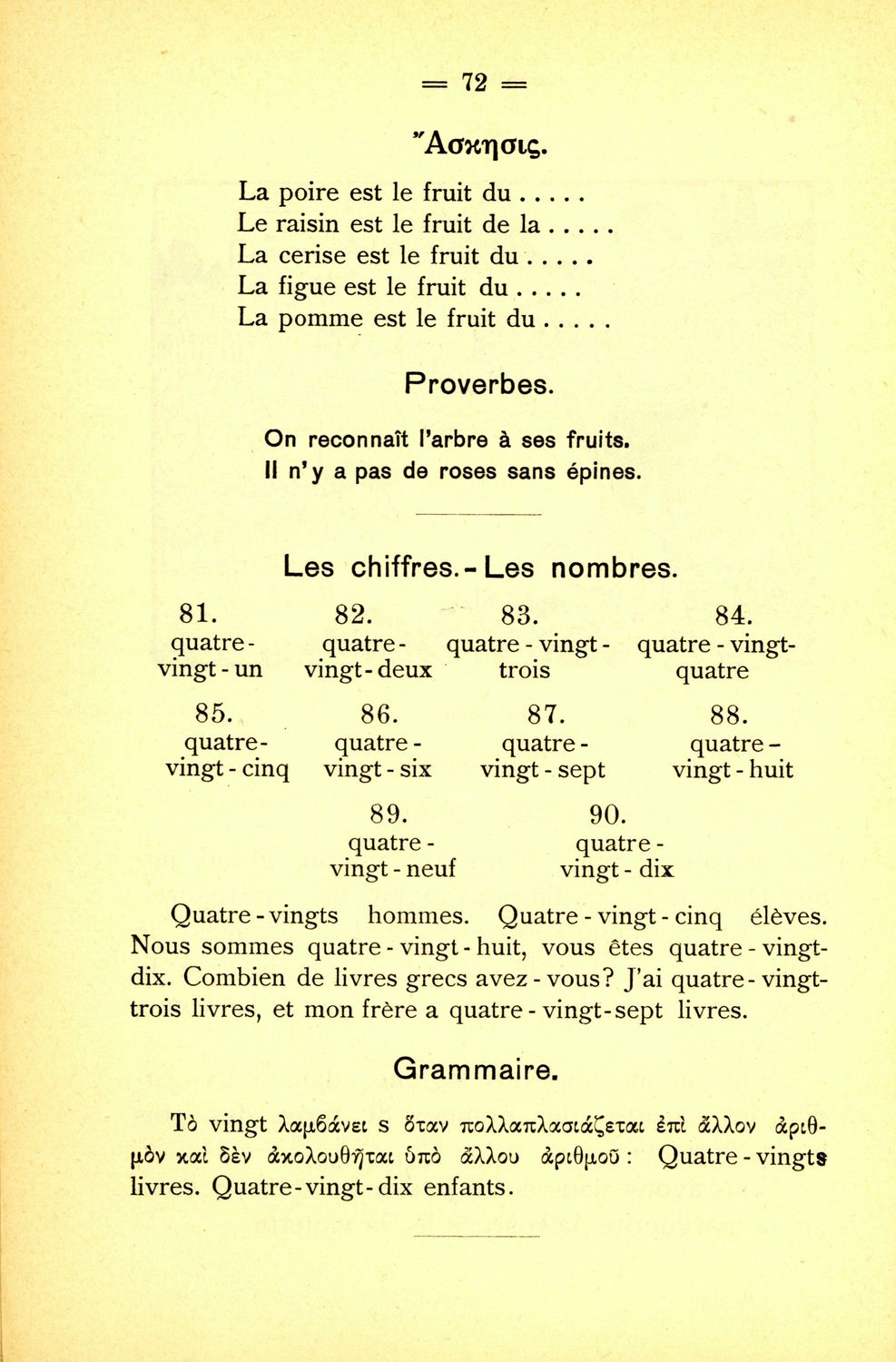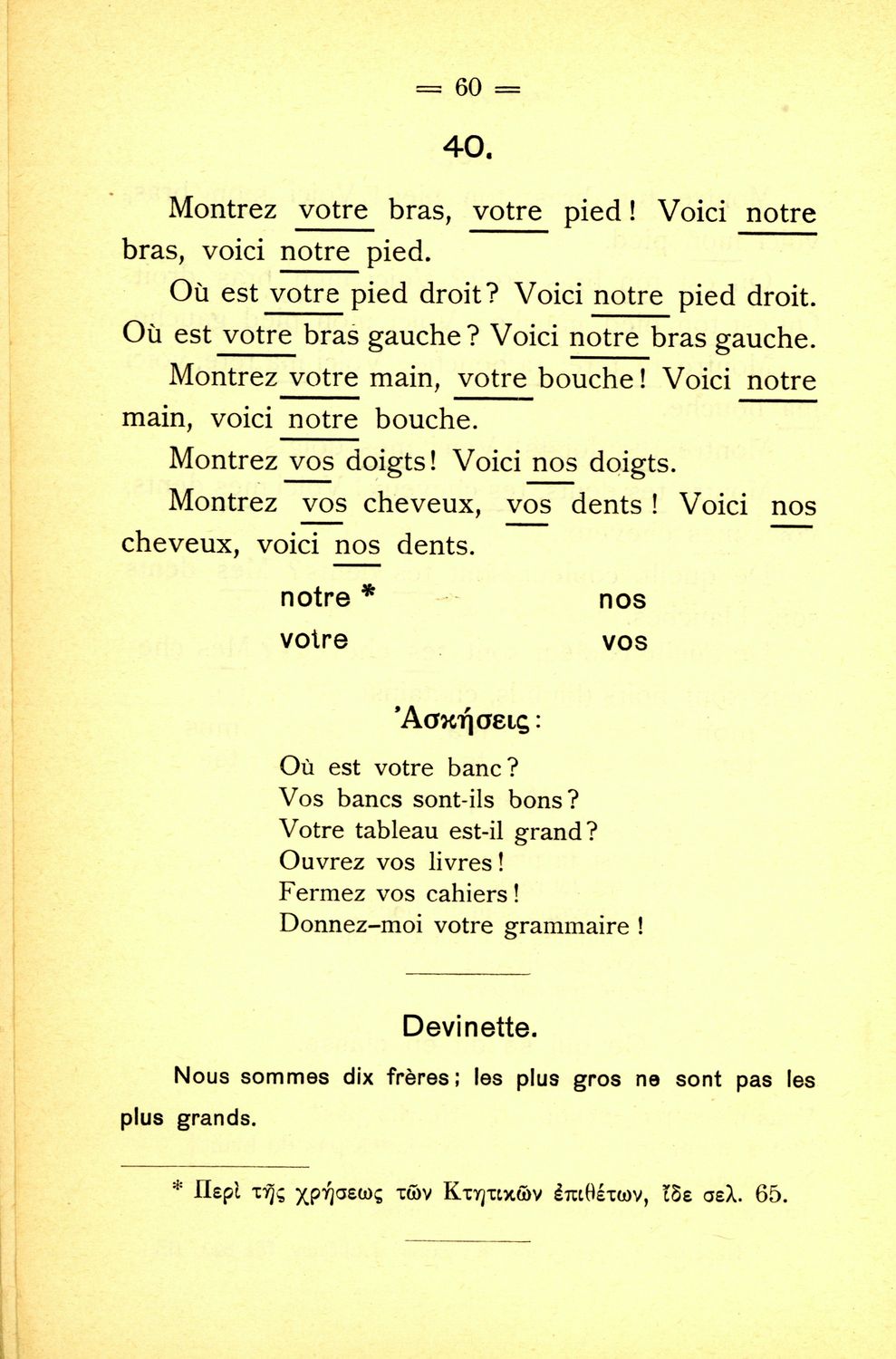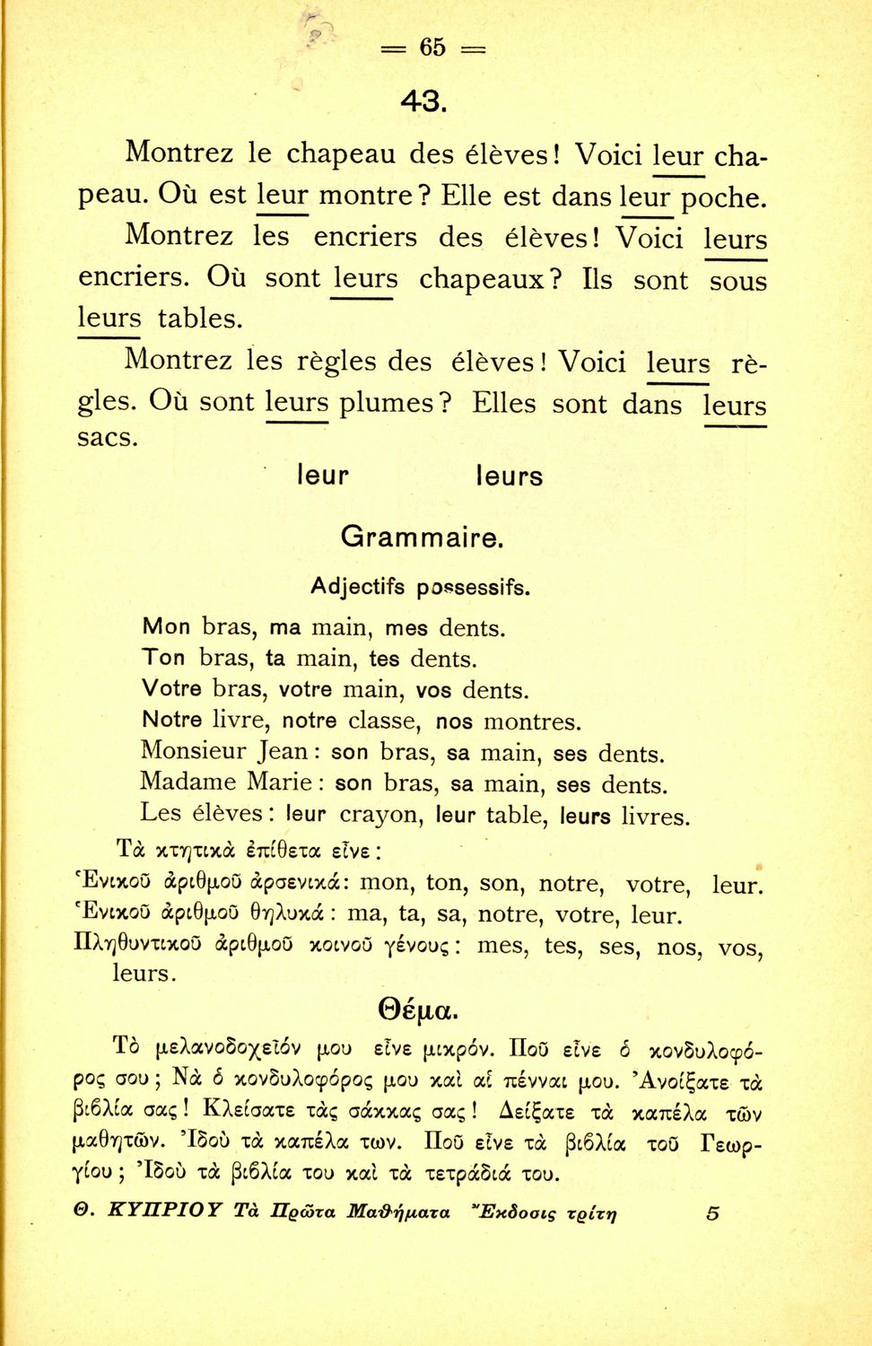 Γραμματική της Γαλλικής γλώσσας για τα Τετρατάξια Γυμνάσια, τη Γ΄ τάξη των Αστικών Σχολείων των Θηλέων και τα Διδασκαλεία της Δημοτικής Εκπαίδευσης που περιλαμβάνει θεωρία, ασκήσεις και λεξιλόγιο.