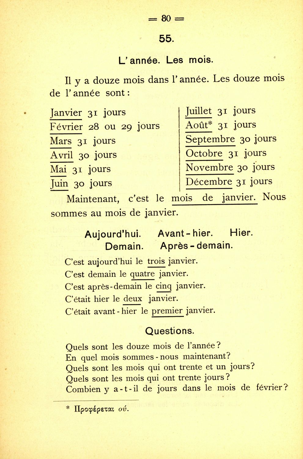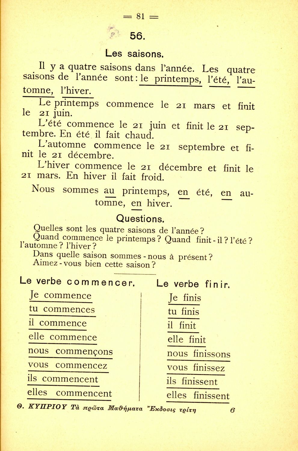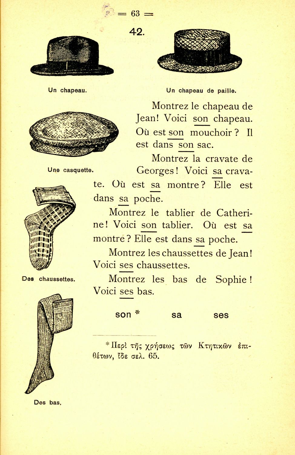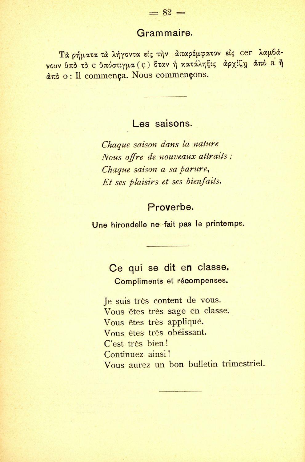Σχολικό εγχειρίδιο Γαλλικών των Γυμνασίων, Αστικών Σχολείων θηλέων και Διδασκαλείων Δημοτικής Εκπαίδευσης. Κείμενα, ποιήματα, από εποχές και τον κοινωνικό και οικογενειακό βίο, τα οποία συνοδεύονται ασκήσεις ...