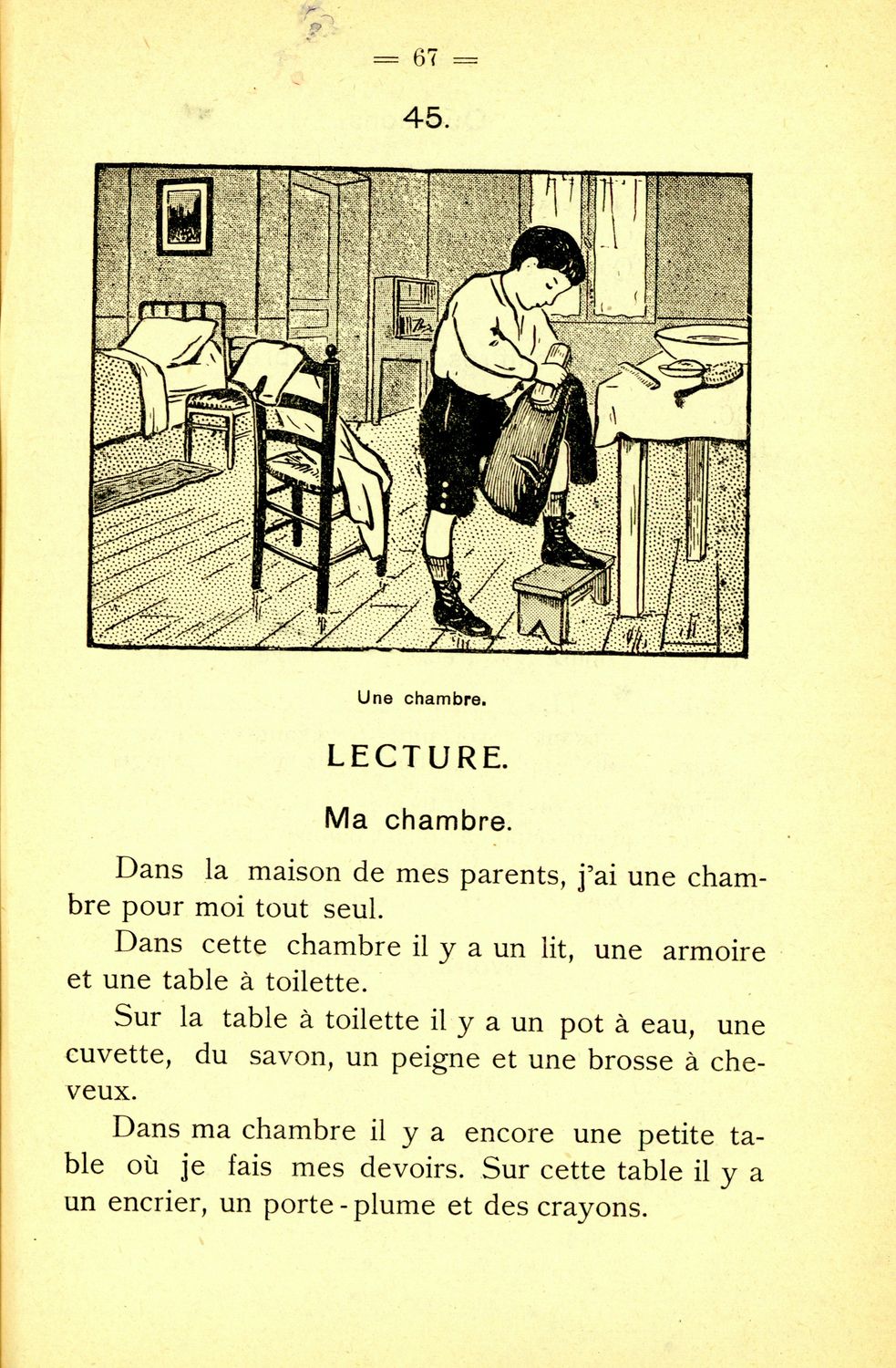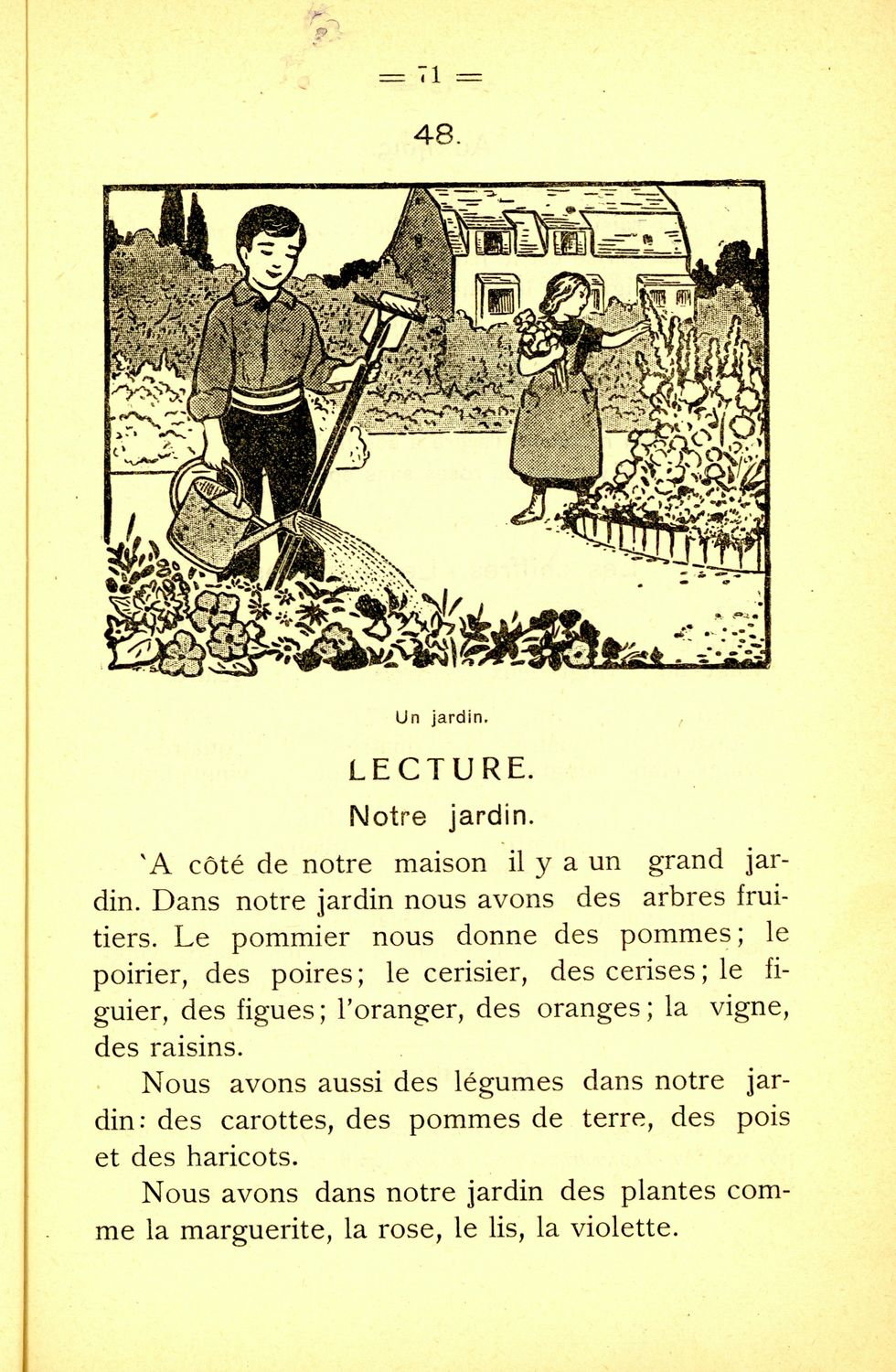 Σχολικό εγχειρίδιο Γαλλικών για τις Β΄ και Γ΄ των Ελληνικών και Αστικών Σχολείων και Παρθεναγωγείων που περιλαμβάνει εισαγωγικά μαθήματα στη γαλλική γλώσσα και εστιάζει στη διδασκαλία του γαλλικού αλφαβήτου και στην ανάγνωση και κατανόηση απλών κειμένων. Περιέχει γαλλοελληνικό λεξικό και λεξιλόγιο.