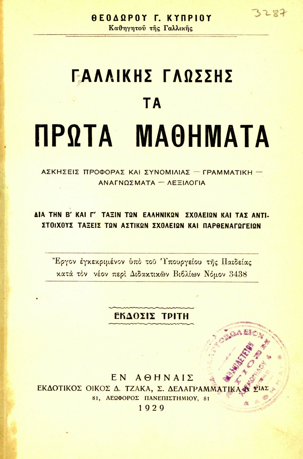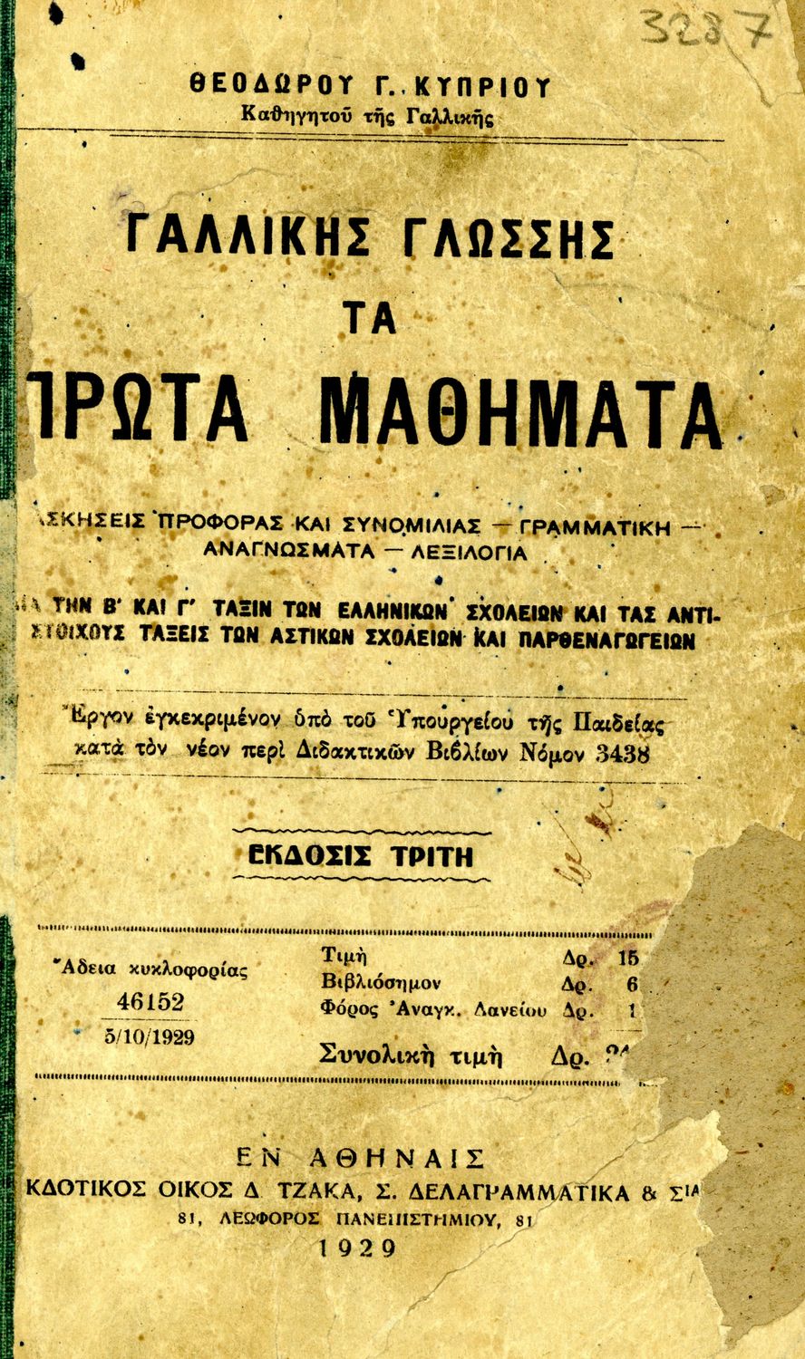 Τίτλος: Γαλλικής γλώσσης τα πρώτα μαθήματα διά την Β΄ και Γ΄ τάξιν των Ελληνικών Σχολείων και τας αντιστοίχους τάξεις των Αστικών Σχολείων και Παρθεναγωγείων