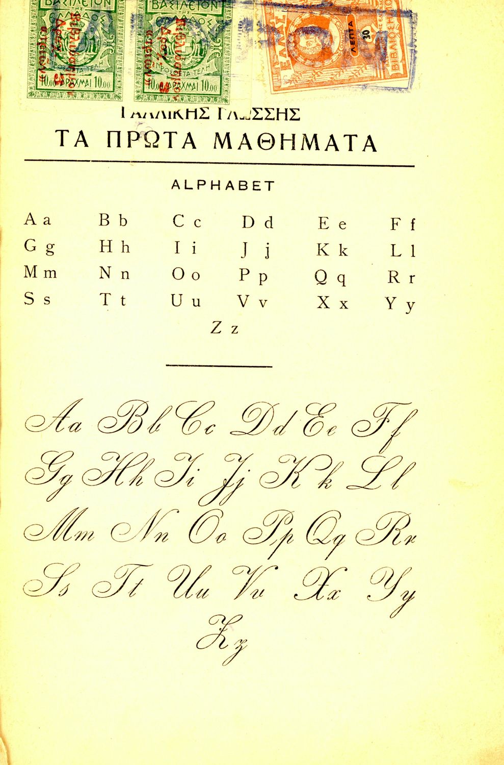 Σχολικό εγχειρίδιο Γαλλικών για τις Β΄ και Γ΄ των Ελληνικών και Αστικών Σχολείων και Παρθεναγωγείων που περιλαμβάνει εισαγωγικά μαθήματα στη γαλλική γλώσσα και εστιάζει στη διδασκαλία του γαλλικού αλφαβήτου ...