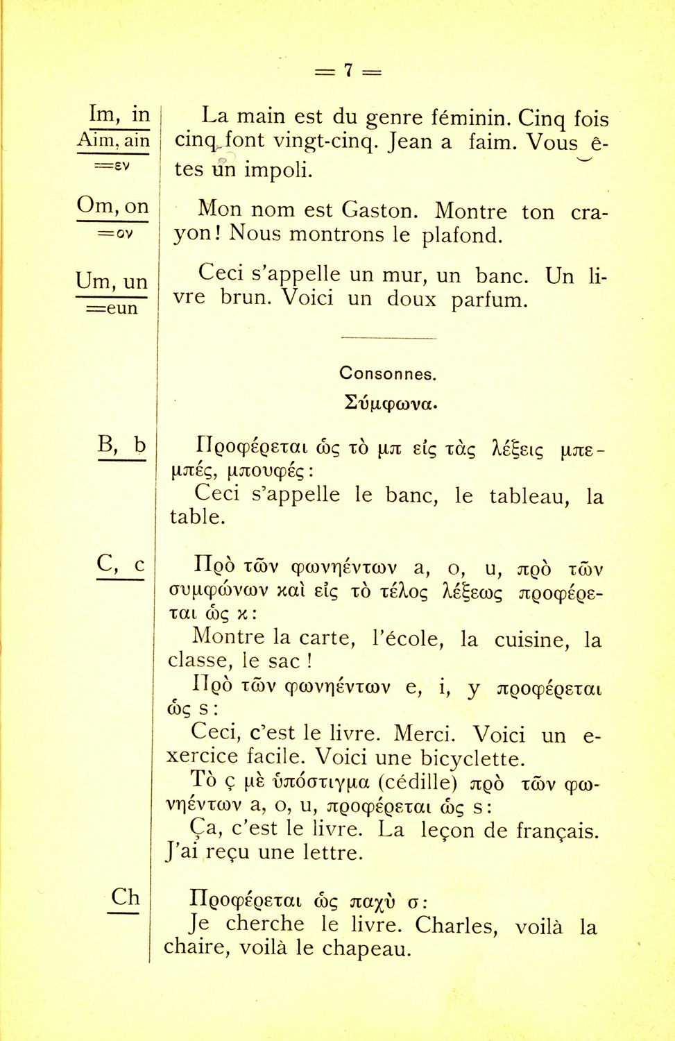 Σχολικό εγχειρίδιο Γαλλικών για τις Β’ και Γ’ Ελληνικού και Αστικού Σχολείου και Παρθεναγωγείου που περιλαμβάνει ασκήσεις προφοράς, συνομιλίας και γραμματικής, και λεξιλόγιο.