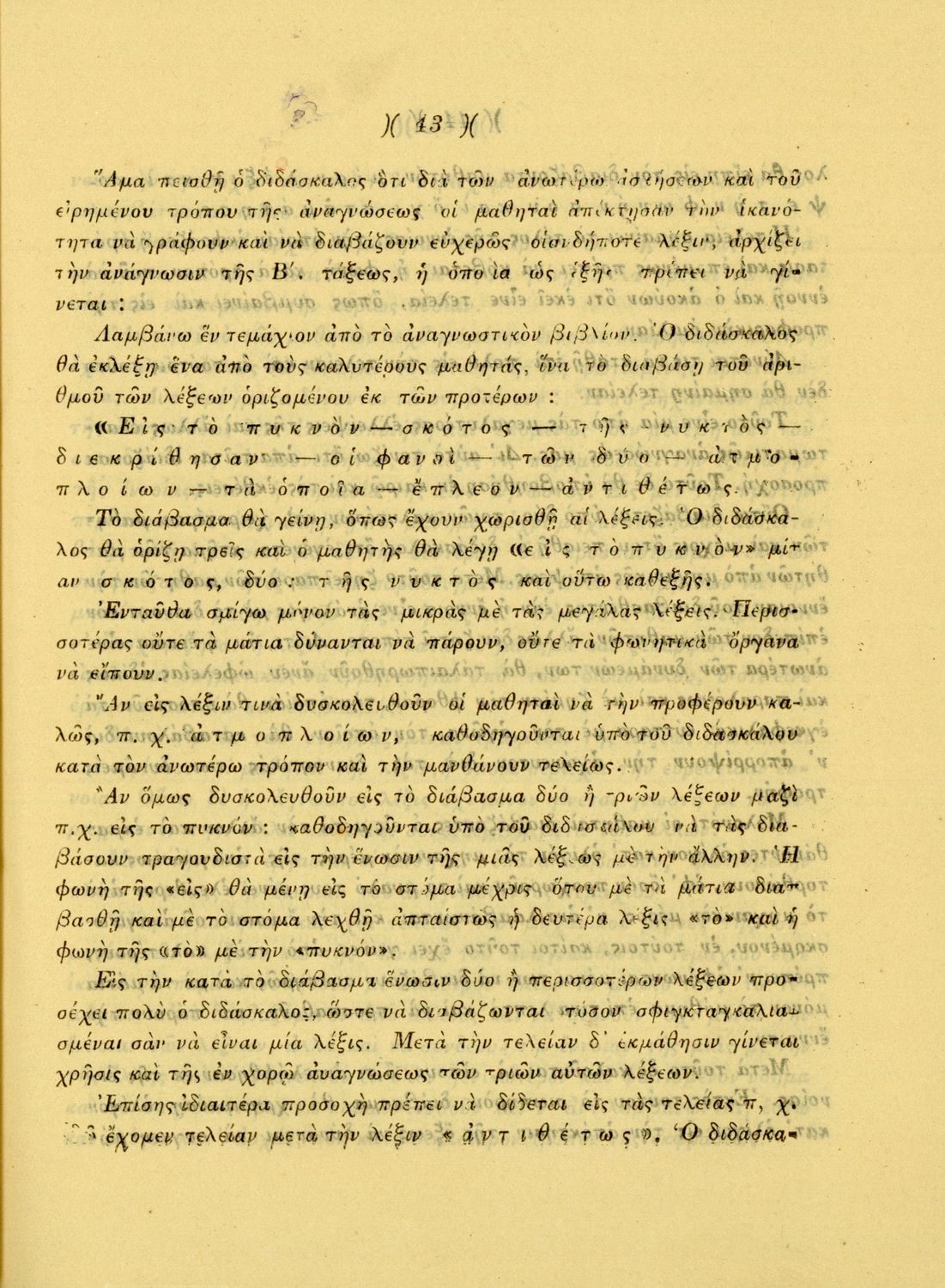 Βαθμίδα εκπαίδευσης: Πρωτοβάθμια Μάθημα: Νέα Ελληνικά Γλώσσα: Καθαρεύουσα Παρουσίαση περιεχομένου: Παιδαγωγικό βοήθημα που περιλαμβάνει κατευθυντήριες οδηγίες προς τους εκπαιδευτικούς της Πρωτοβάθμιας Εκπαίδευσης για τον τρόπο διδασκαλίας της πρώτης ανάγνωσης στους μαθητές όλων των τάξεων του Δημοτικού. |