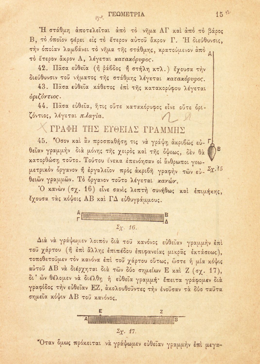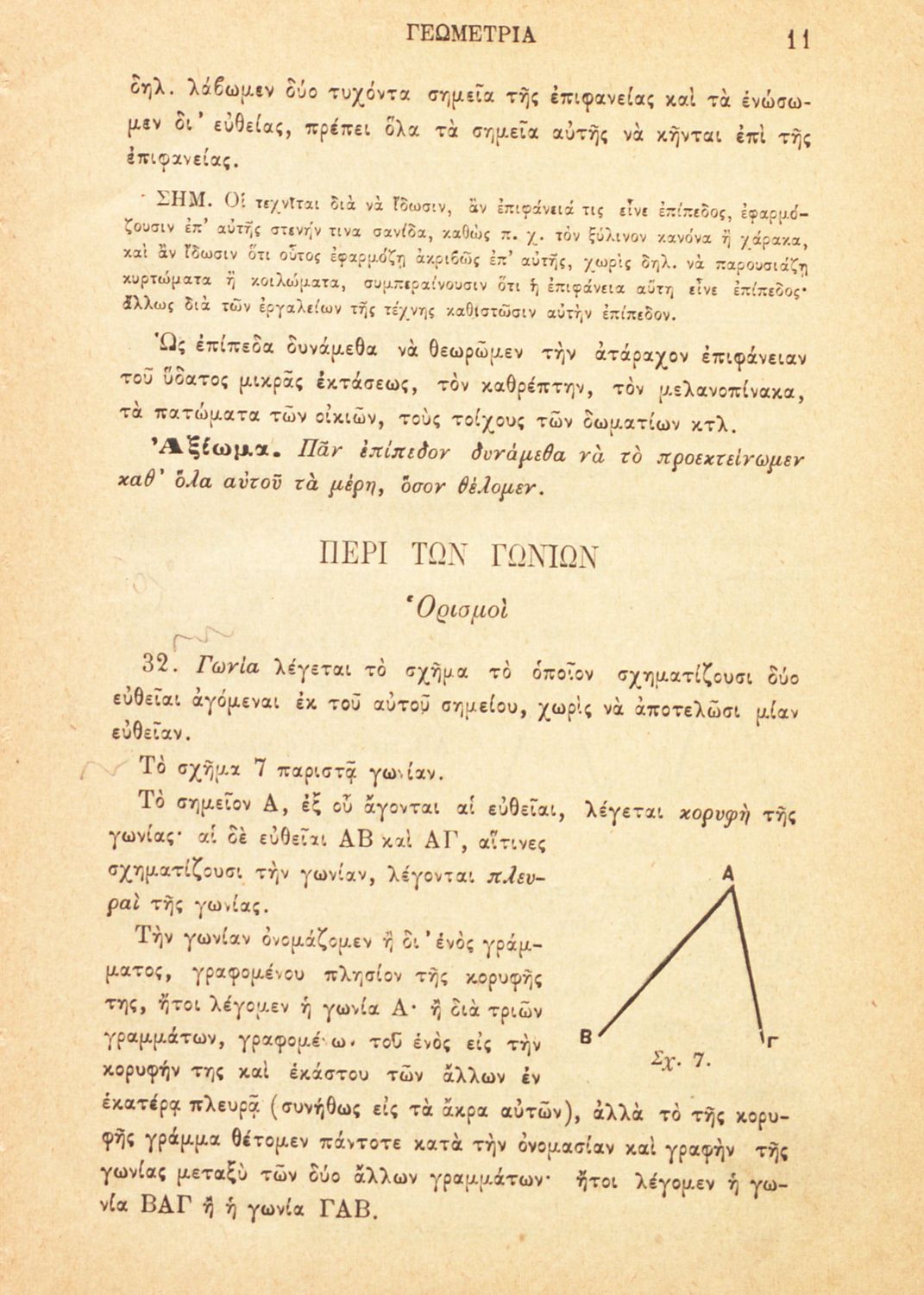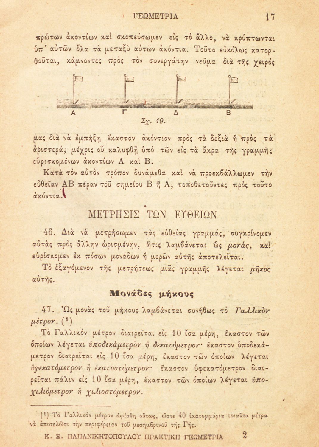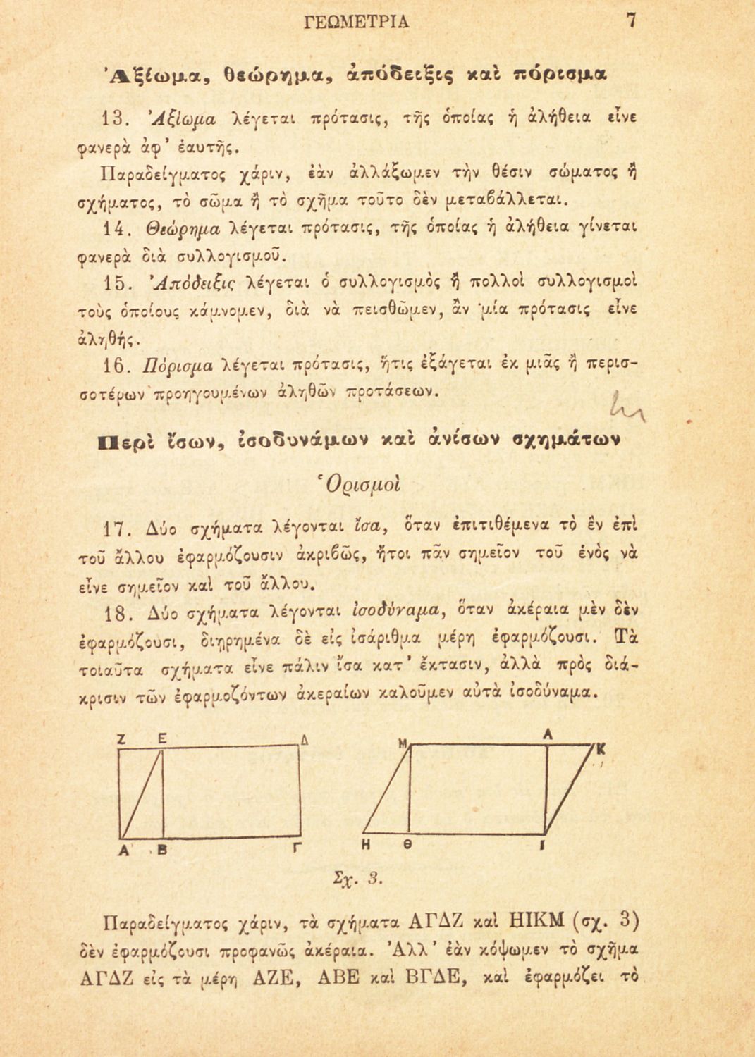 Σχολικό εγχειρίδιο Γεωμετρίας για τα Ελληνικά Σχολεία που περιέχει θεωρία, προβλήματα και ασκήσεις και εστιάζει στα γεωμετρικά σχήματα και σώματα και τη μέτρησή τους.