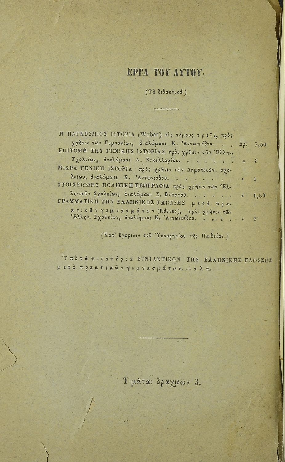 Τίτλος: Ελληνική ιστορία από των αρχαιοτάτων χρόνων μέχρι των καθ' ημάς προς χρήσιν των εις την Δ΄ τάξιν των Γυμνασίων μαθητευομένων