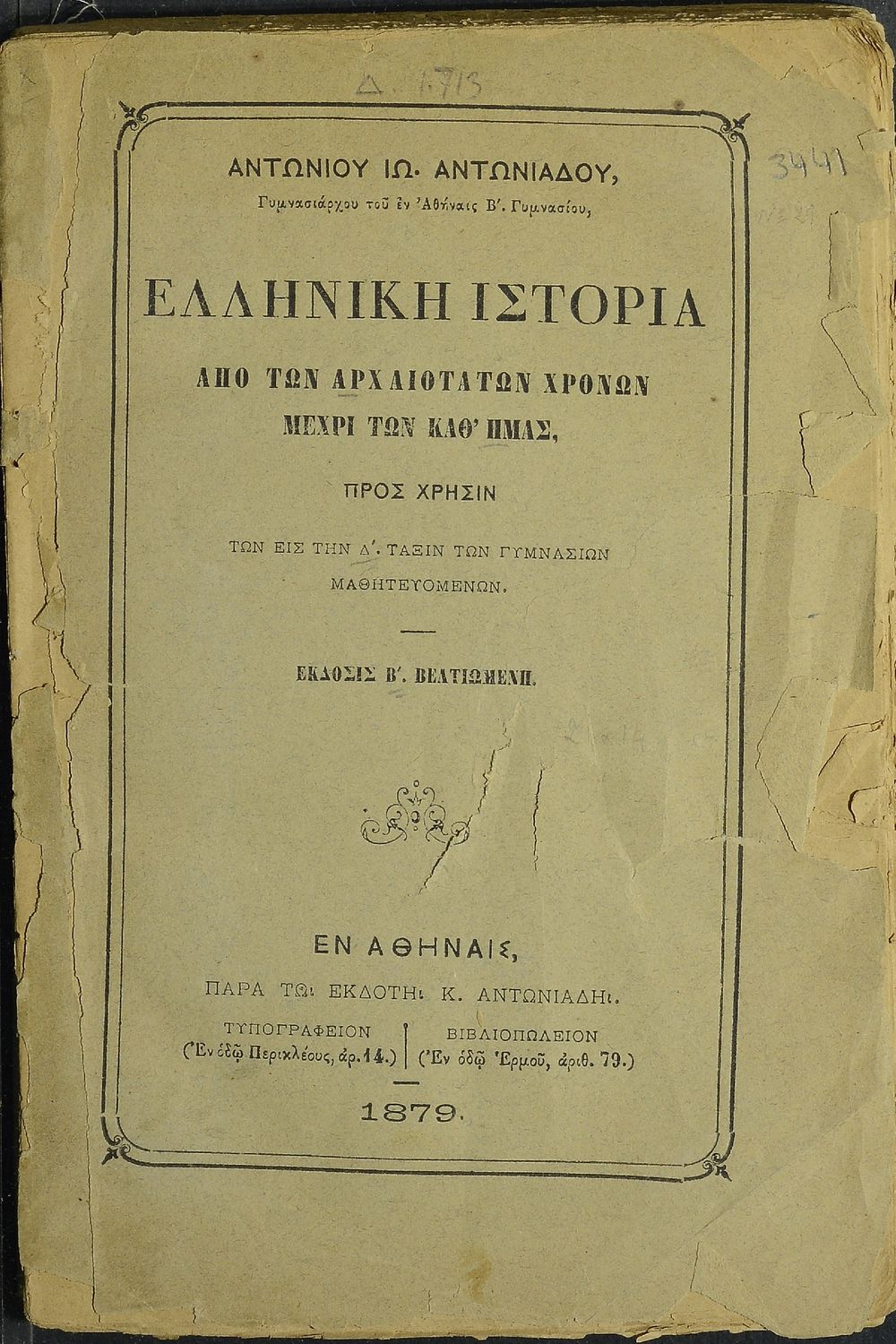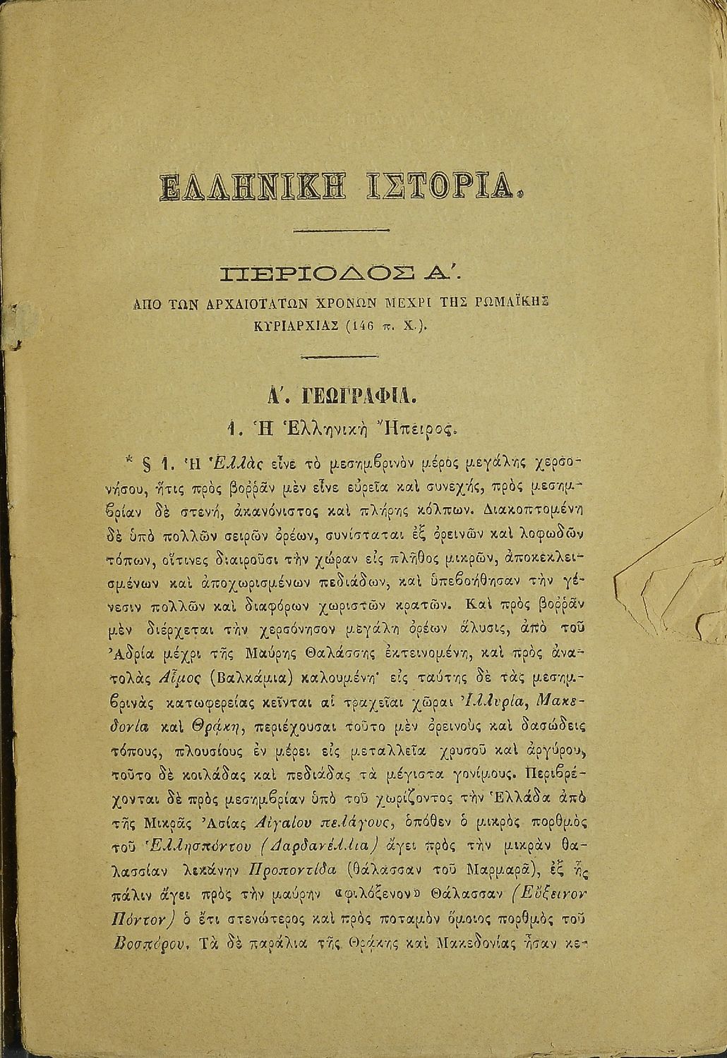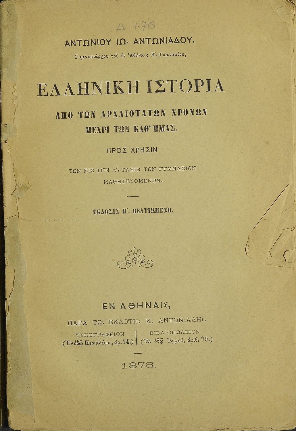 Τίτλος: Ελληνική ιστορία από των αρχαιοτάτων χρόνων μέχρι των καθ' ημάς προς χρήσιν των εις την Δ΄ τάξιν των Γυμνασίων μαθητευομένων