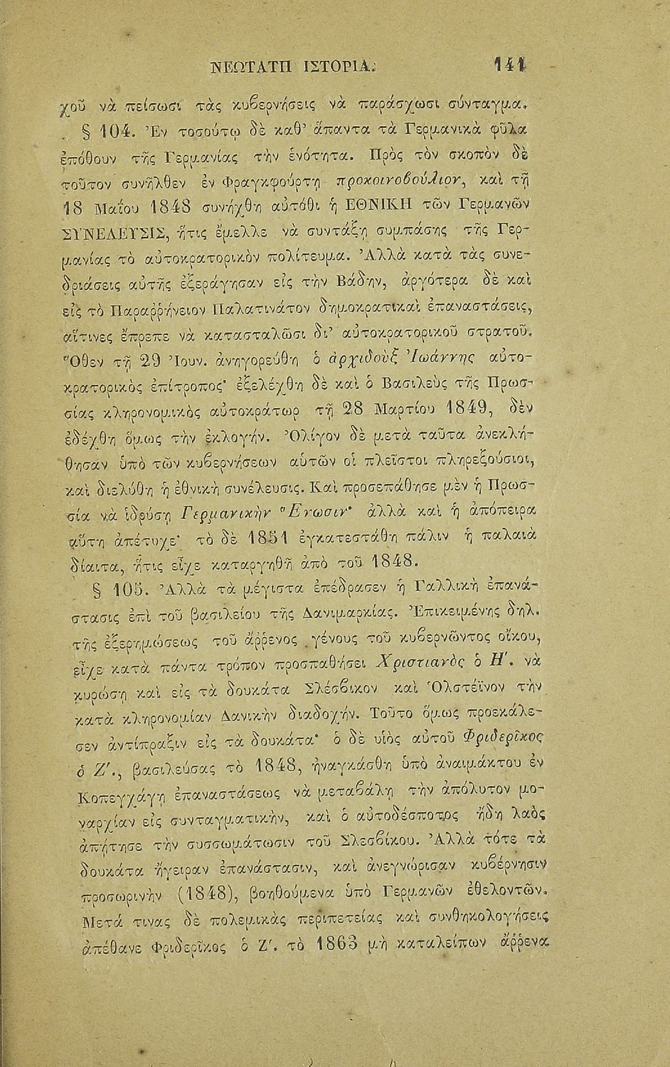 Βαθμίδα εκπαίδευσης: Δευτεροβάθμια Τάξη: Γ' Γυμνασίου Μάθημα: Ιστορία Γλώσσα: Καθαρεύουσα Παρουσίαση περιεχομένου: Σχολικό εγχειρίδιο Ιστορίας για τη Γ΄ Γυμνασίου που περιλαμβάνει τα βιβλία Γ΄ και Δ΄ της γερμανικής έκδοσης και καλύπτει την περίοδο από την εφεύρεση της τυπογραφίας και Αμερικανική Επανάσταση μέχρι την προσάρτηση της Θεσσαλίας και της Ηπείρου στην Ελλάδα.. |