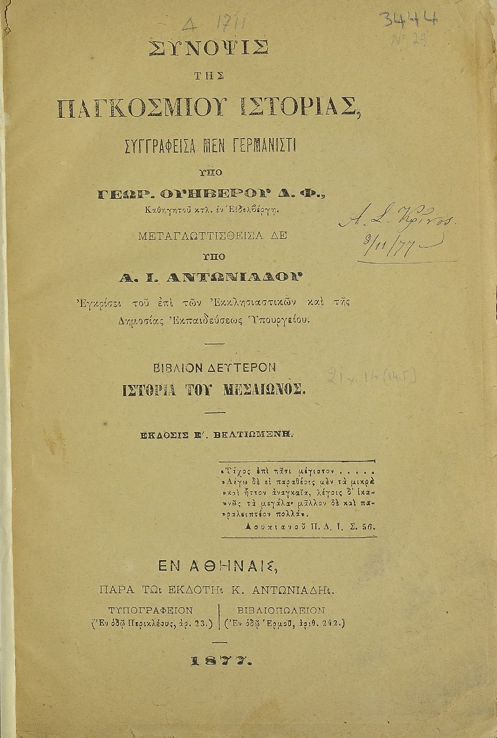 Εκδότης: Κ. Αντωνιάδης Έτος έκδοσης: 1877 Τόπος έκδοσης: Αθήνα Έκδοση: 5η |