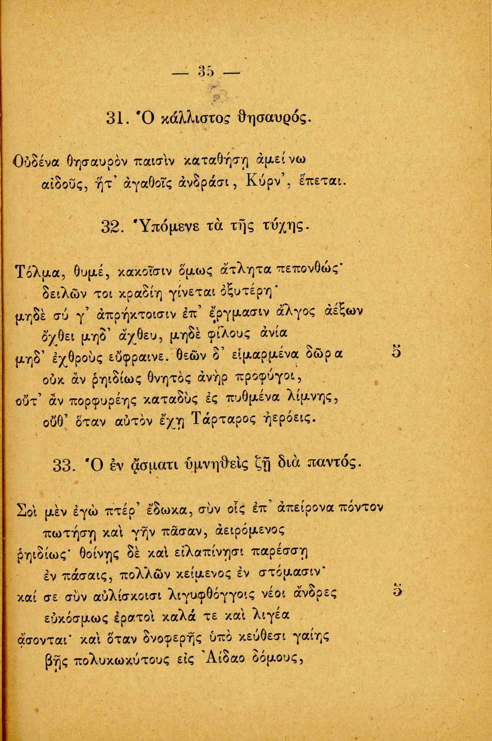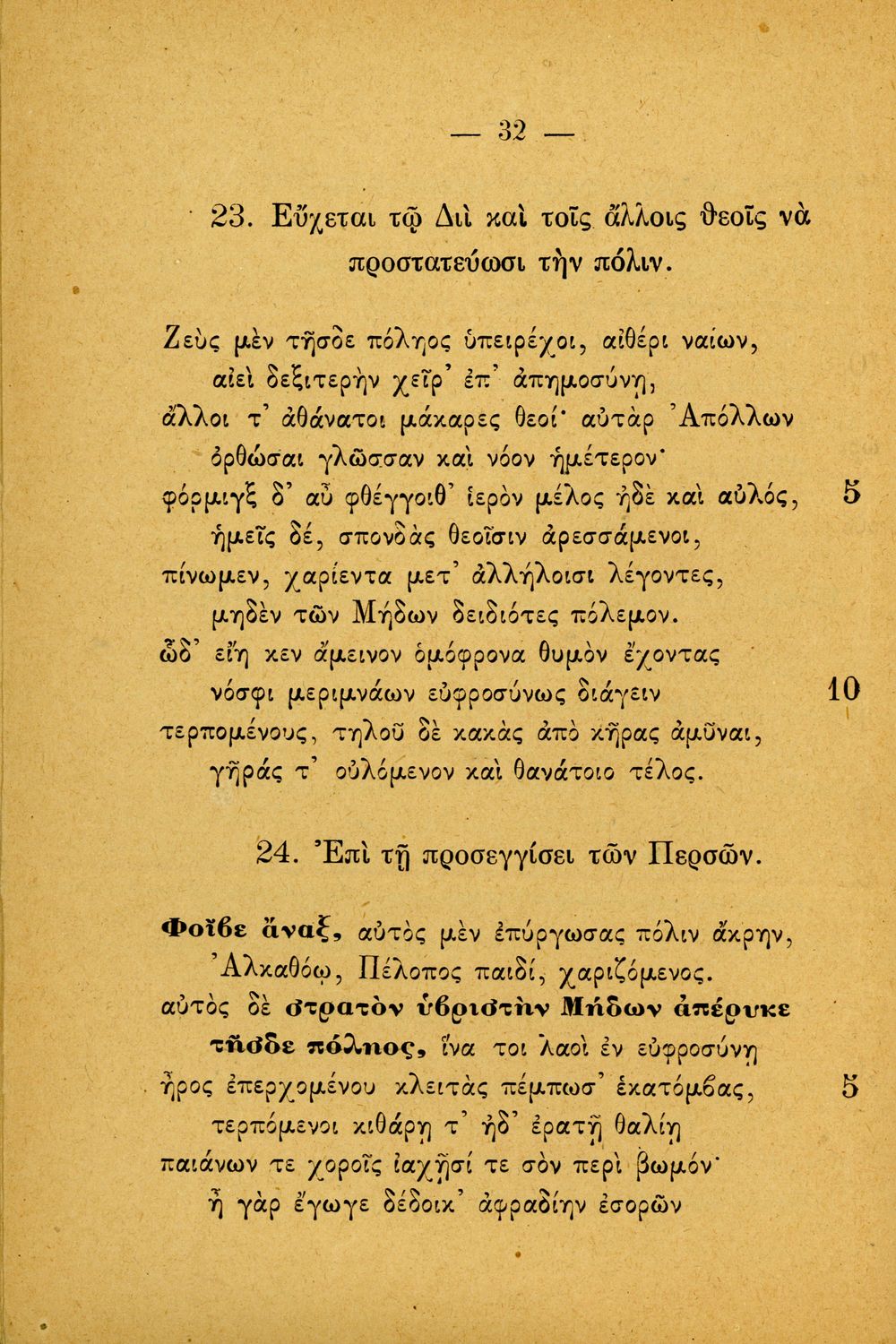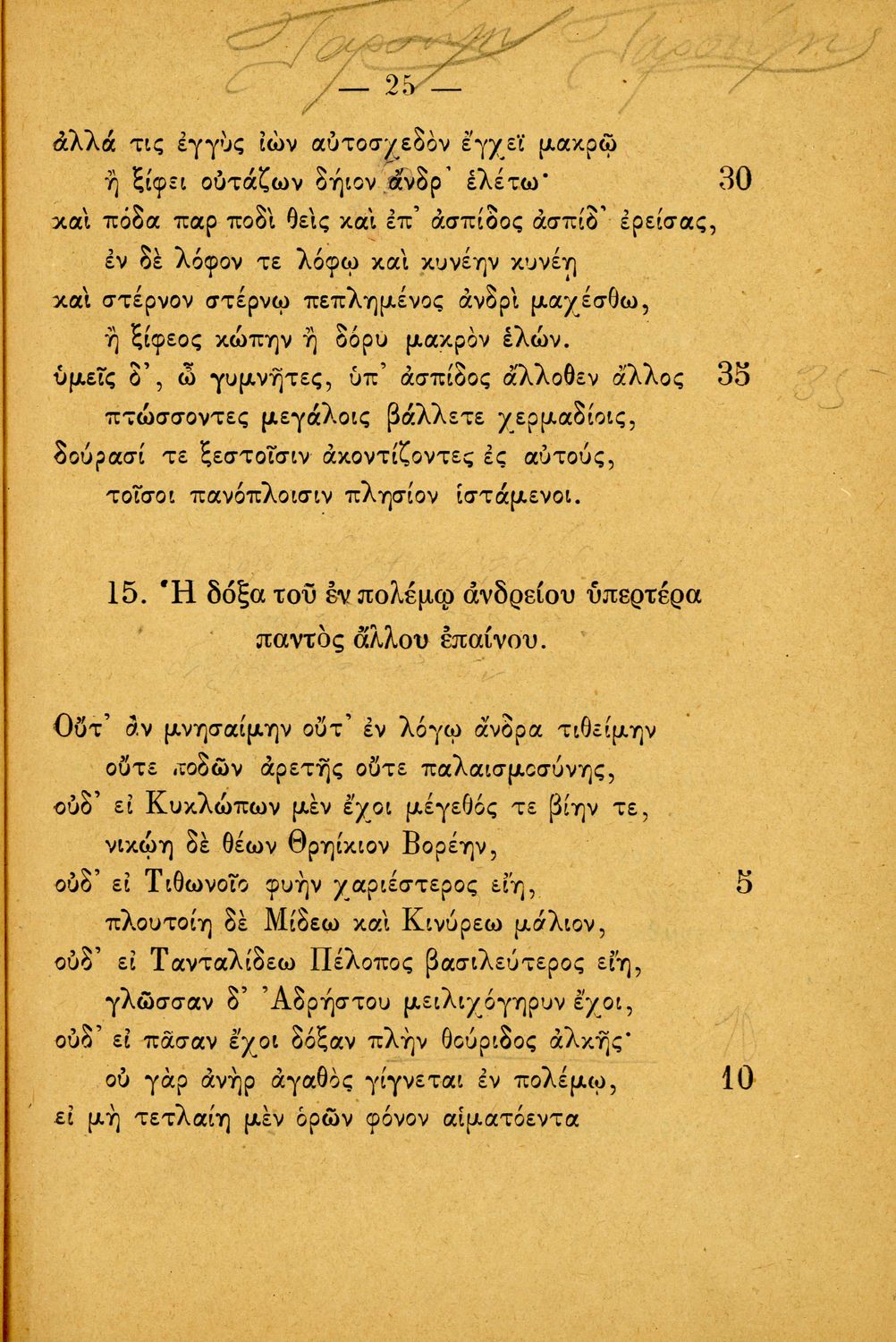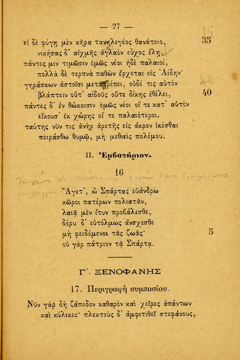 Σχολικό εγχειρίδιο Αρχαίων Ελληνικών Γ΄ Γυμνασίου που περιλαμβάνει αποσπάσματα έργων αρχαίων Ελλήνων λυρικών, πολιτικές και γνωμικές ελεγείες, περιγραφές συμποσίων, δημοτικά άσματα, επιγράμματα κ.α. Περιέχει και υπόμνημα με ερμηνευτικά, πραγματολογικά, γλωσσικά και γραμματικά σχόλια.