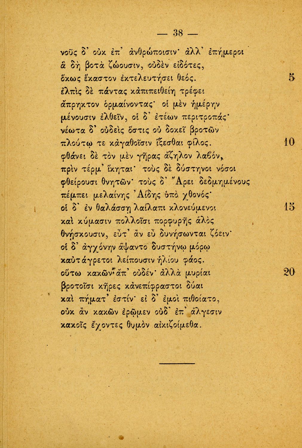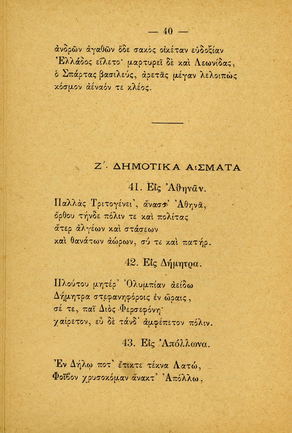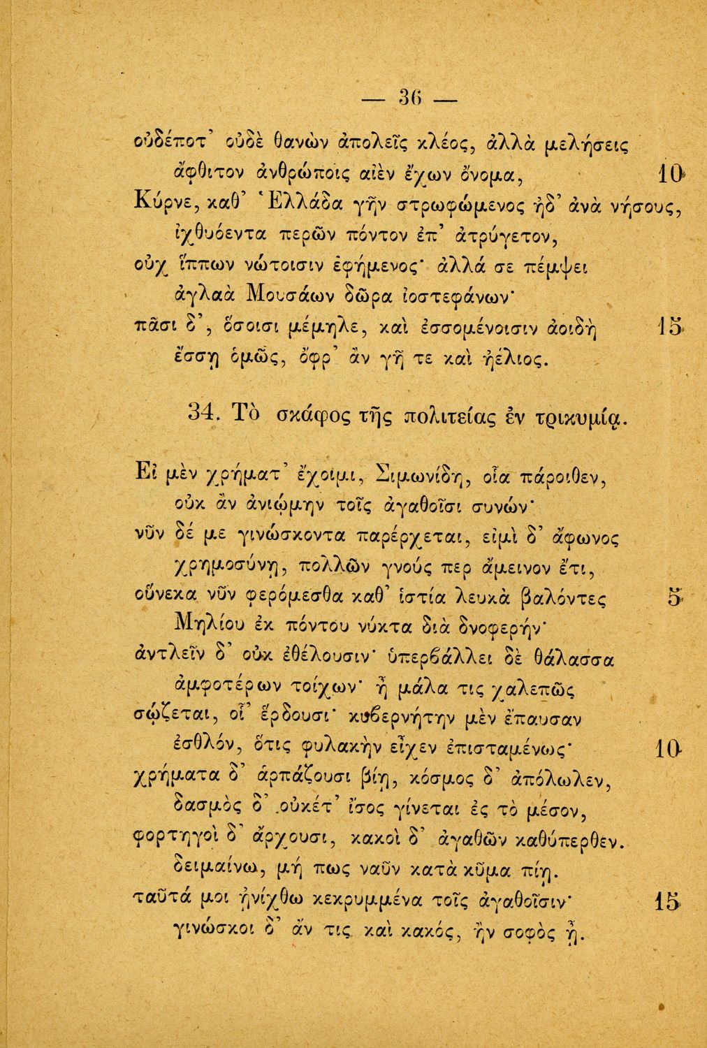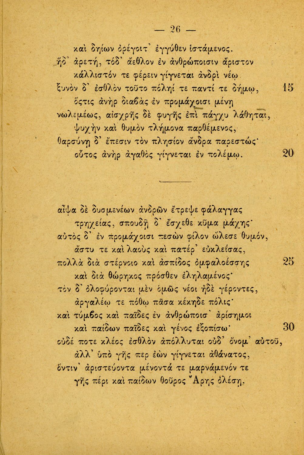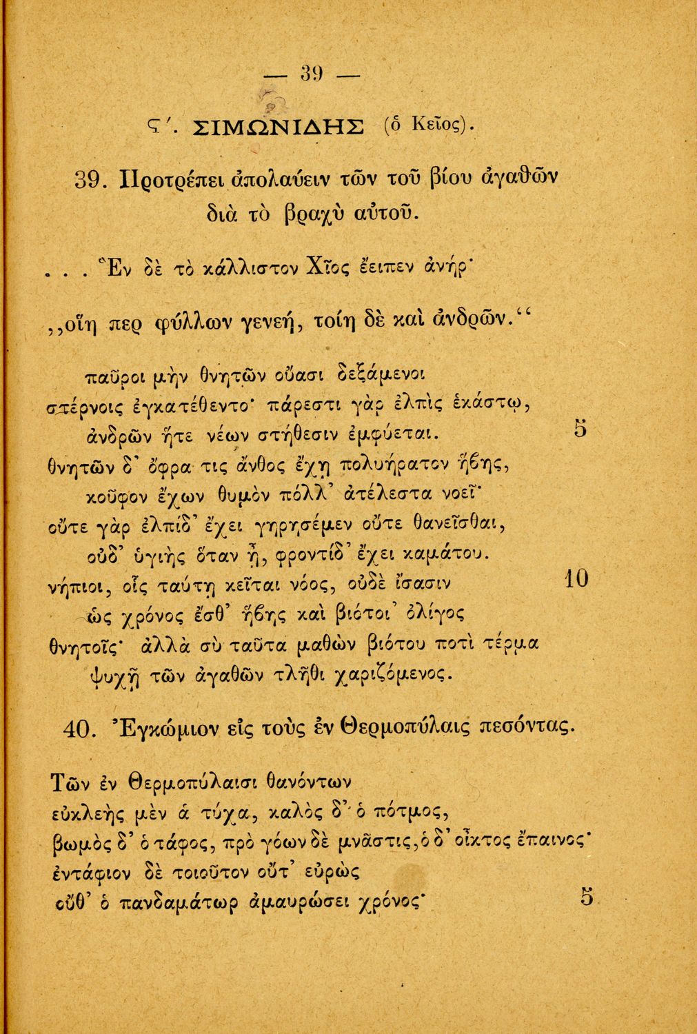 Σχολικό εγχειρίδιο Αρχαίων Ελληνικών Γ΄ Γυμνασίου που περιλαμβάνει αποσπάσματα έργων αρχαίων Ελλήνων λυρικών, πολιτικές και γνωμικές ελεγείες, περιγραφές συμποσίων, δημοτικά άσματα, επιγράμματα κ.α. Περιέχει και υπόμνημα με ερμηνευτικά, πραγματολογικά, γλωσσικά και γραμματικά σχόλια.