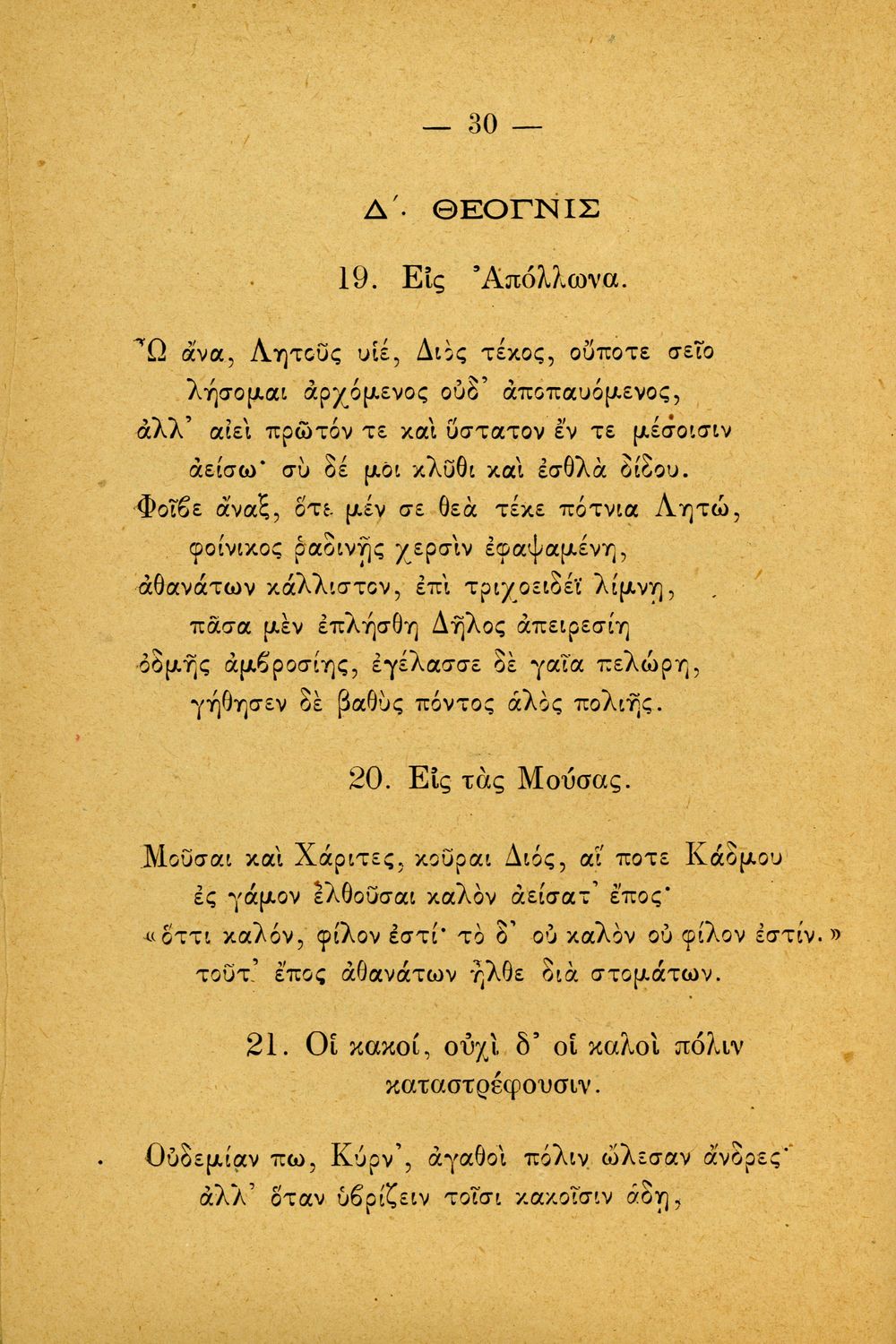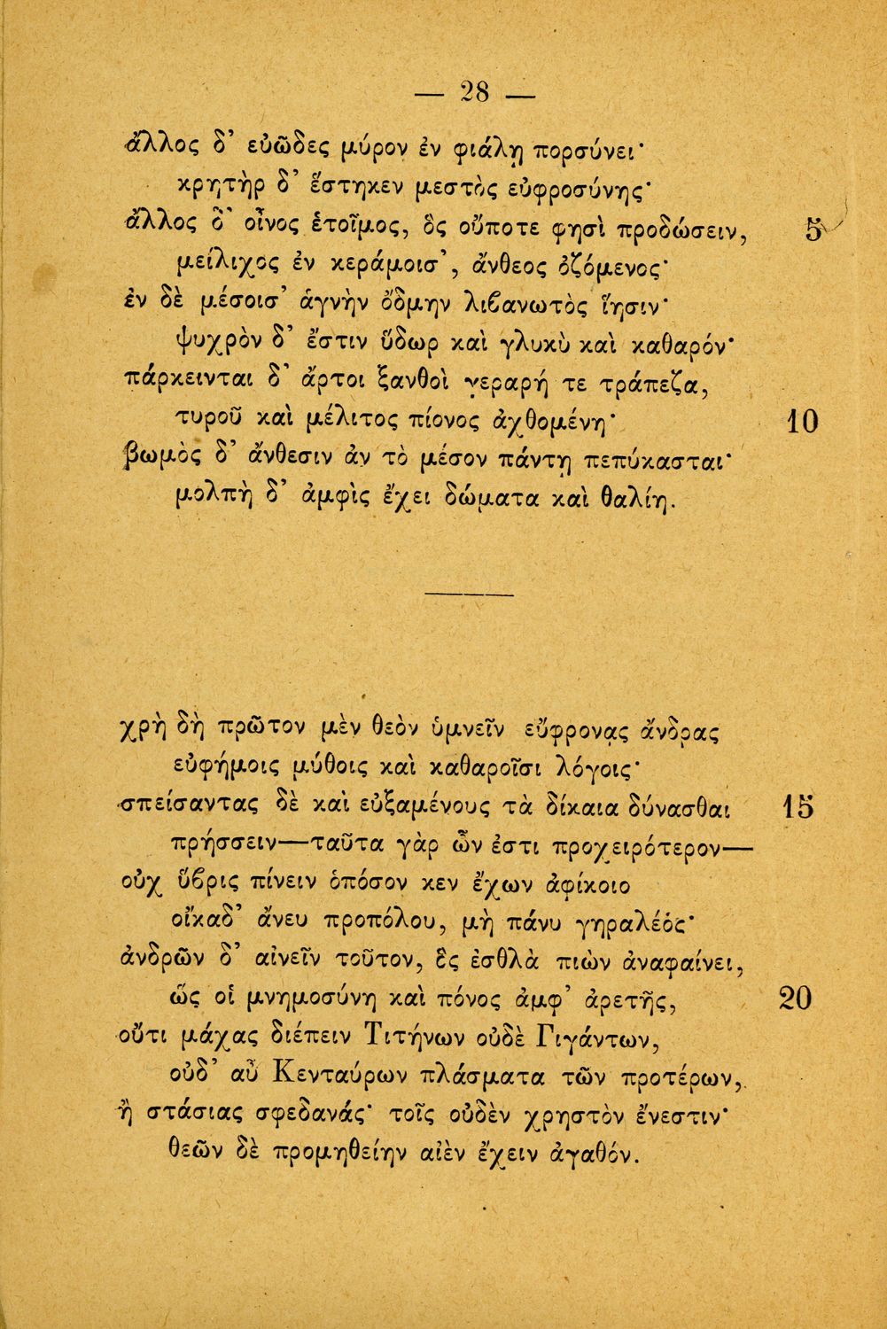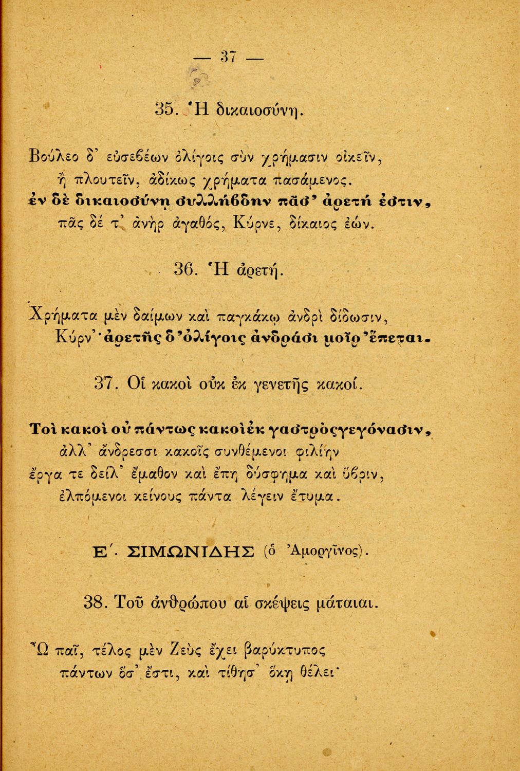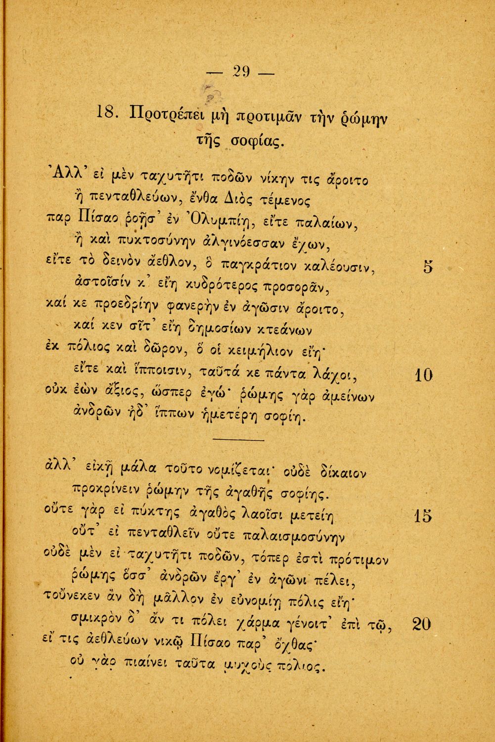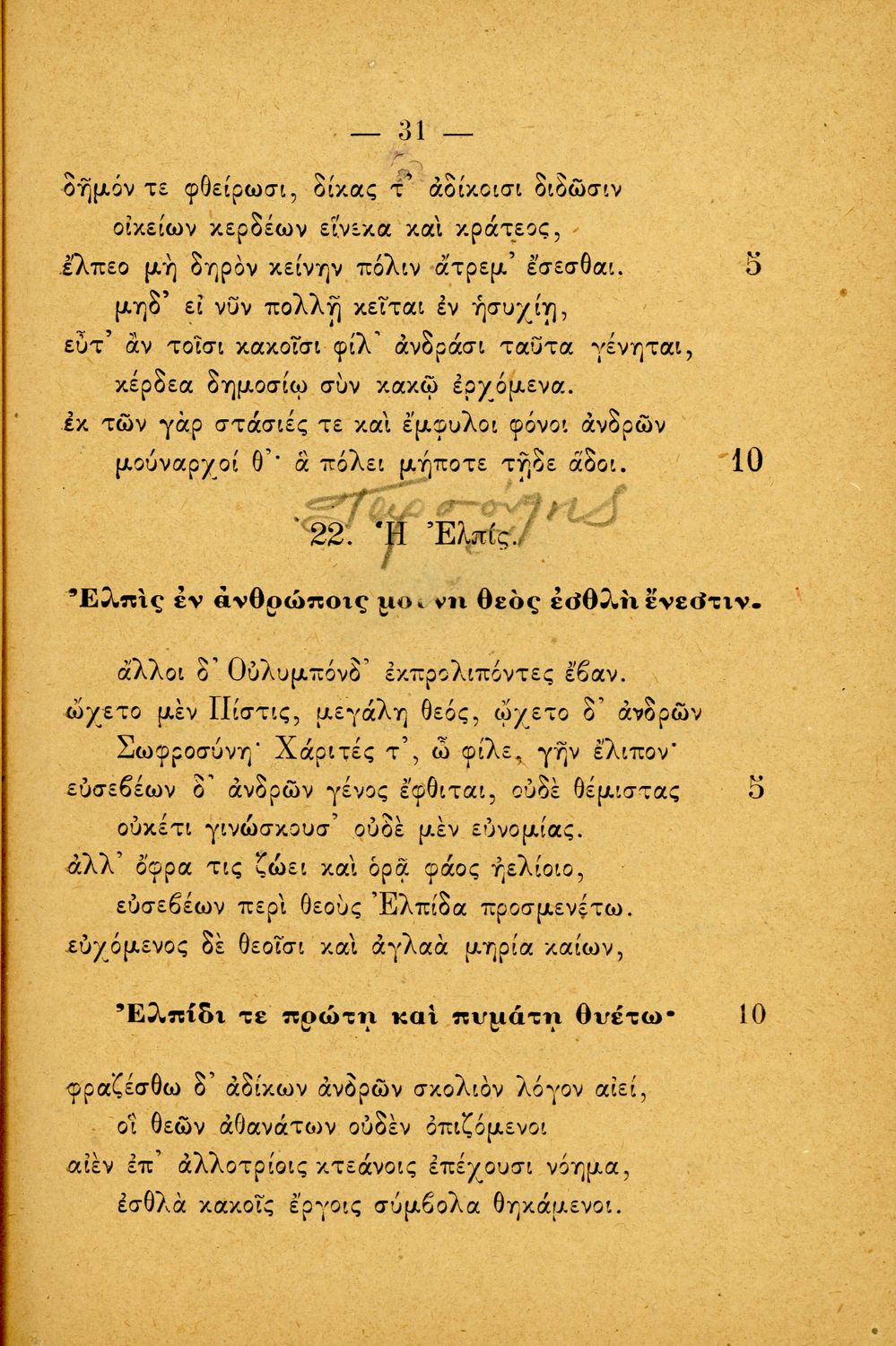 Βαθμίδα εκπαίδευσης: Δευτεροβάθμια Τάξη: Γ' Γυμνασίου Μάθημα: Αρχαία Ελληνικά Γλώσσα: Καθαρεύουσα Παρουσίαση περιεχομένου: Σχολικό εγχειρίδιο Αρχαίων Ελληνικών Γ΄ Γυμνασίου που περιλαμβάνει αποσπάσματα έργων αρχαίων Ελλήνων λυρικών, πολιτικές και γνωμικές ελεγείες, περιγραφές συμποσίων, δημοτικά άσματα, επιγράμματα κ.α. Περιέχει και υπόμνημα με ερμηνευτικά, πραγματολογικά, γλωσσικά και γραμματικά σχόλια. |