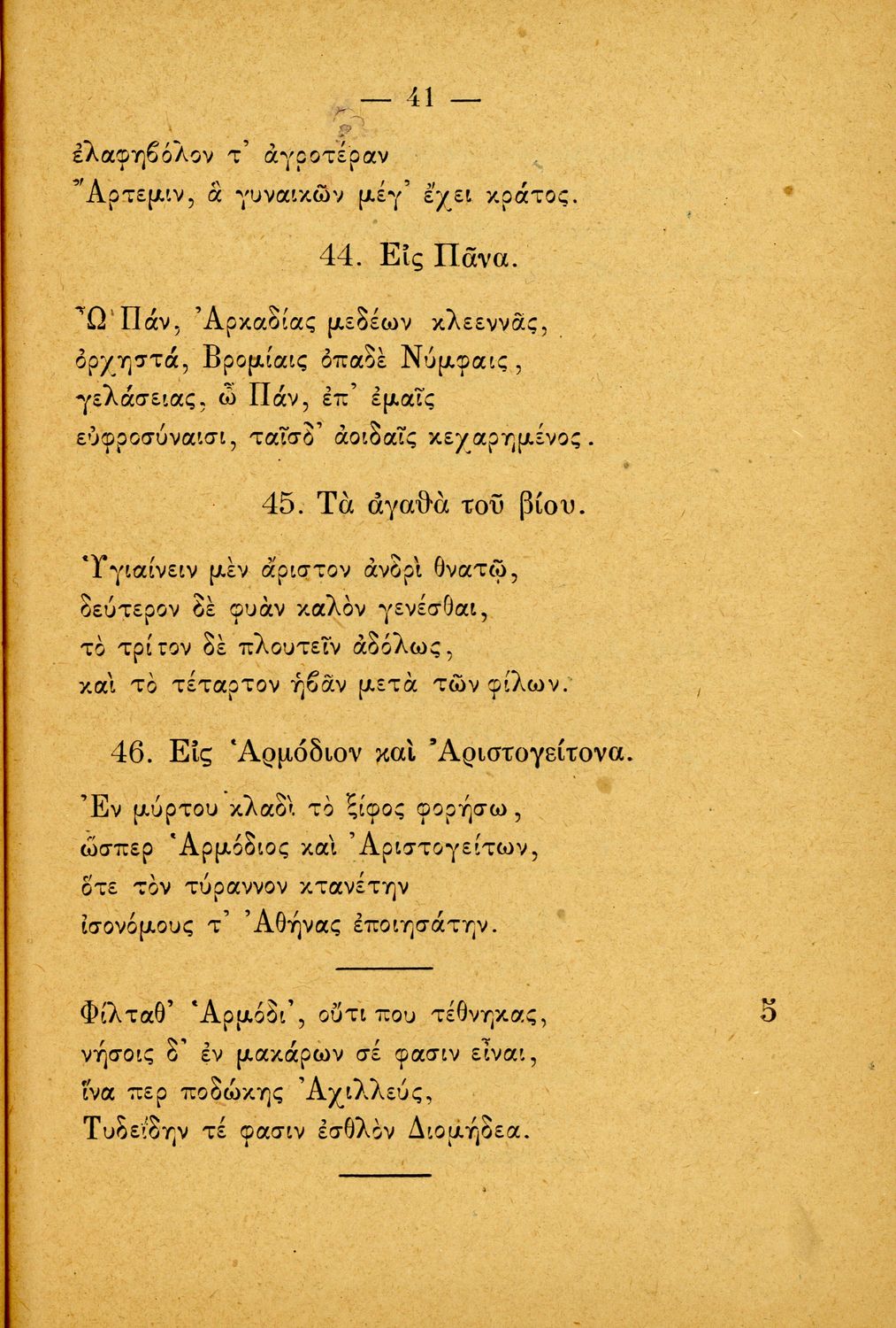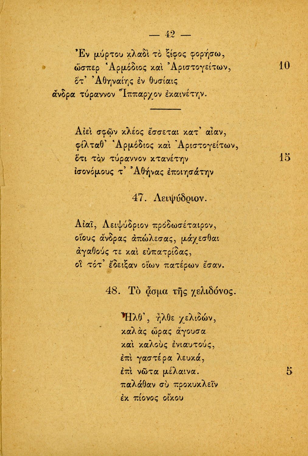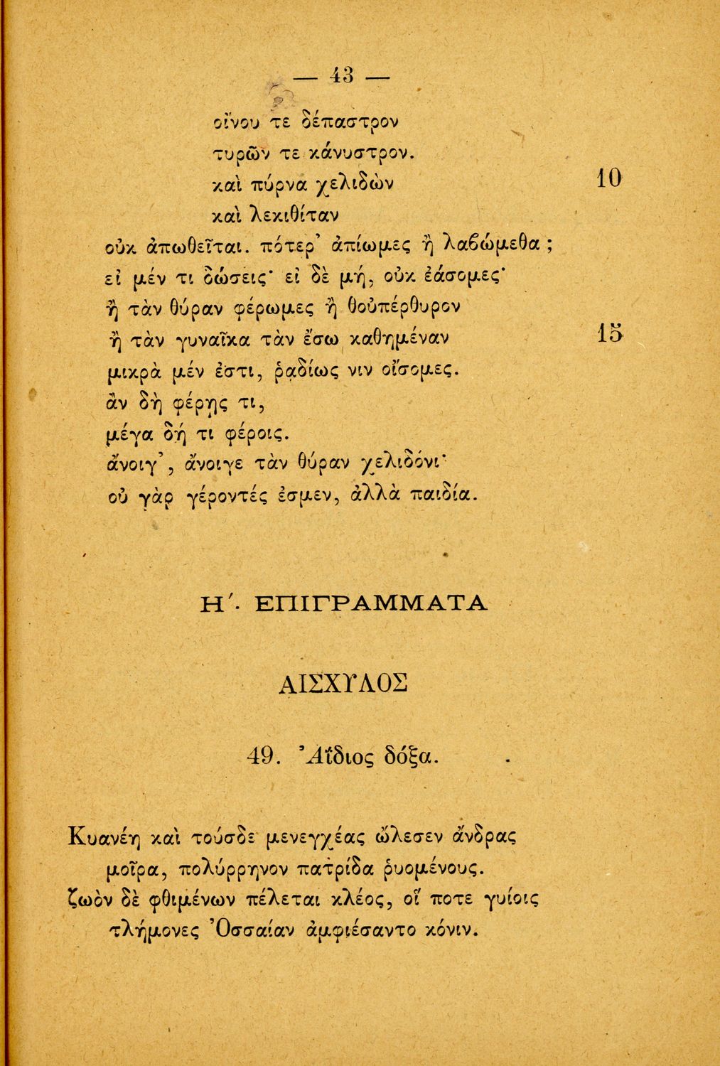 Σχολικό εγχειρίδιο Αρχαίων Ελληνικών Γ΄ Γυμνασίου που περιλαμβάνει αποσπάσματα έργων αρχαίων Ελλήνων λυρικών, πολιτικές και γνωμικές ελεγείες, περιγραφές συμποσίων, δημοτικά άσματα, επιγράμματα κ.α. Περιέχει και υπόμνημα με ερμηνευτικά, πραγματολογικά, γλωσσικά και γραμματικά σχόλια.