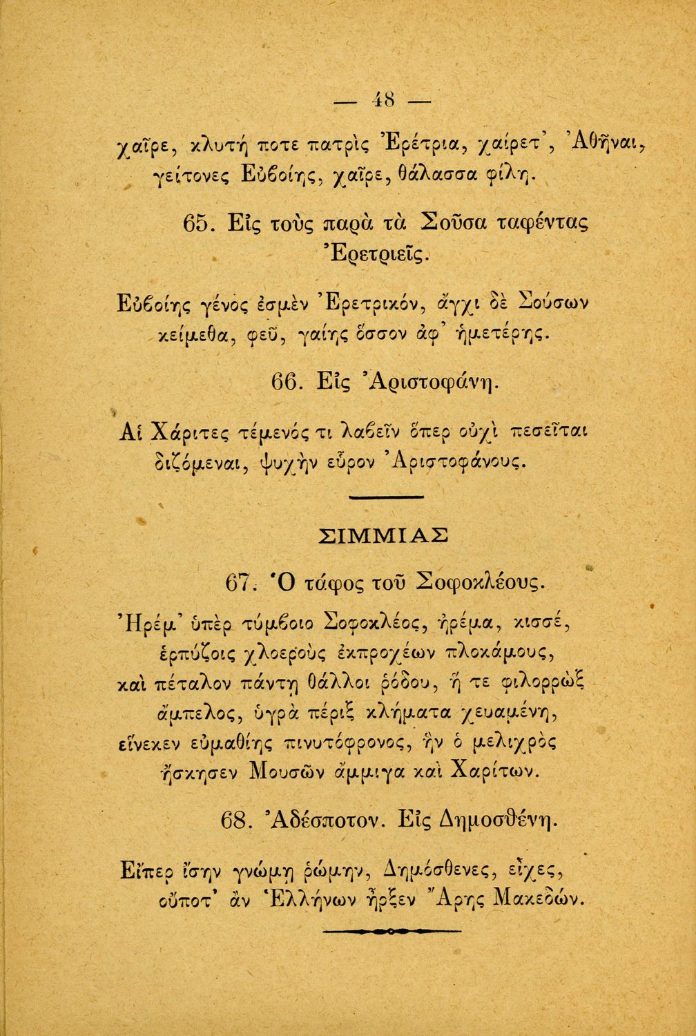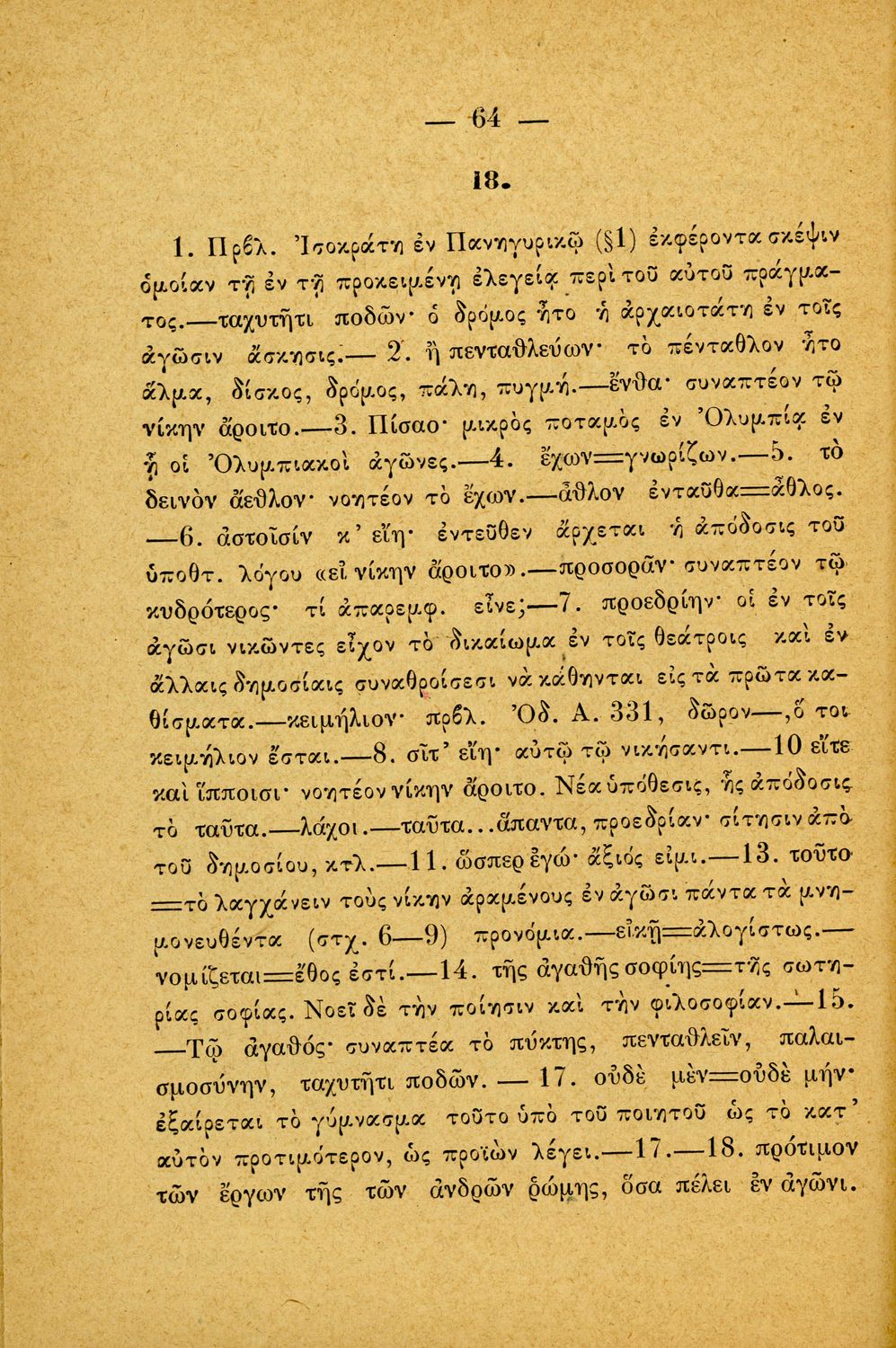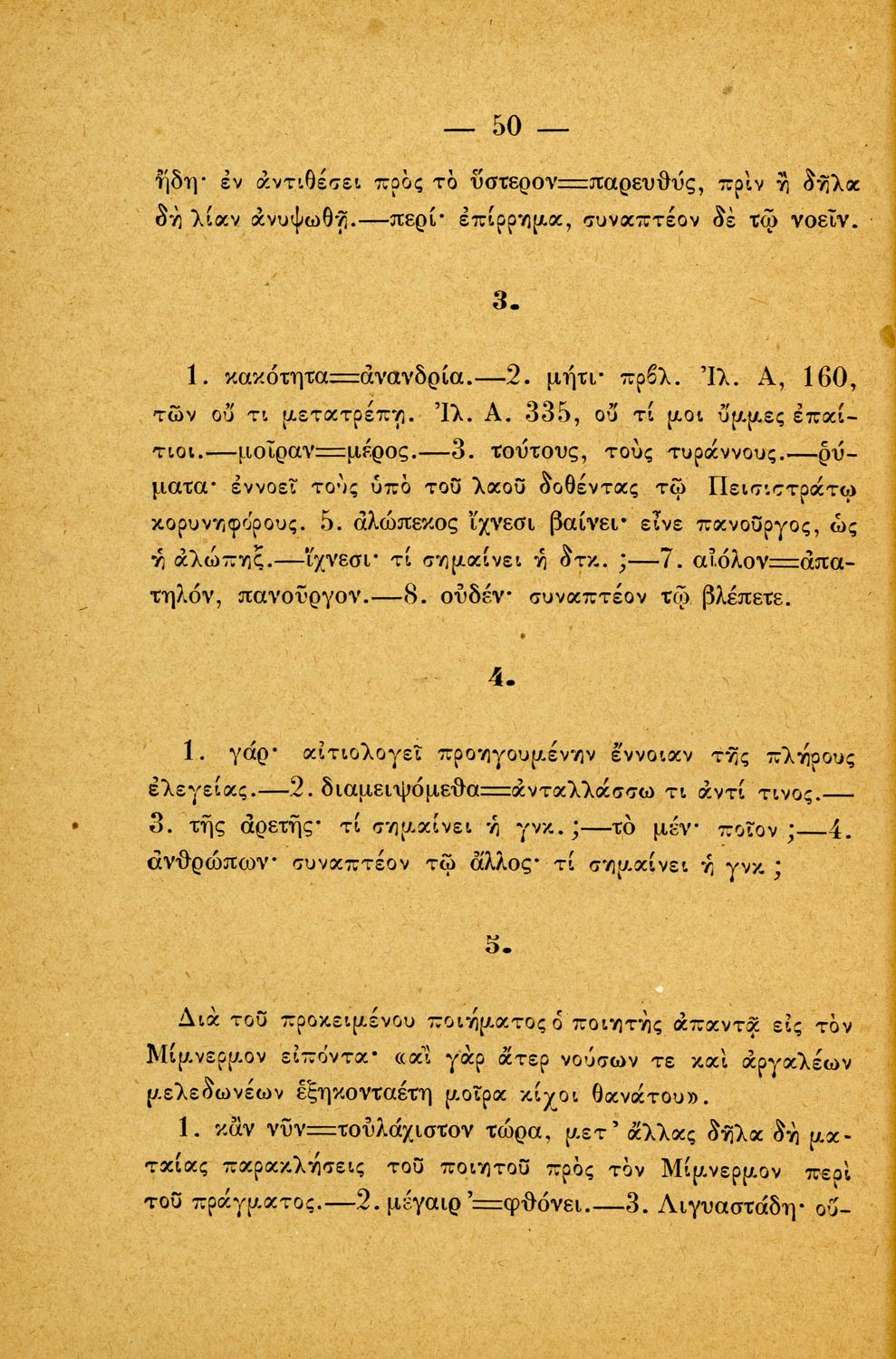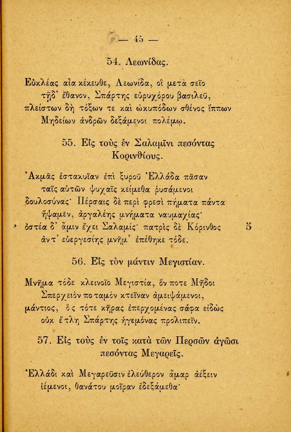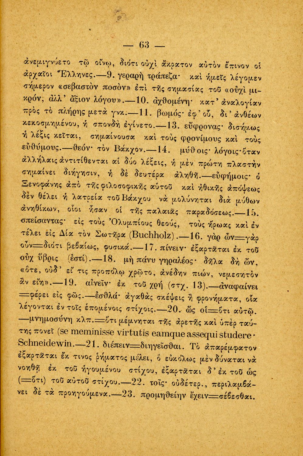 Βαθμίδα εκπαίδευσης: Δευτεροβάθμια Τάξη: Γ' Γυμνασίου Μάθημα: Αρχαία Ελληνικά Γλώσσα: Καθαρεύουσα Παρουσίαση περιεχομένου: Σχολικό εγχειρίδιο Αρχαίων Ελληνικών Γ΄ Γυμνασίου που περιλαμβάνει αποσπάσματα έργων αρχαίων Ελλήνων λυρικών, πολιτικές και γνωμικές ελεγείες, περιγραφές συμποσίων, δημοτικά άσματα, επιγράμματα κ.α. Περιέχει και υπόμνημα με ερμηνευτικά, πραγματολογικά, γλωσσικά και γραμματικά σχόλια. |