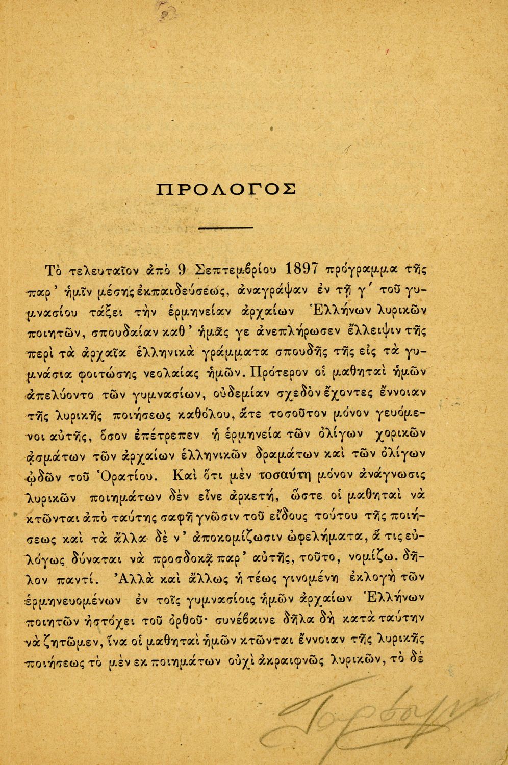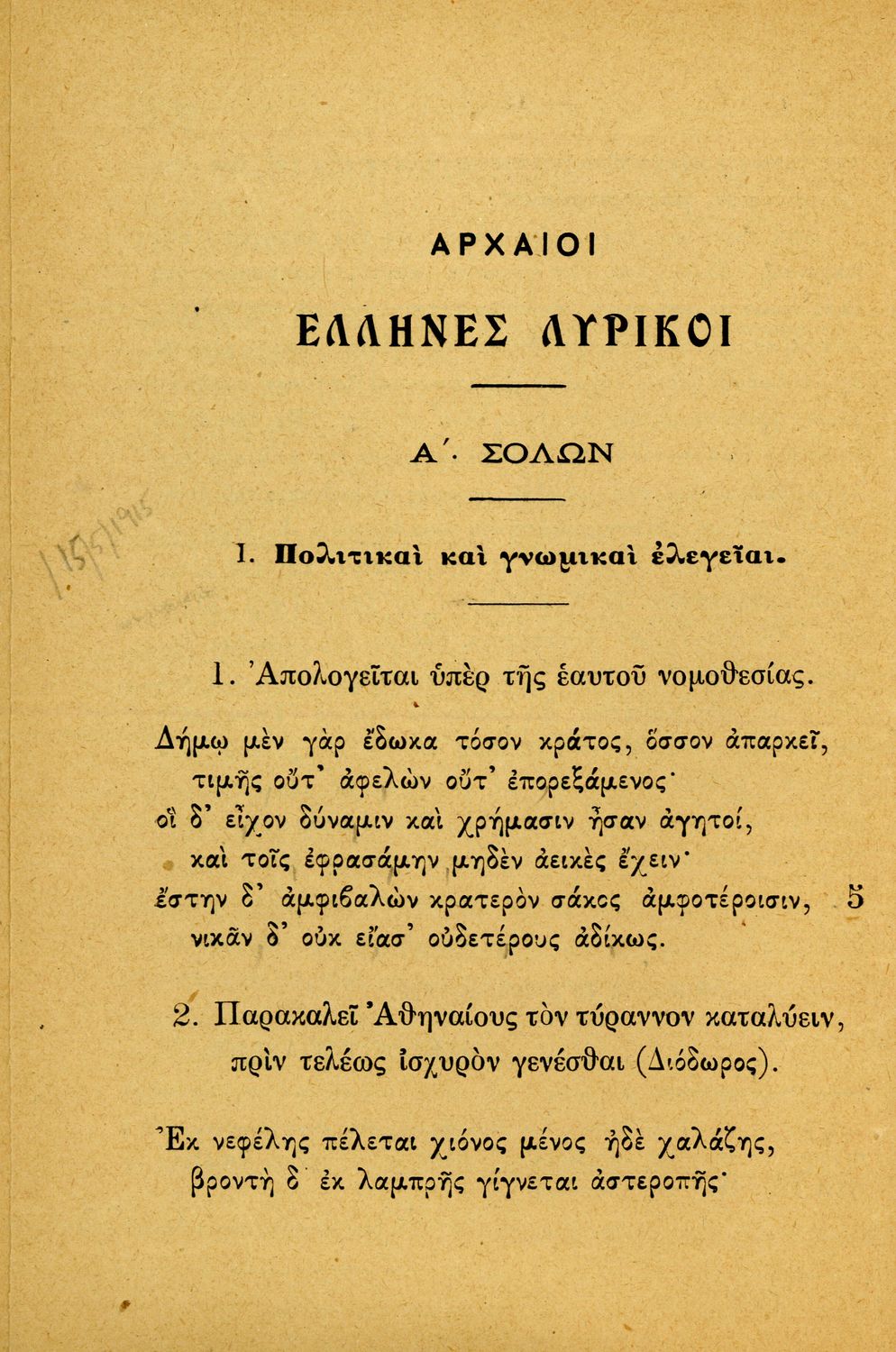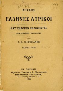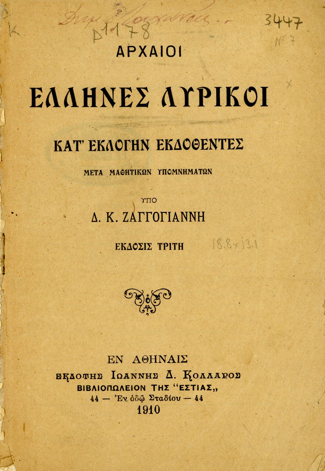 Τίτλος: Αρχαίοι Έλληνες λυρικοί κατ' εκλογήν εκδοθέντες μετά μαθητικών υπομνημάτων