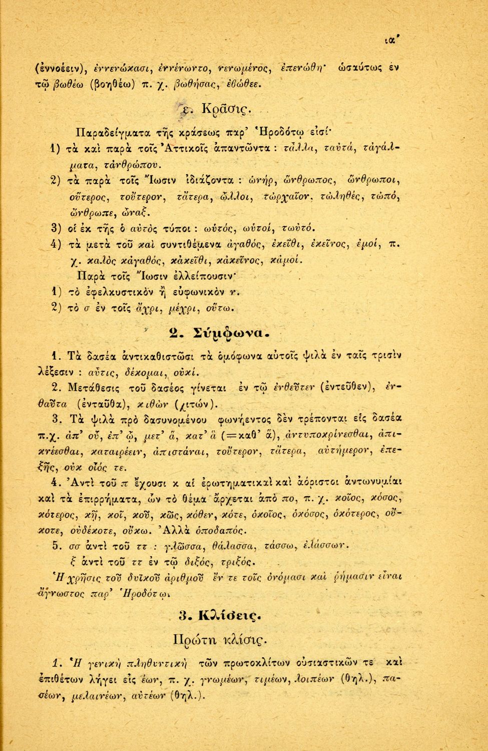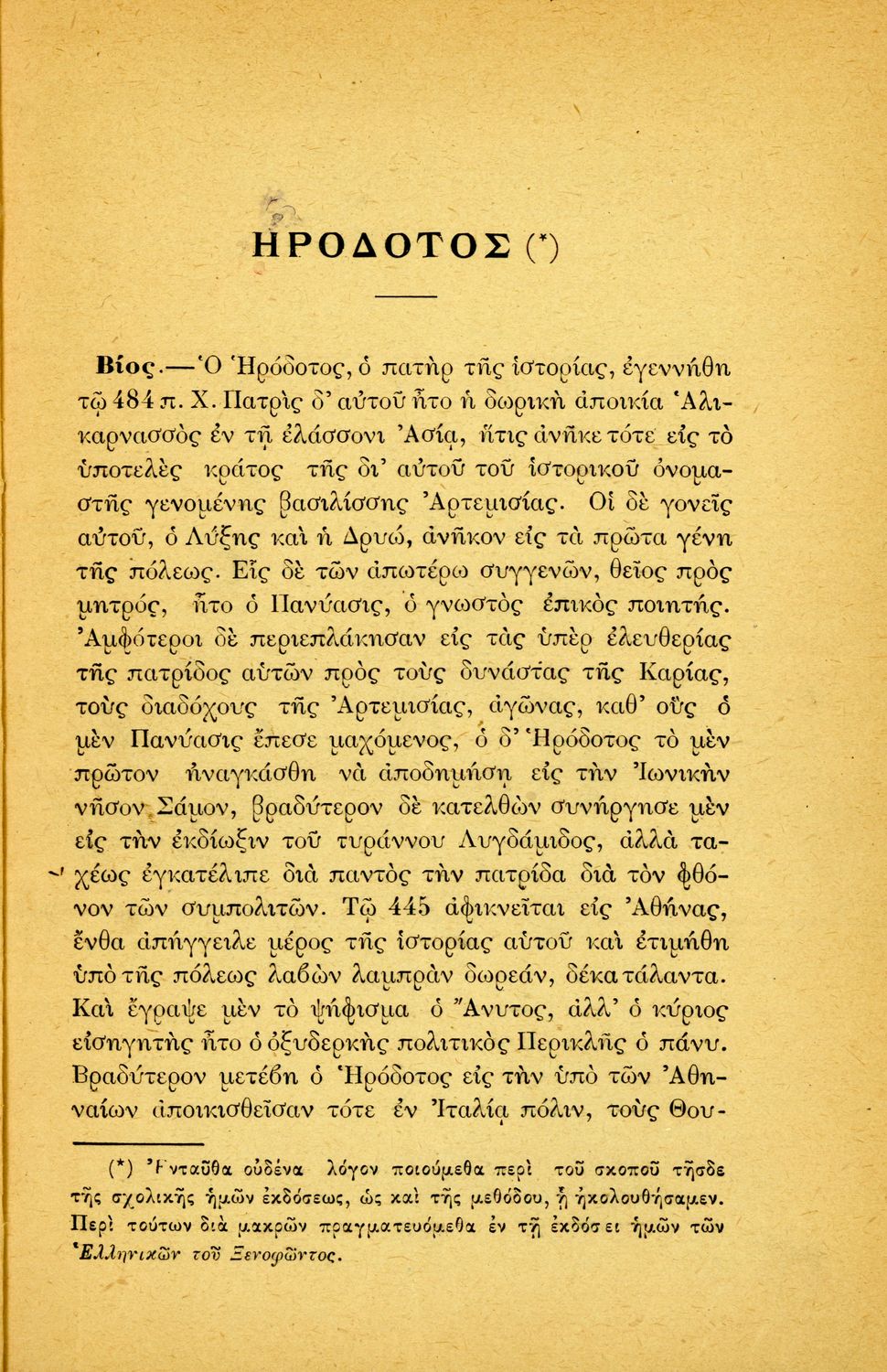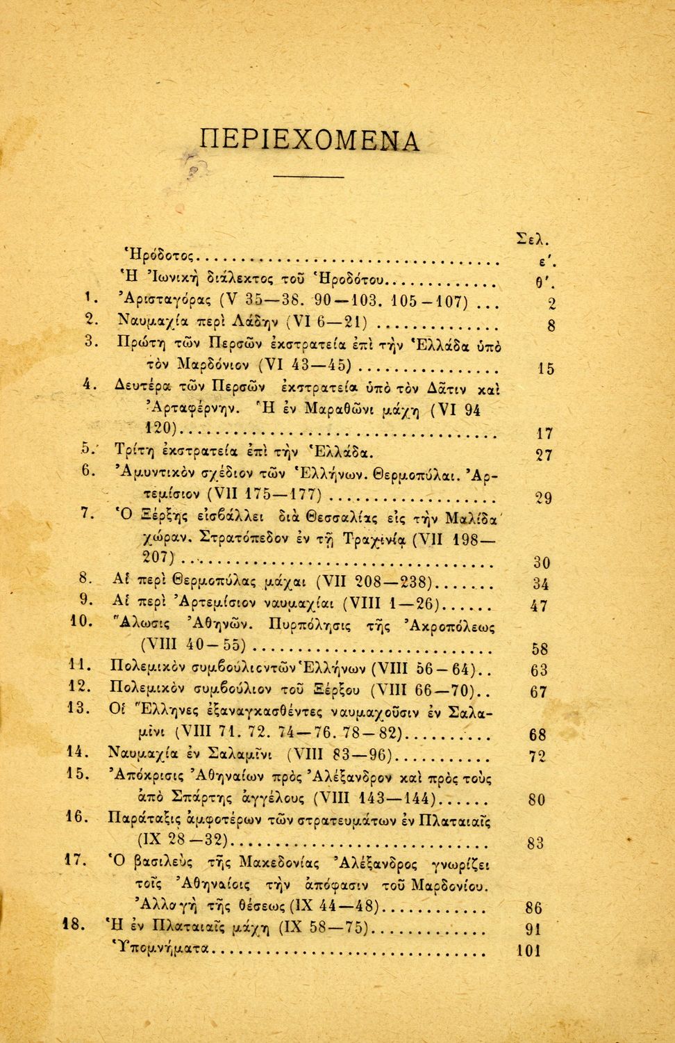 Σχολικό εγχειρίδιο Αρχαίων Ελληνικών Α΄ Γυμνασίου και Α' Διδασκαλείου που περιλαμβάνει αποσπάσματα από το έργο του Ηρόδοτου, ερμηνευτικές σημειώσεις, πραγματολογικά, λεξικολογικά και γραμματικά σχόλια.