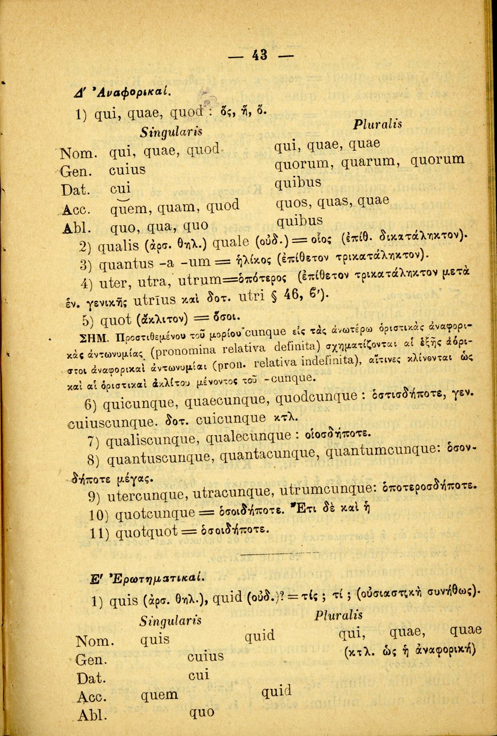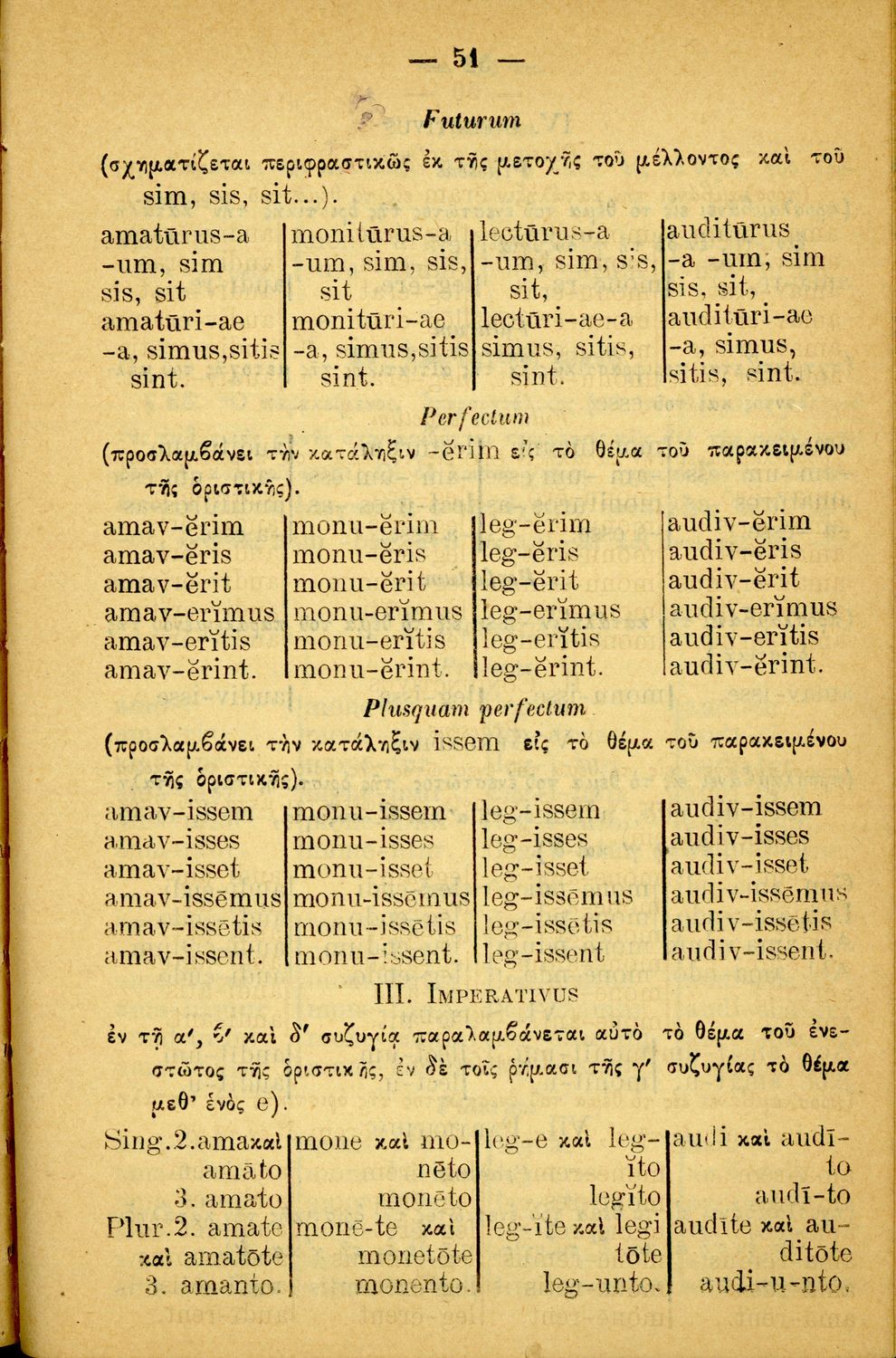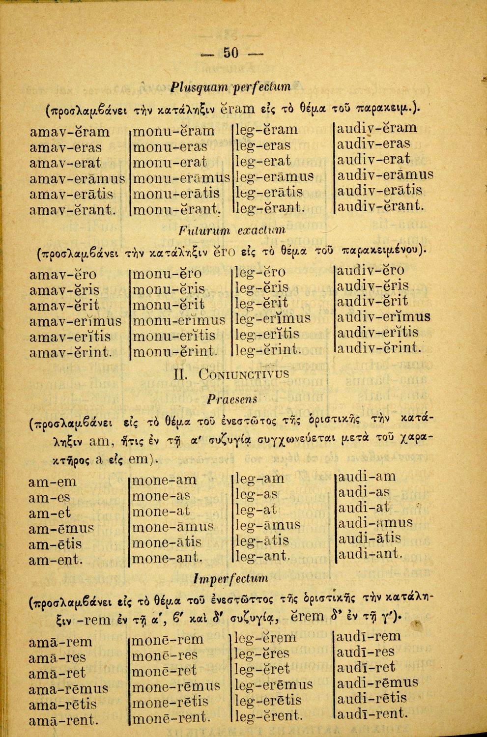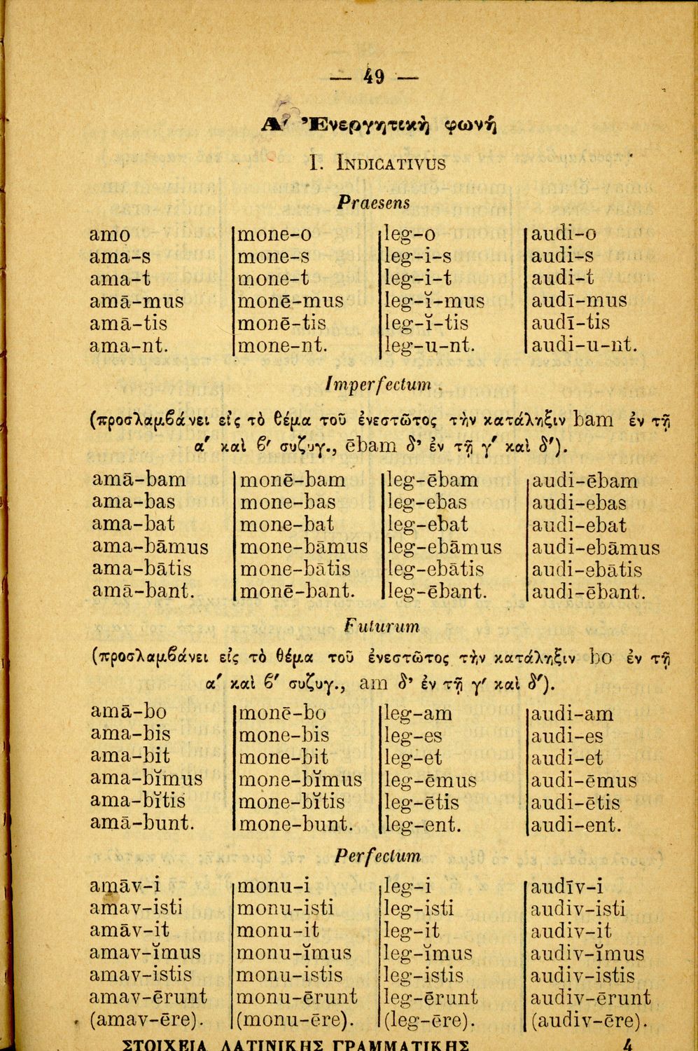 Σχολικό εγχειρίδιο Λατινικών για τα Ελληνικά Σχολεία που περιλαμβάνει τη γραμματική της λατινικής γλώσσας.