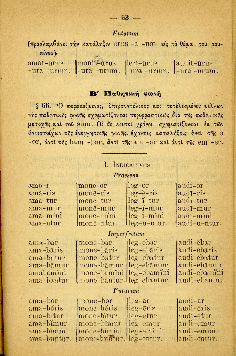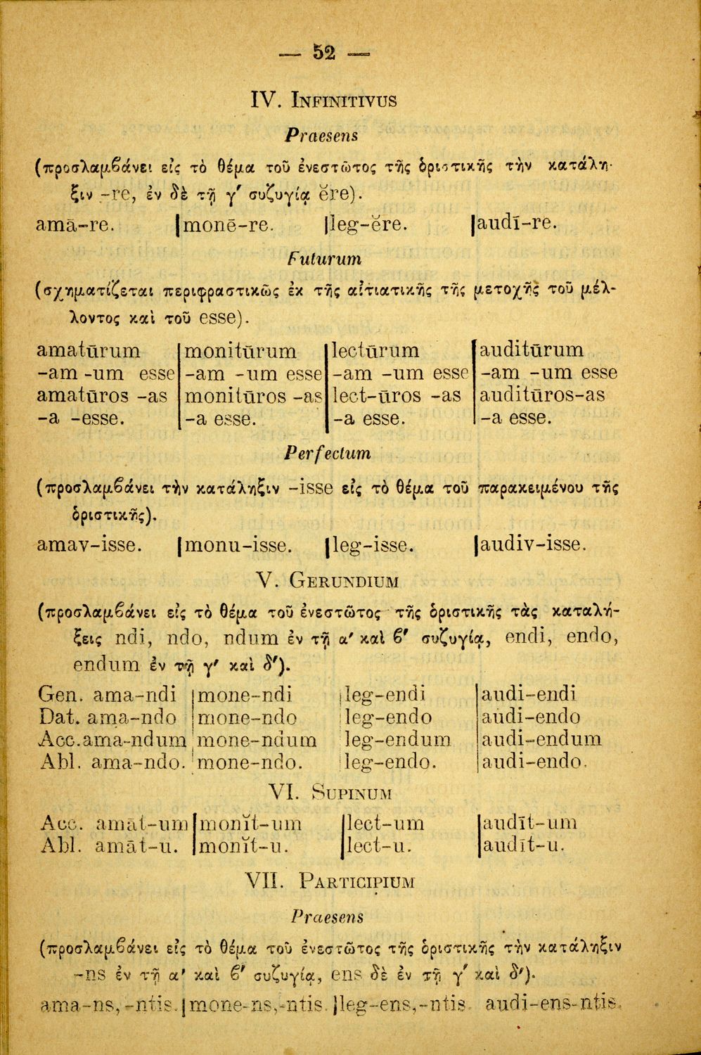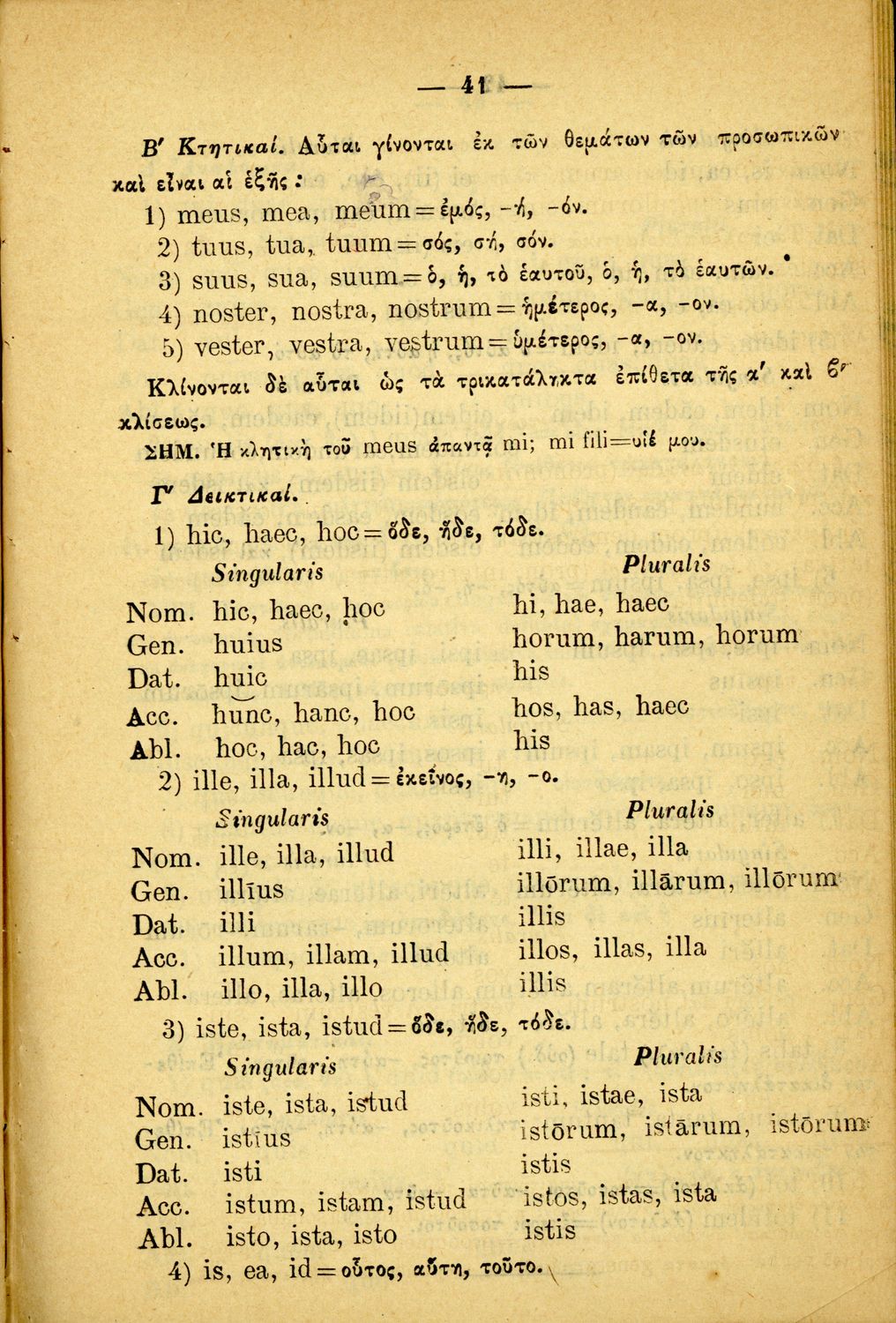 Σχολικό εγχειρίδιο Λατινικών για τα Ελληνικά Σχολεία που περιλαμβάνει τη γραμματική της λατινικής γλώσσας.