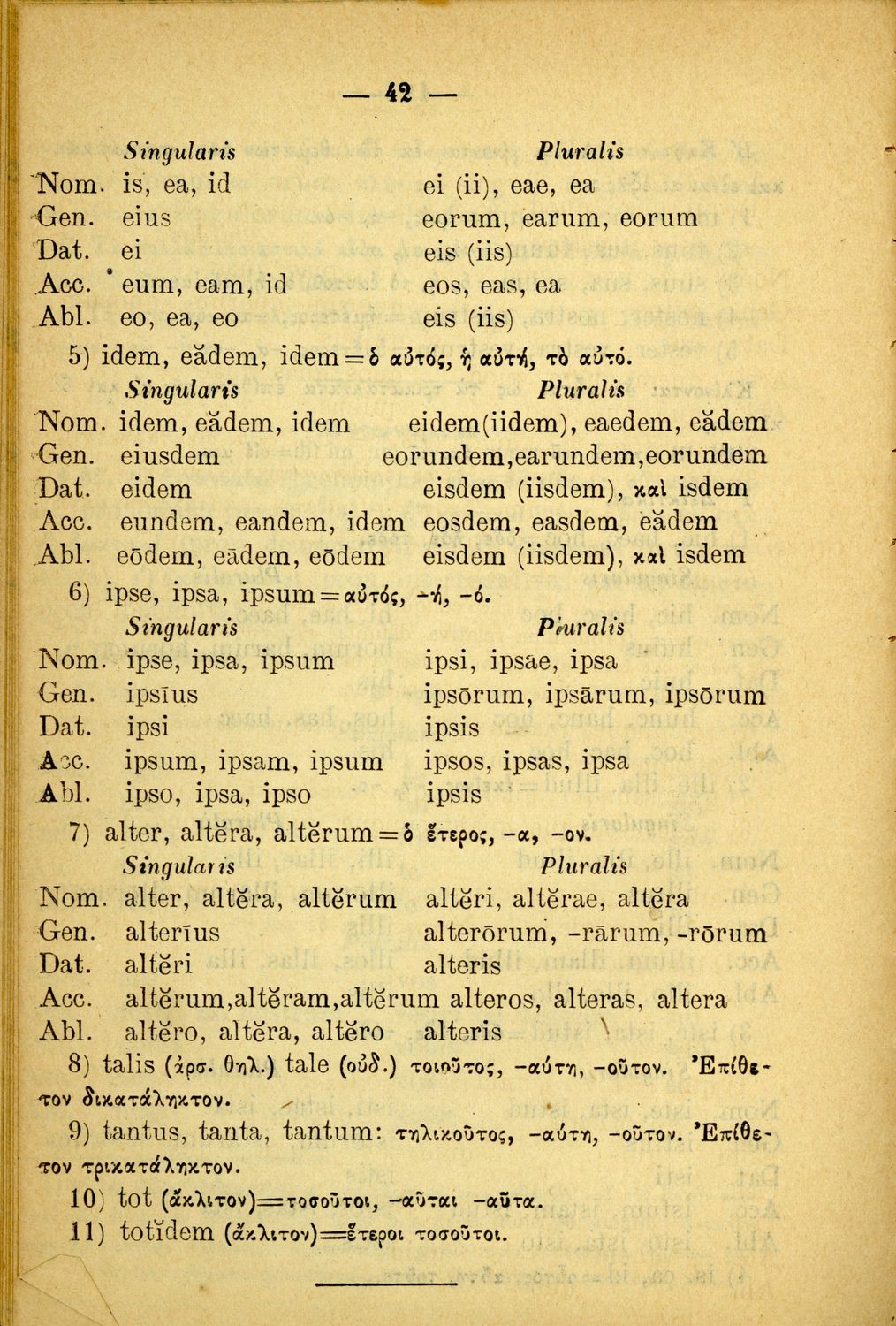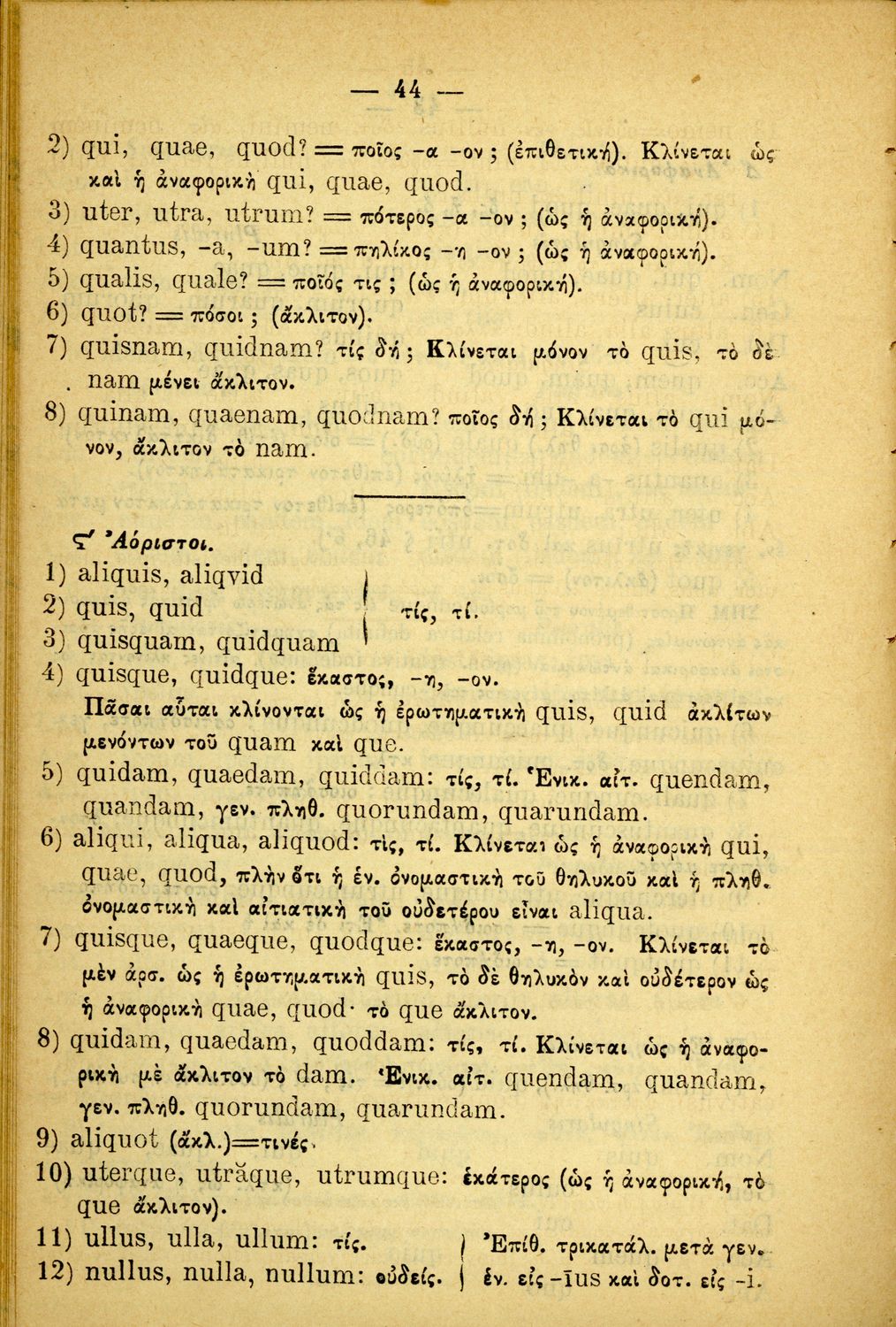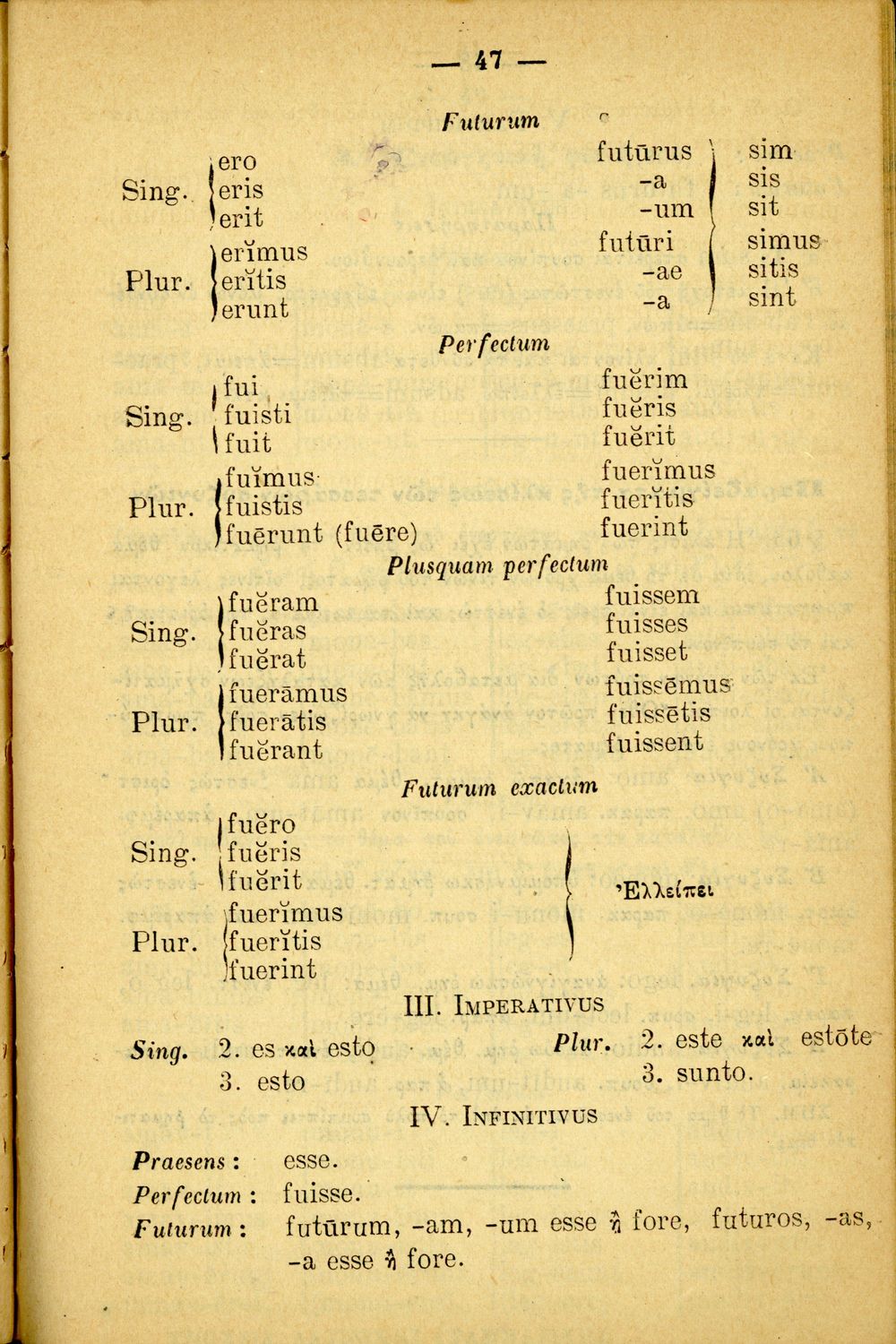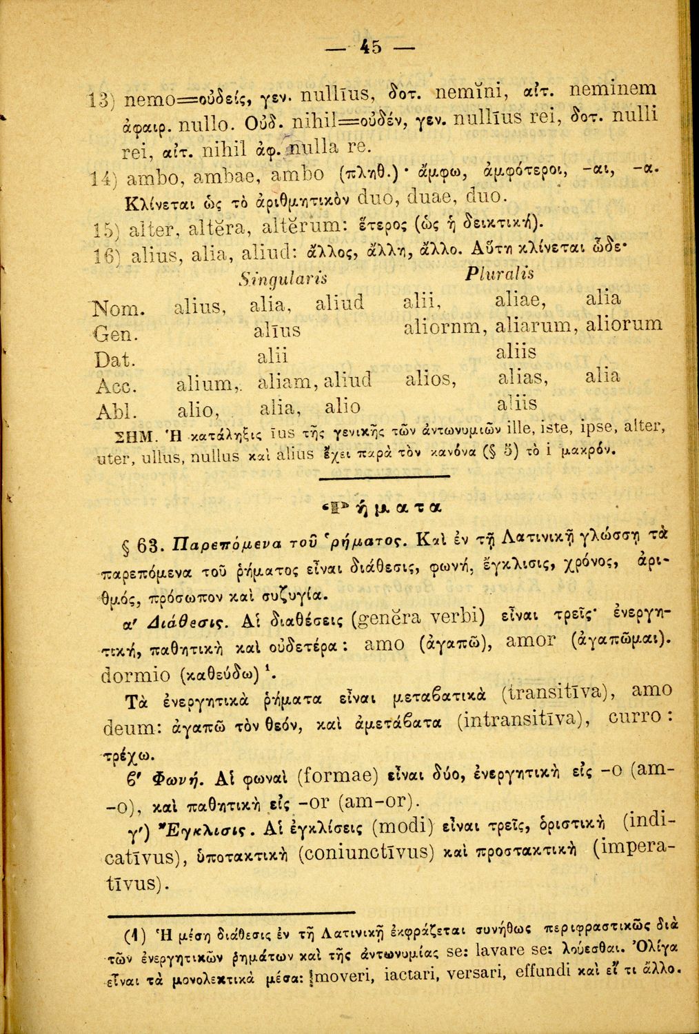 Σχολικό εγχειρίδιο Λατινικών για τα Ελληνικά Σχολεία που περιλαμβάνει τη γραμματική της λατινικής γλώσσας.