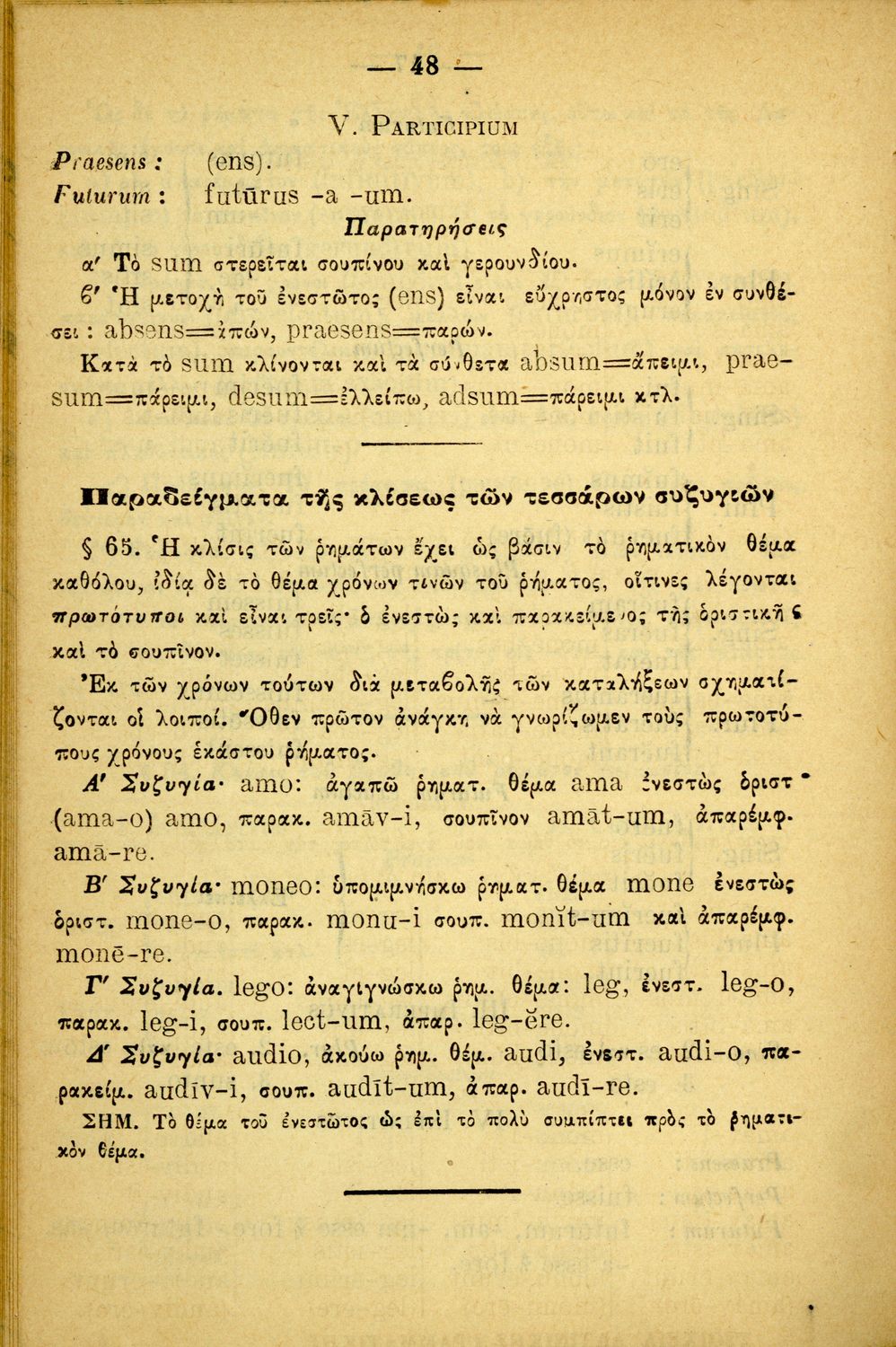 Γραμματικής της λατινικής γλώσσας για τα Ελληνικά Σχολεία και Γυμνάσια που περιέχει δύο τμήματα: το τεχνολογικό που εστιάζει στα μέρη του λόγου και το συντακτικό που ασχολείται με τις πτώσεις, τις εγκλίσεις, ...