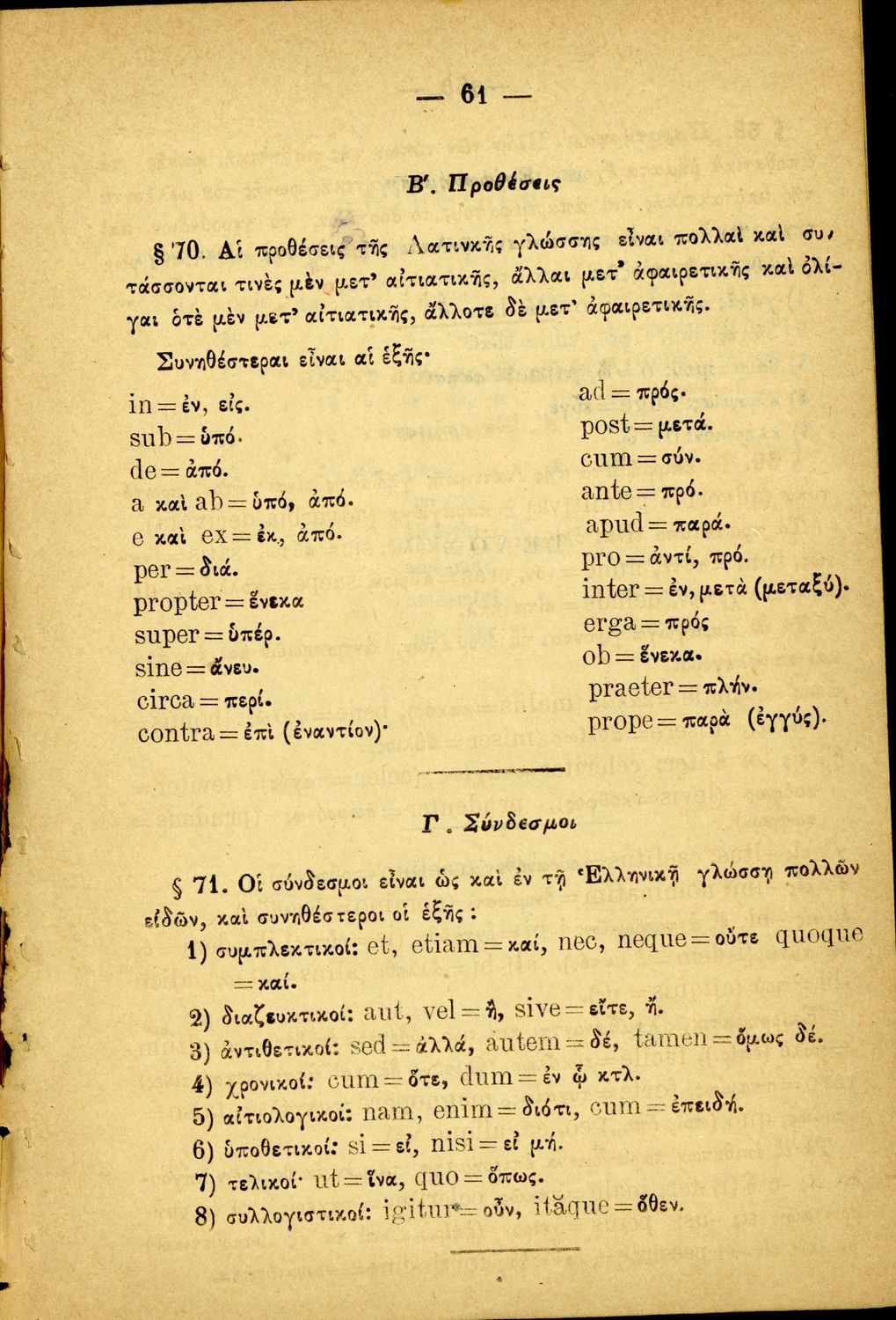 Γραμματικής της λατινικής γλώσσας για τα Ελληνικά Σχολεία και Γυμνάσια που περιέχει δύο τμήματα: το τεχνολογικό που εστιάζει στα μέρη του λόγου και το συντακτικό που ασχολείται με τις πτώσεις, τις εγκλίσεις, ...