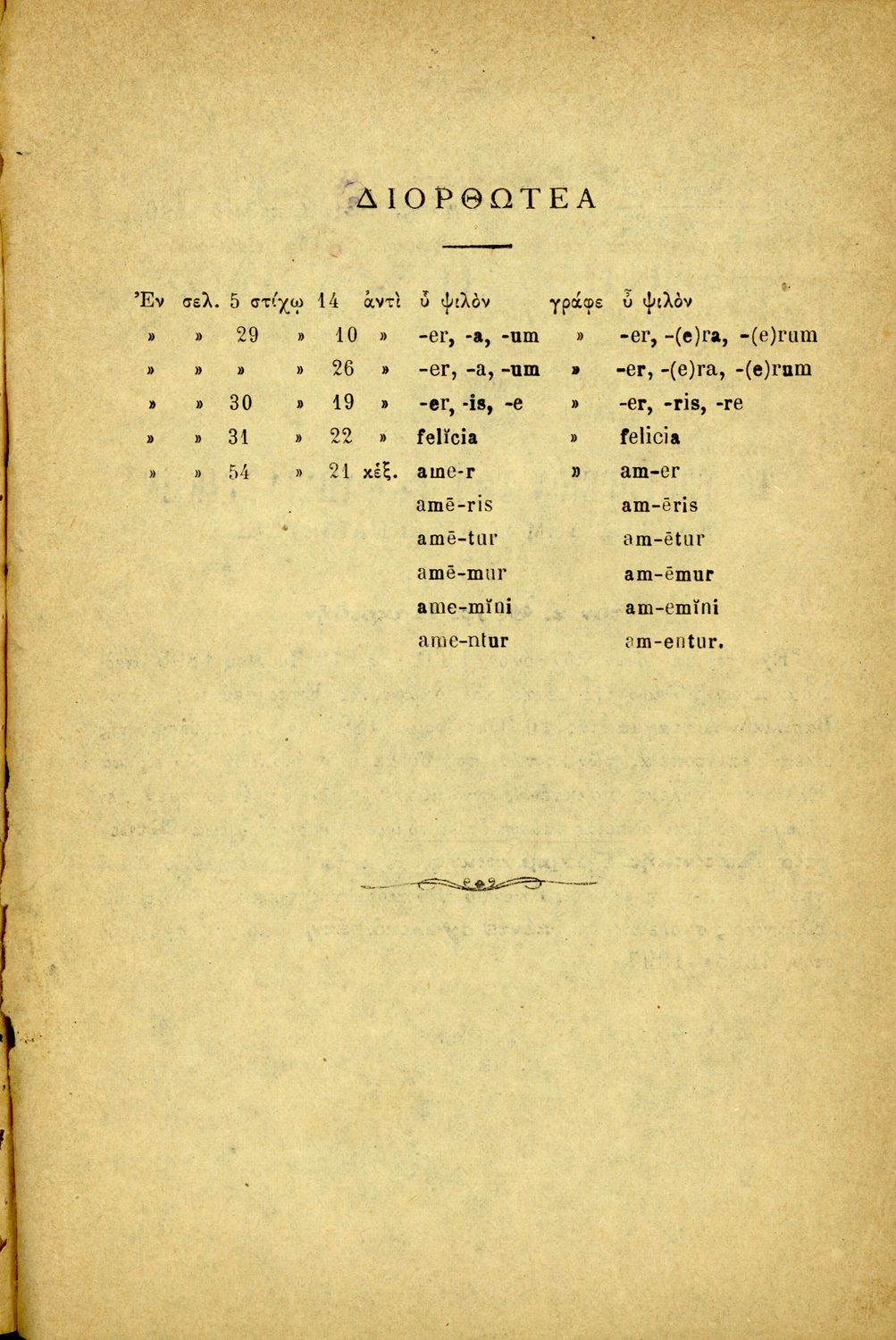 Σχολικό εγχειρίδιο Λατινικών για τα Ελληνικά Σχολεία που περιλαμβάνει τη γραμματική της λατινικής γλώσσας.