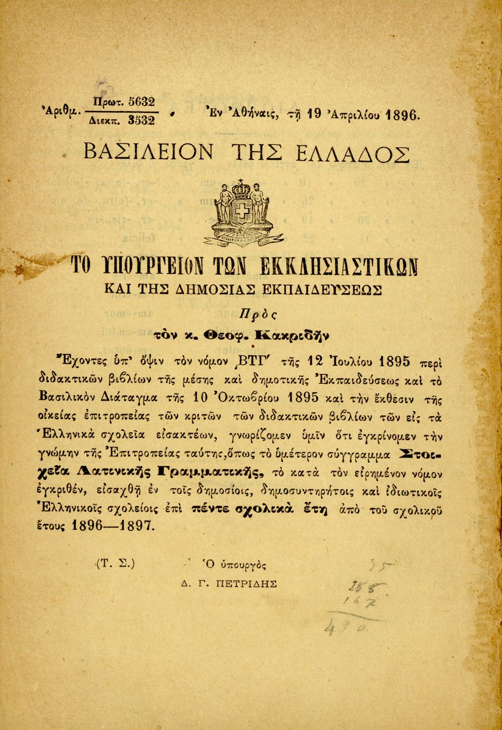Τίτλος: Στοιχεία λατινικής γραμματικής προς χρήσιν των Ελληνικών Σχολείων