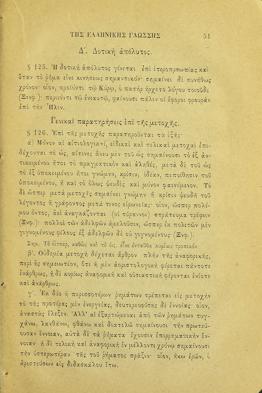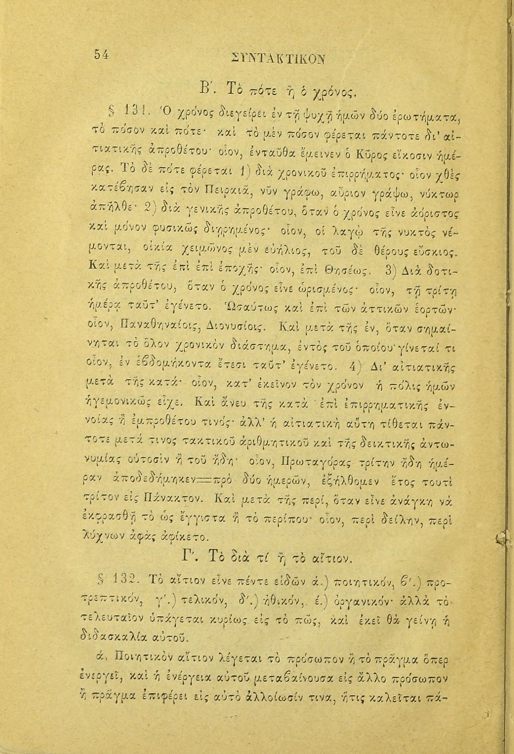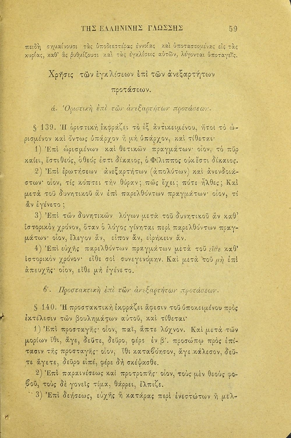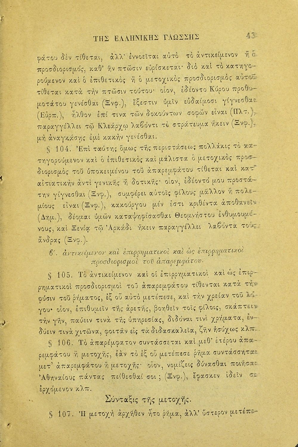 Σχολικό εγχειρίδιο Αρχαίων Ελληνικών για τα Ελληνικά Σχολεία και τα Ανώτερα Παρθεναγωγεία που εξετάζει τα μέρη του λόγου και την σύνταξή τους.
