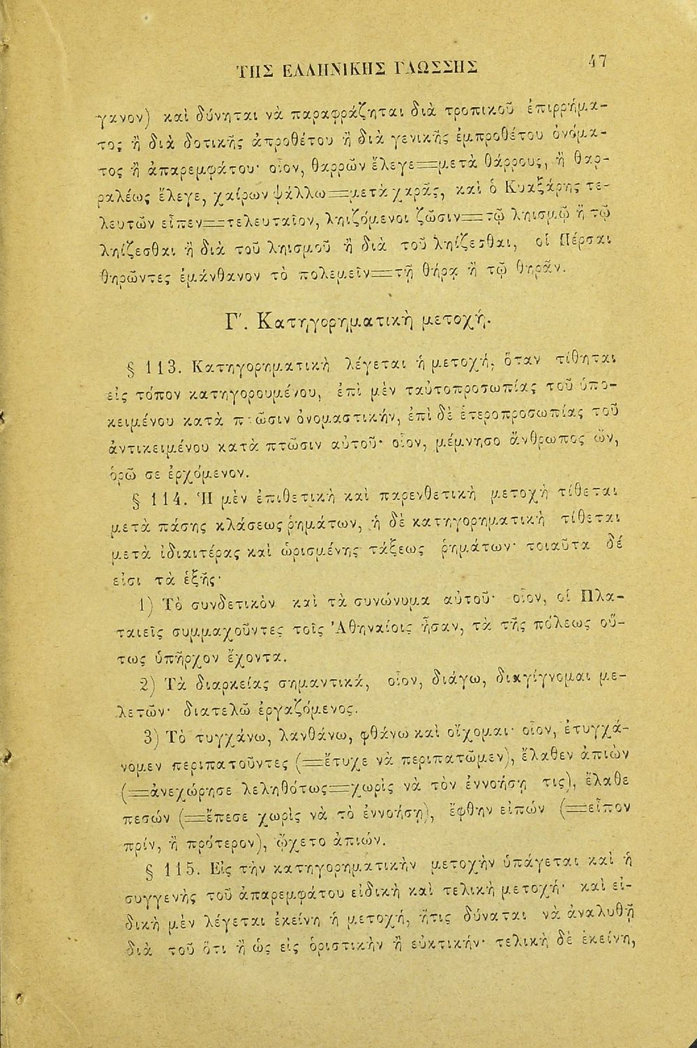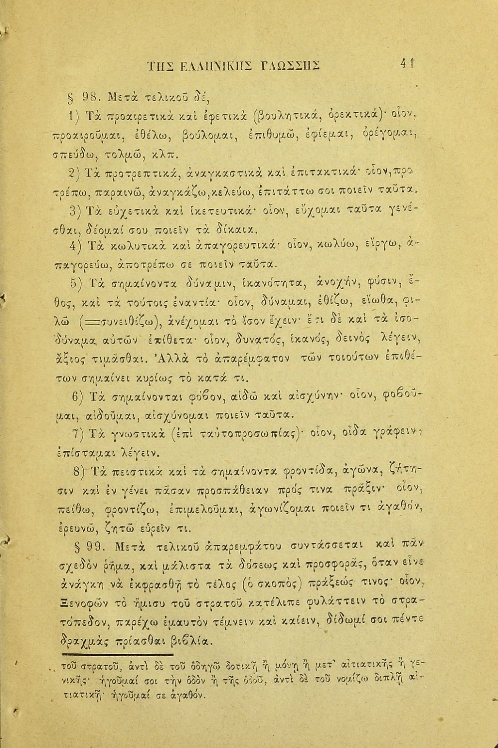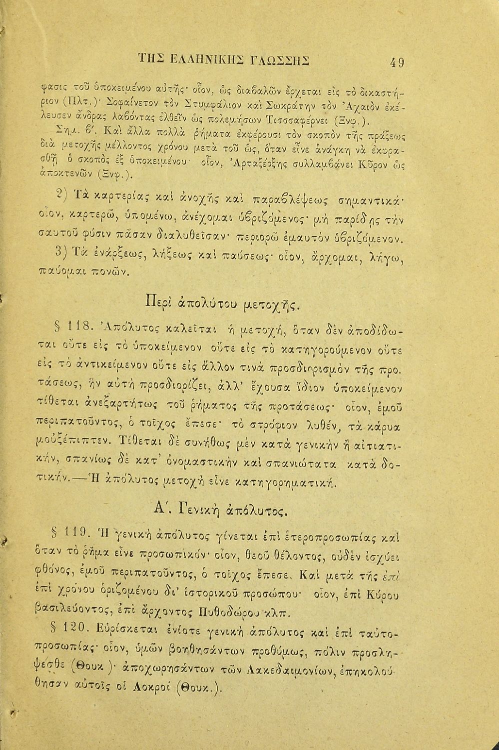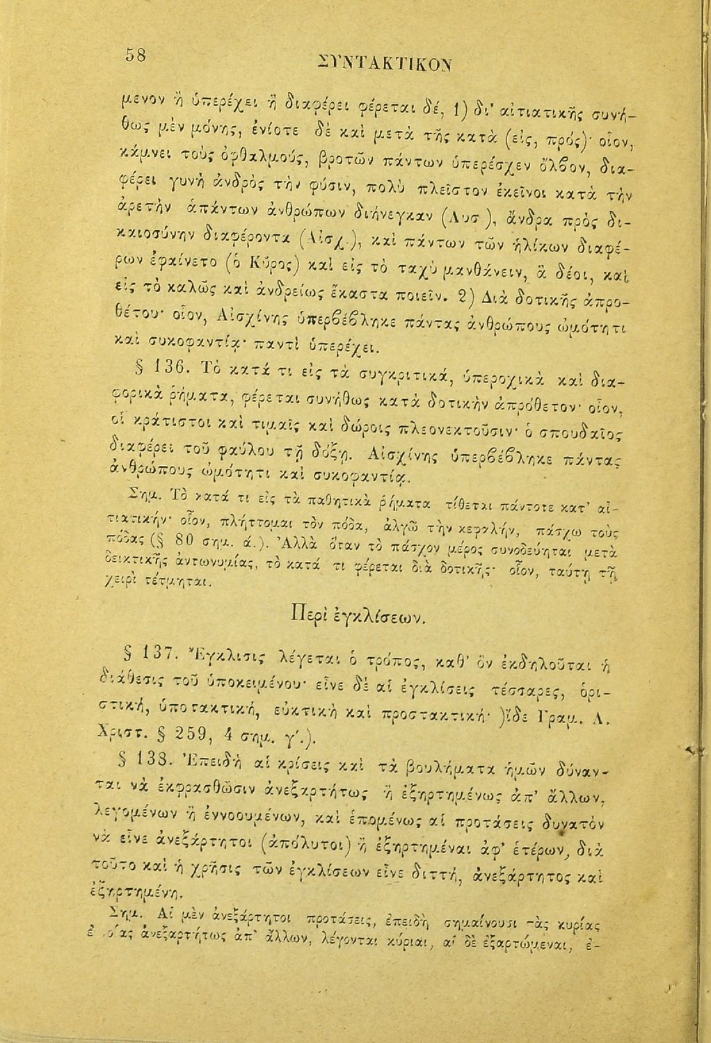 Σχολικό εγχειρίδιο Αρχαίων Ελληνικών για τα Ελληνικά Σχολεία και τα Ανώτερα Παρθεναγωγεία που εξετάζει τα μέρη του λόγου και την σύνταξή τους.