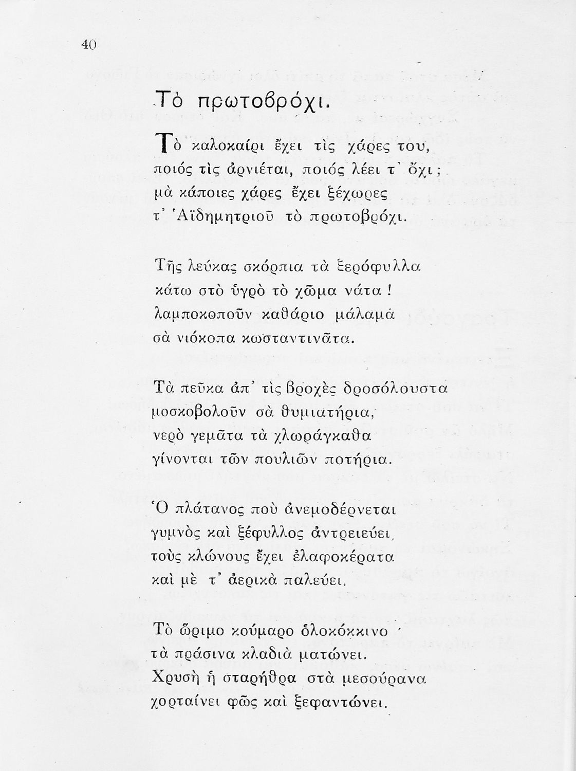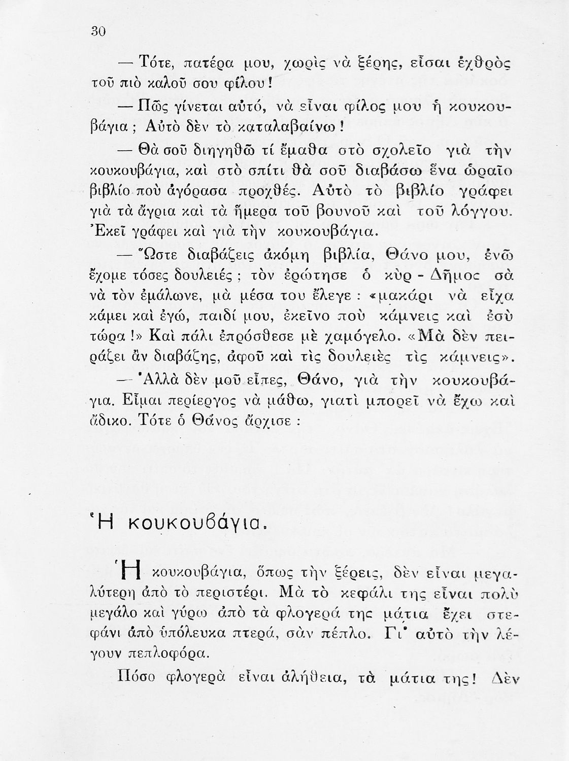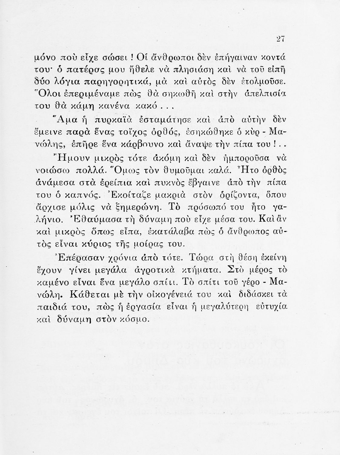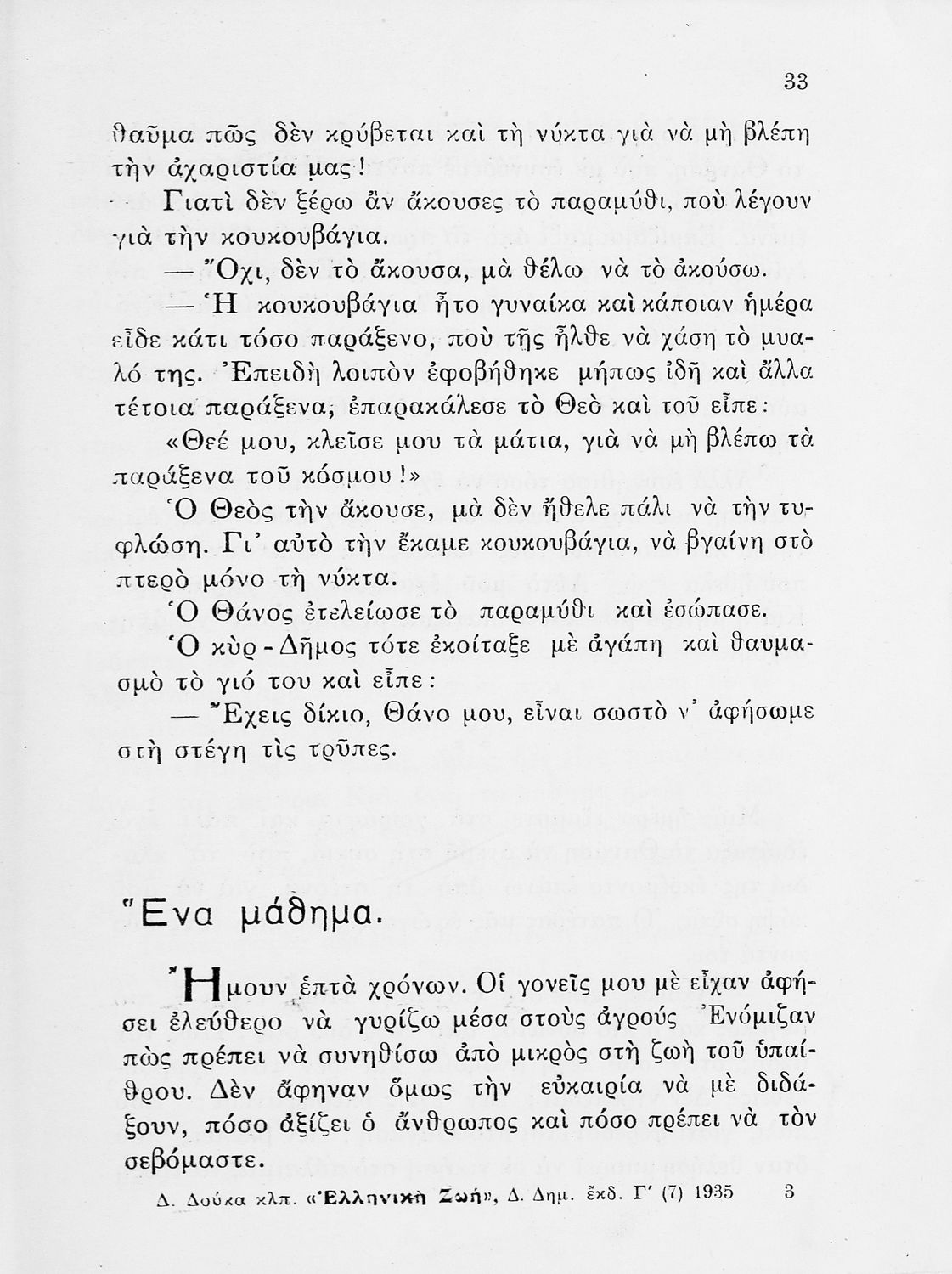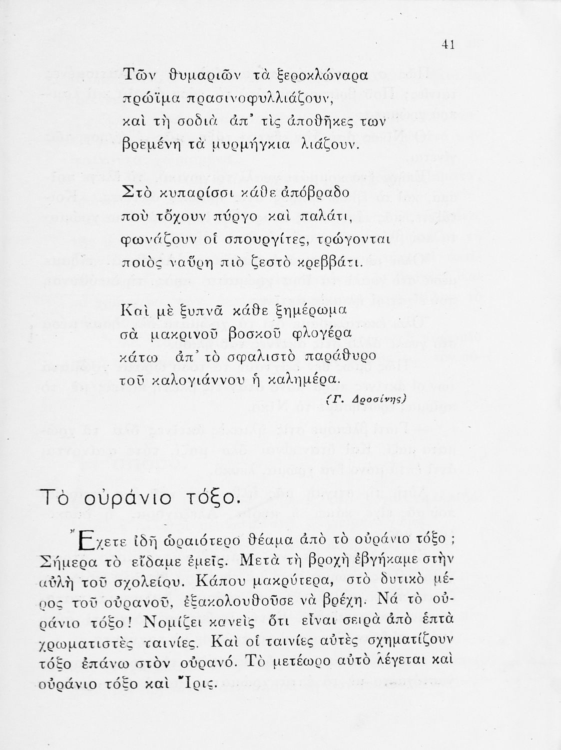 Αναγνωστικό Δ΄ Δημοτικού που περιέχει πεζά και ποιήματα με περιεχόμενο διδακτικό και ηθικοπλαστικό εμπνευσμένα από την ελληνική ιστορία και μυθολογία, και την αγροτική και κοινωνική ζωή.
