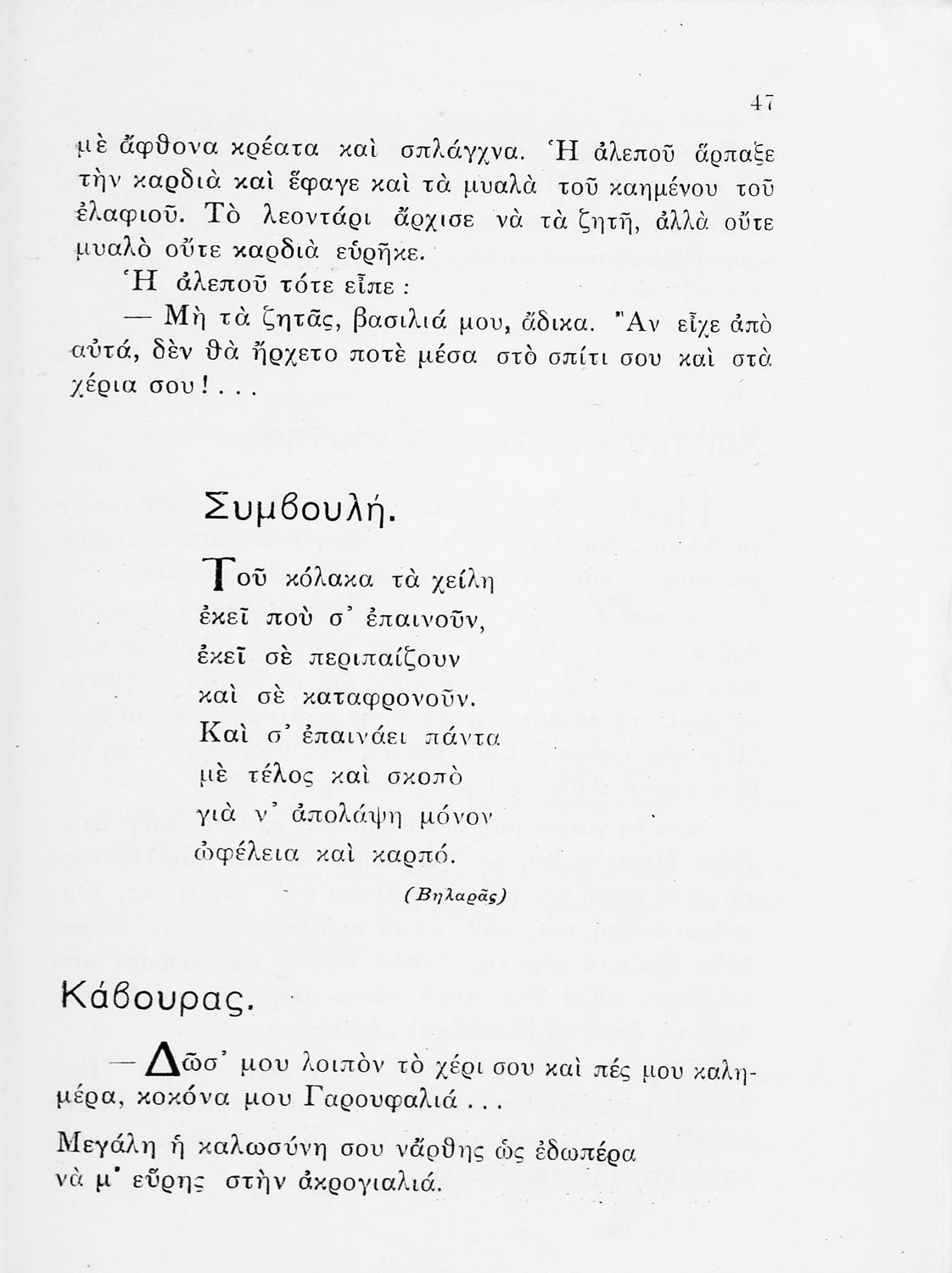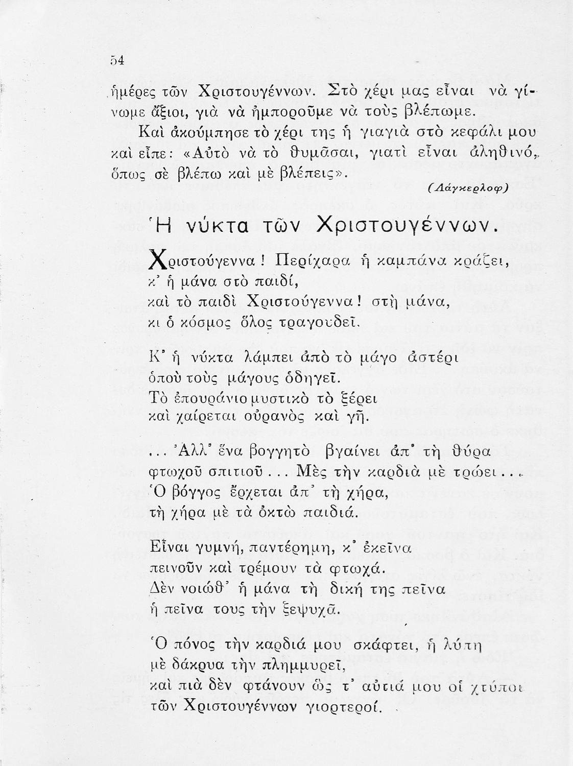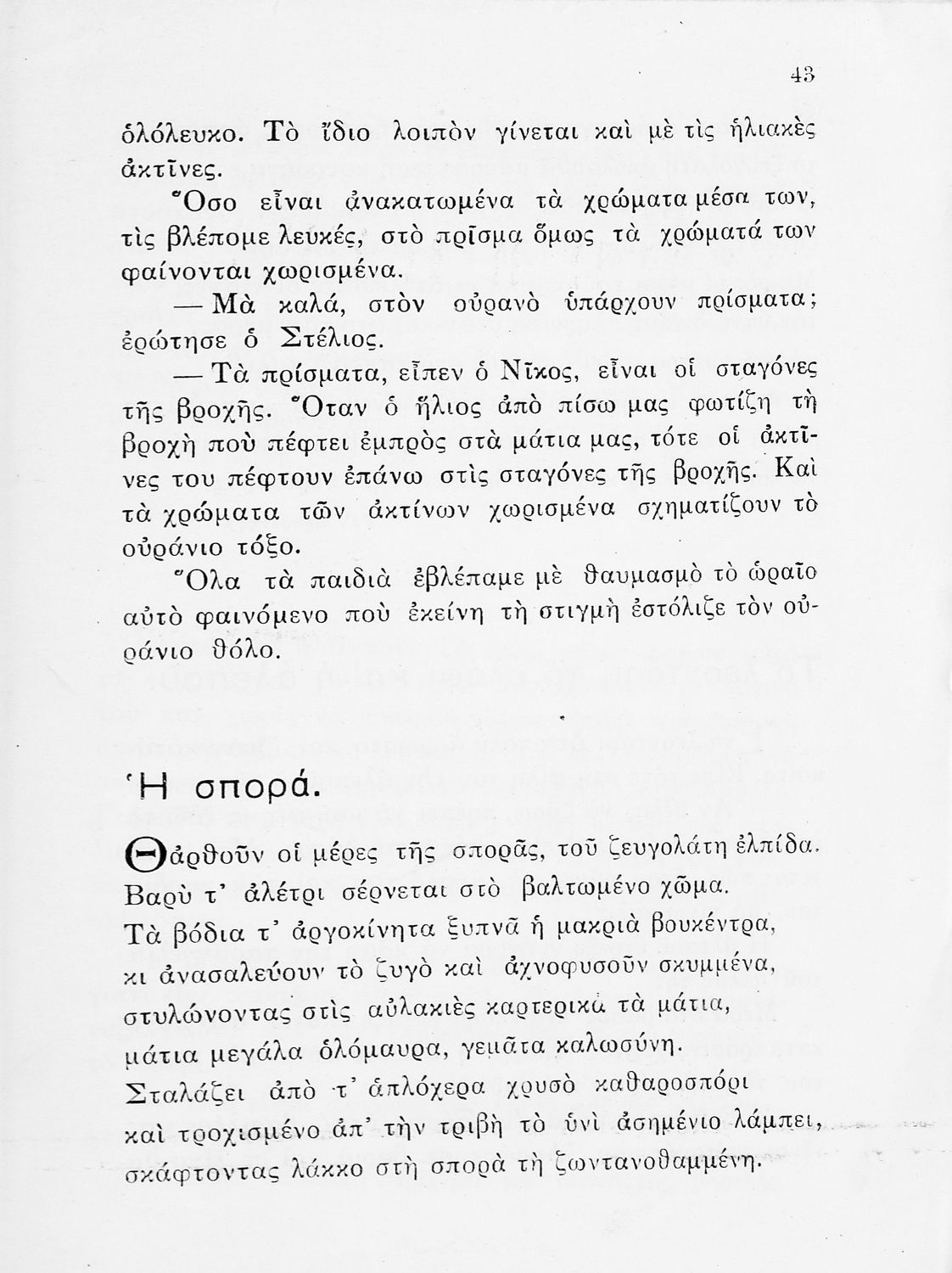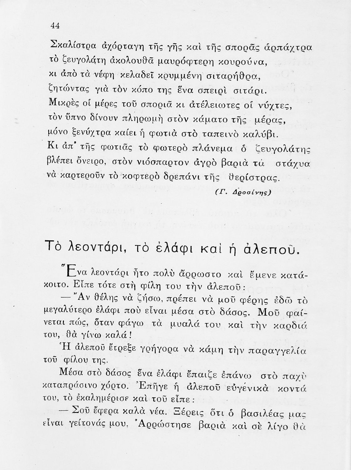 Αναγνωστικό Δ΄ Δημοτικού που περιέχει πεζά και ποιήματα με περιεχόμενο διδακτικό και ηθικοπλαστικό εμπνευσμένα από την ελληνική ιστορία και μυθολογία, και την αγροτική και κοινωνική ζωή.