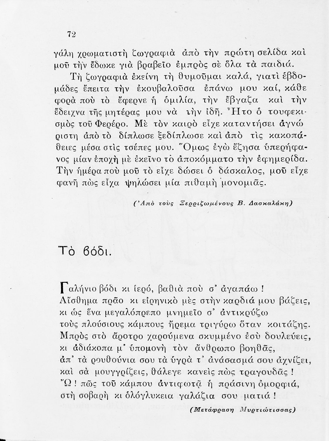 Αναγνωστικό Δ΄ Δημοτικού που περιέχει πεζά και ποιήματα με περιεχόμενο διδακτικό και ηθικοπλαστικό εμπνευσμένα από την ελληνική ιστορία και μυθολογία, και την αγροτική και κοινωνική ζωή.