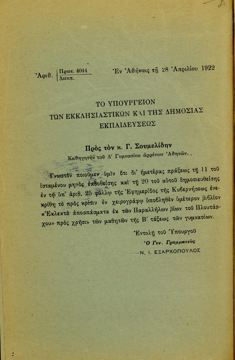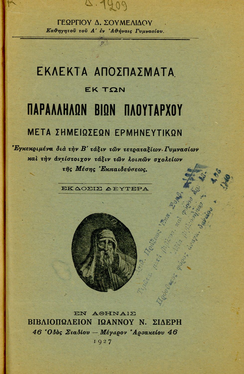 Τίτλος: Εκλεκτά αποσπάσματα εκ των Παράλληλων Βίων του Πλουτάρχου μετά σημειώσεων ερμηνευτικών εγκεκριμένα διά την Β΄ τάξιν των Τετραταξίων Γυμνασίων και την αντίστοιχον τάξιν των λοιπών σχολείων της Μέσης Εκπαιδεύσεως