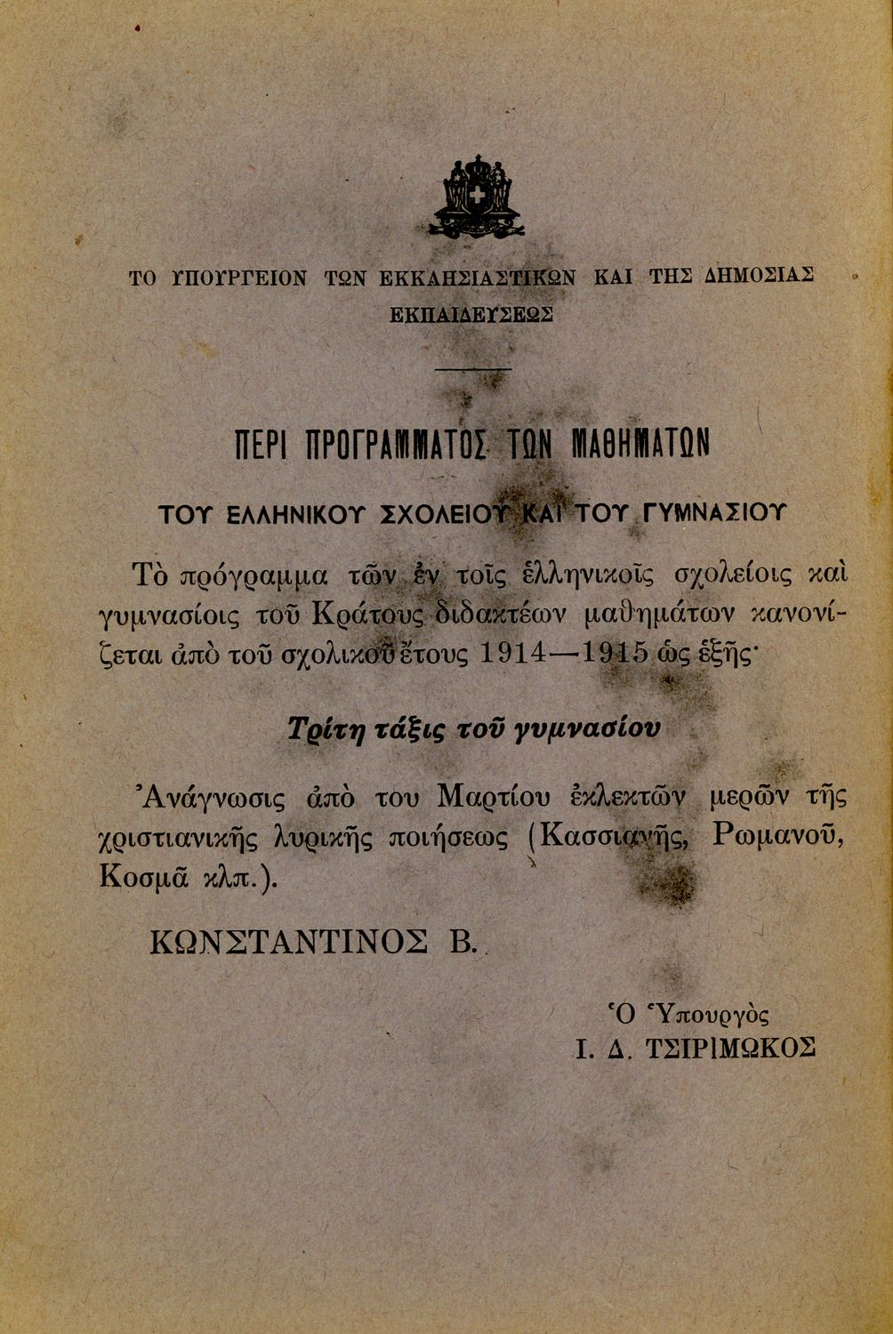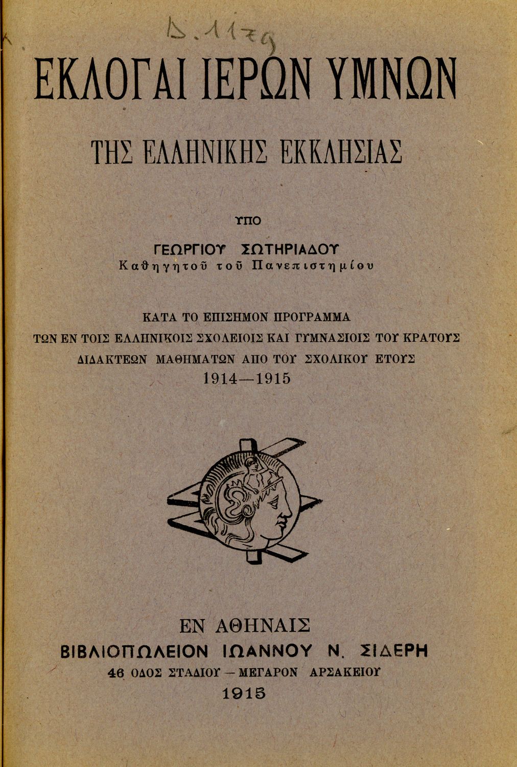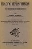 Τίτλος: Εκλογαί ιερών ύμνων της ελληνικής εκκλησίας κατά το επίσημον πρόγραμμα των εν τοις Ελληνικοίς Σχολείοις και Γυμνασίοις του κράτους διδακτέων μαθημάτων από του σχολικού έτους 1914 - 1915