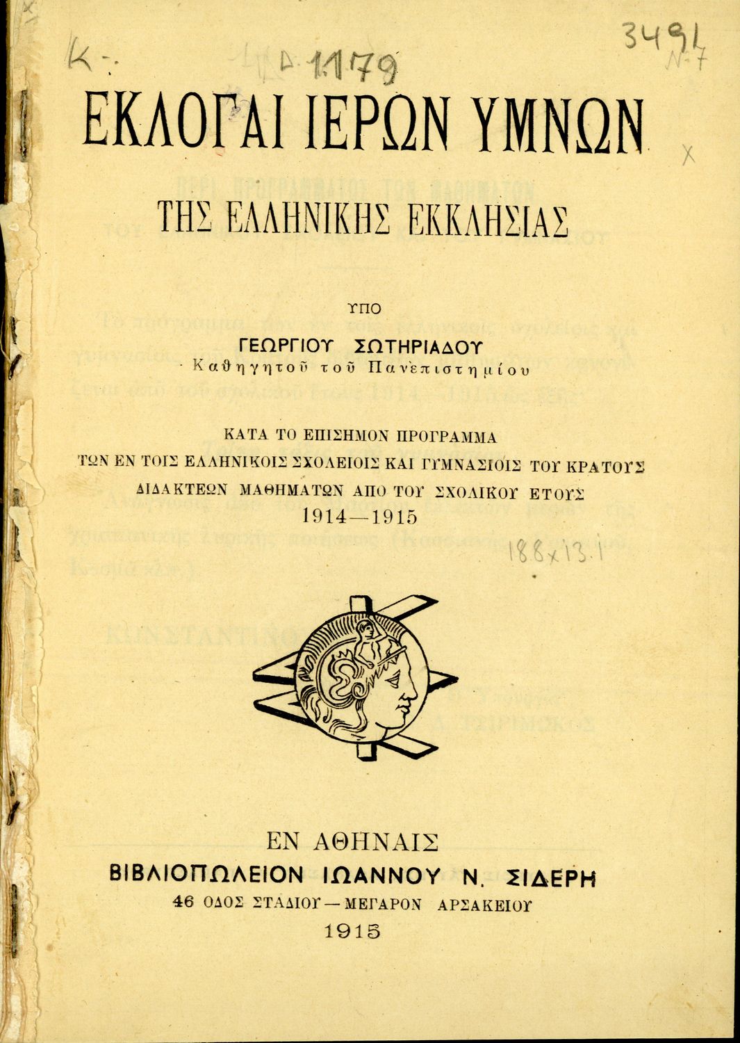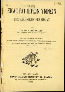 Κωδικός αναγνώρισης: 20-03491 Τίτλος: Εκλογαί ιερών ύμνων της ελληνικής εκκλησίας κατά το επίσημον πρόγραμμα των εν τοις Ελληνικοίς Σχολείοις και Γυμνασίοις του κράτους διδακτέων μαθημάτων από του σχολικού έτους 1914 - 1915 Συγγραφέας: Γεώργιος Σωτηριάδης Μέγεθος και υπόστρωμα: Σχολικό εγχειρίδιο, 18εκ., μαλακό εξώφυλλο, 64 σελίδες. |
