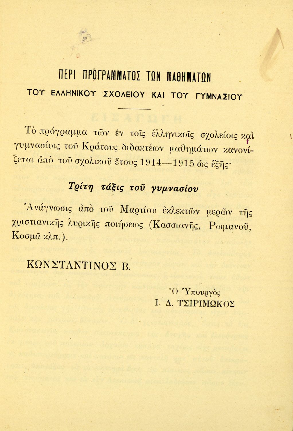 Βαθμίδα εκπαίδευσης: Δευτεροβάθμια Τάξη: Ελληνικό Σχολείο / Γ' Γυμνασίου Μάθημα: Θρησκευτικά Γλώσσα: Καθαρεύουσα Παρουσίαση περιεχομένου: Σχολικό εγχειρίδιο Θρησκευτικών για τα Ελληνικά Σχολεία και τη Γ΄ Γυμνασίου που περιλαμβάνει αποσπάσματα ύμνων και ψαλμωδιών της Ορθόδοξης Εκκλησίας, ερμηνευτικές σημειώσεις και πραγματολογικά και γλωσσικά σχόλια. |
