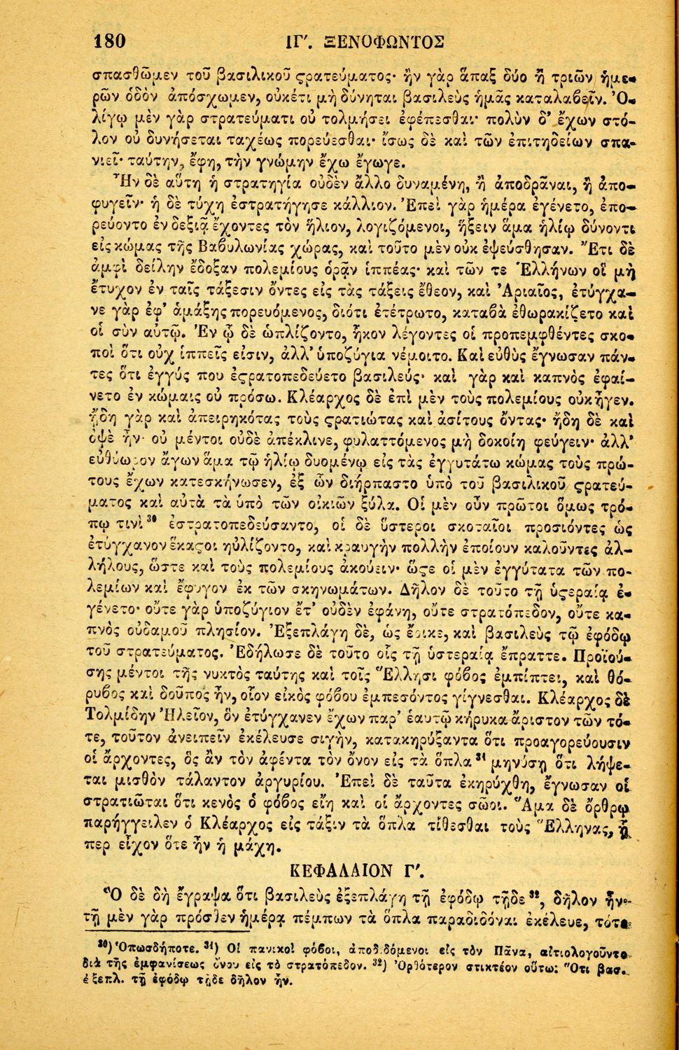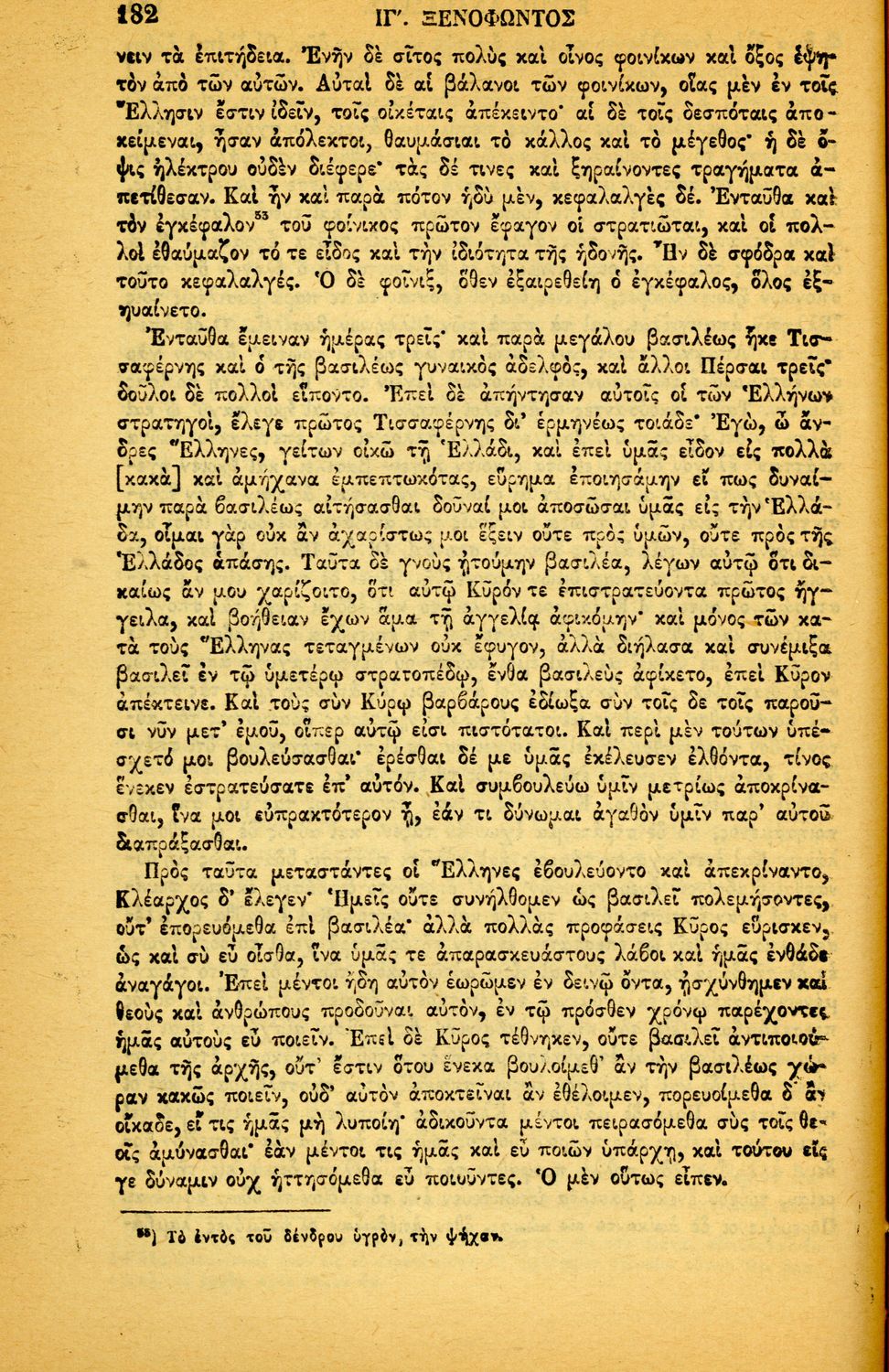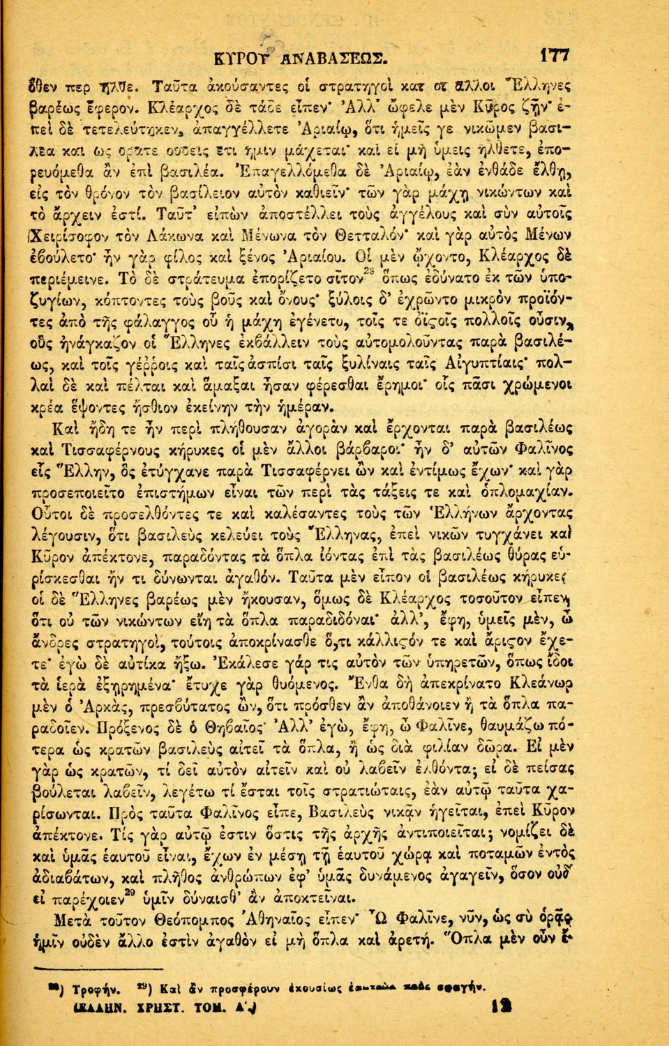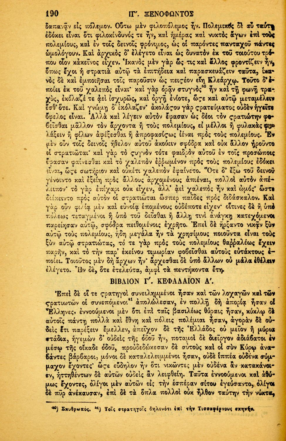 Σχολικό εγχειρίδιο Αρχαίων Ελληνικών για τα Ελληνικά Σχολεία και Παρθεναγωγεία που περιλαμβάνει αποσπάσματα από τα έργα του Ξενοφώντα Ελληνικά και Κύρου Παιδεία και λεξικολογικές παρατηρήσεις.