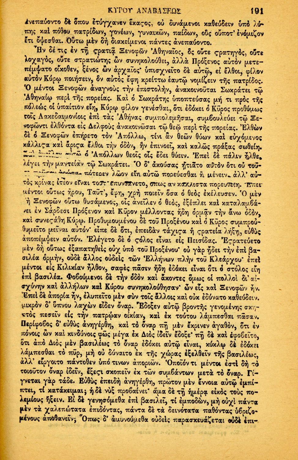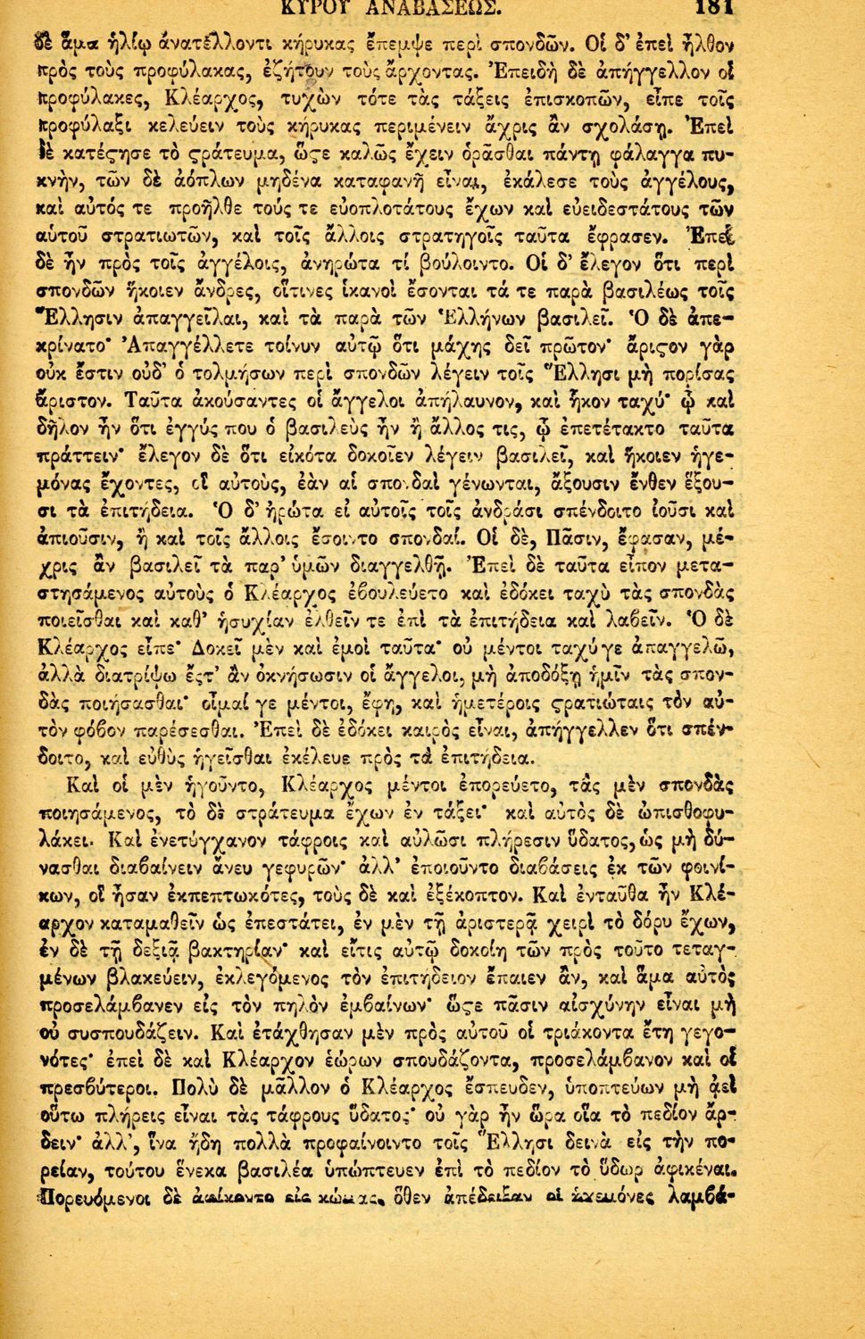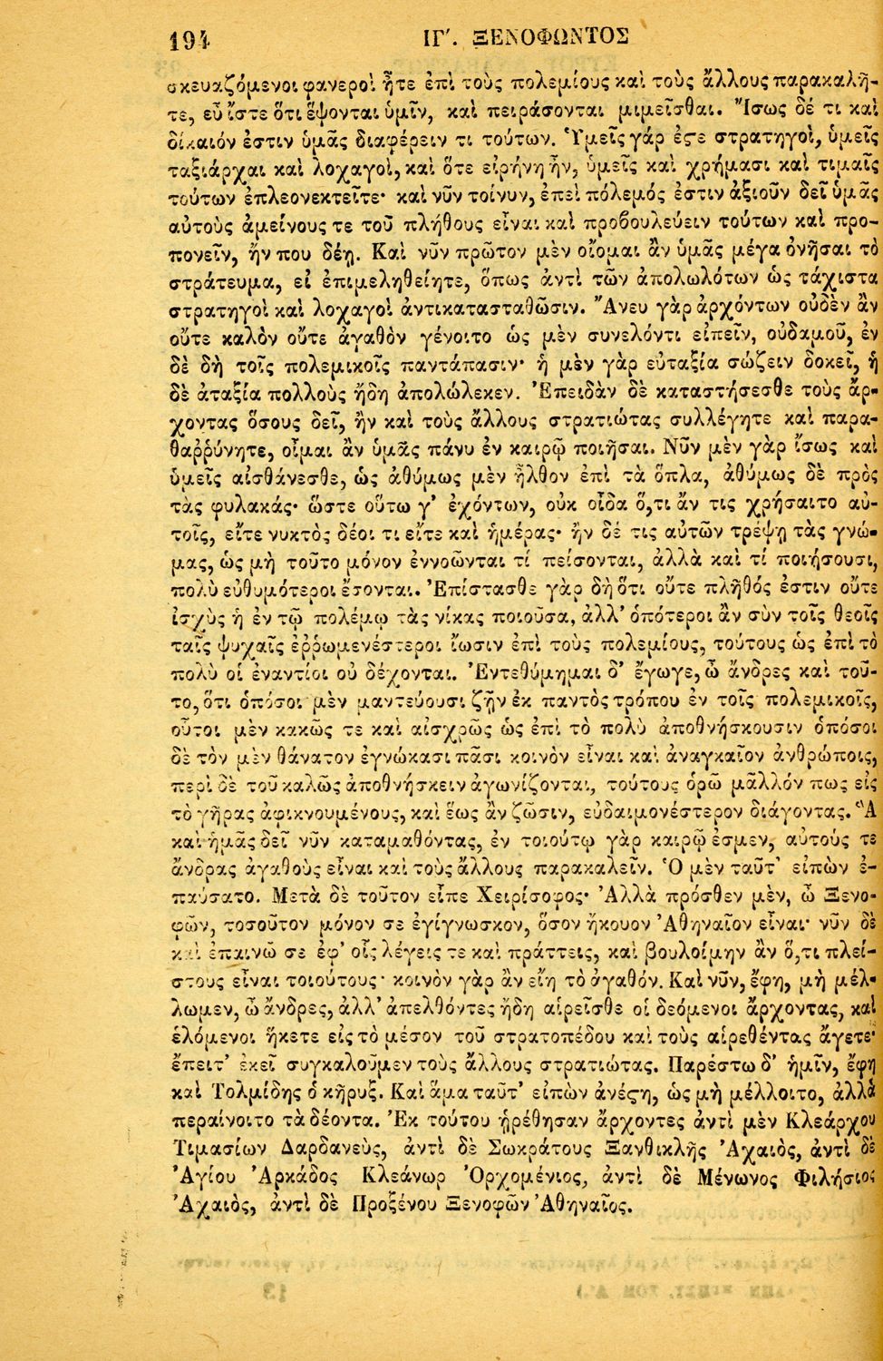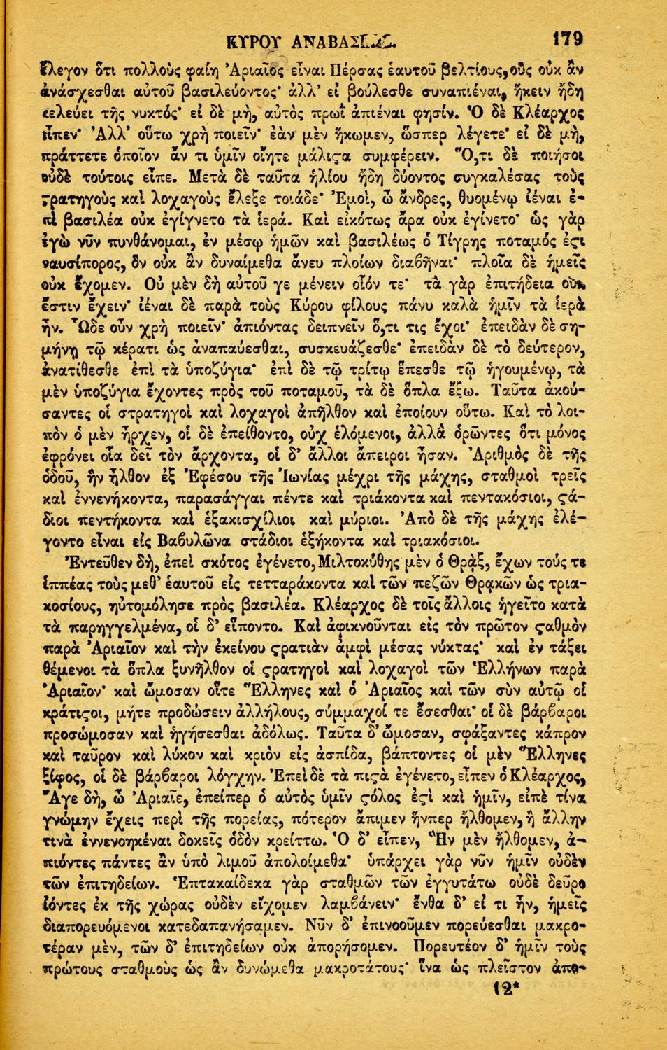 Σχολικό εγχειρίδιο Αρχαίων Ελληνικών για τα Ελληνικά Σχολεία και Παρθεναγωγεία που περιλαμβάνει αποσπάσματα από τα έργα του Ξενοφώντα Ελληνικά και Κύρου Παιδεία και λεξικολογικές παρατηρήσεις.