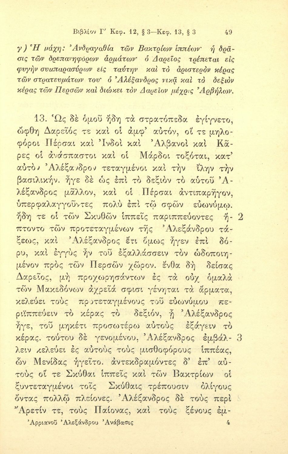 Σχολικό εγχειρίδιο Αρχαίων Ελληνικών Γ΄ Γυμνασίου που περιλαμβάνεται εισαγωγή σχετικά με την εποχή του Αρριανού, τη ζωή και το έργο του αποσπάσματα από το Αλεξάνδρου Ανάβασις, ερμηνευτικές σημειώσεις, εικόνες,