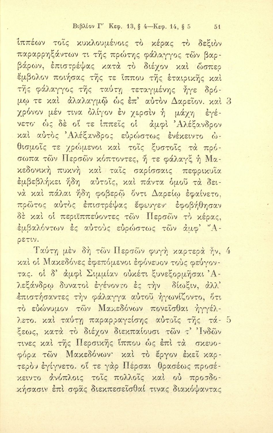 Σχολικό εγχειρίδιο Αρχαίων Ελληνικών Γ΄ Γυμνασίου που περιλαμβάνει το έργο του Αρριανού Αλεξάνδρου Ανάβασις, εισαγωγή στη βιογραφία και εργογραφία του Αρριανού, λεξιλόγιο και λεξιλογικά σχόλια, εικόνες στρατιωτών και όπλων της περιόδου.